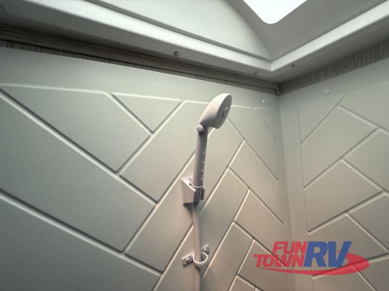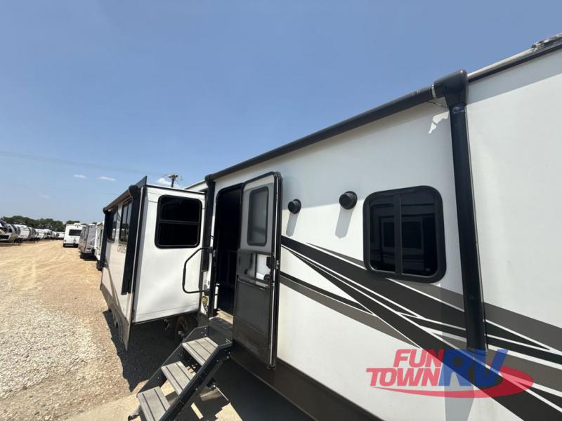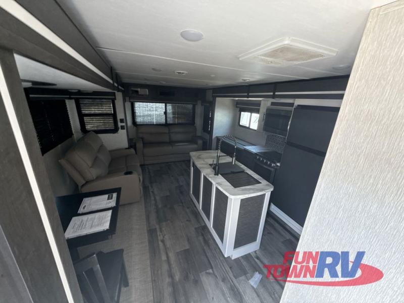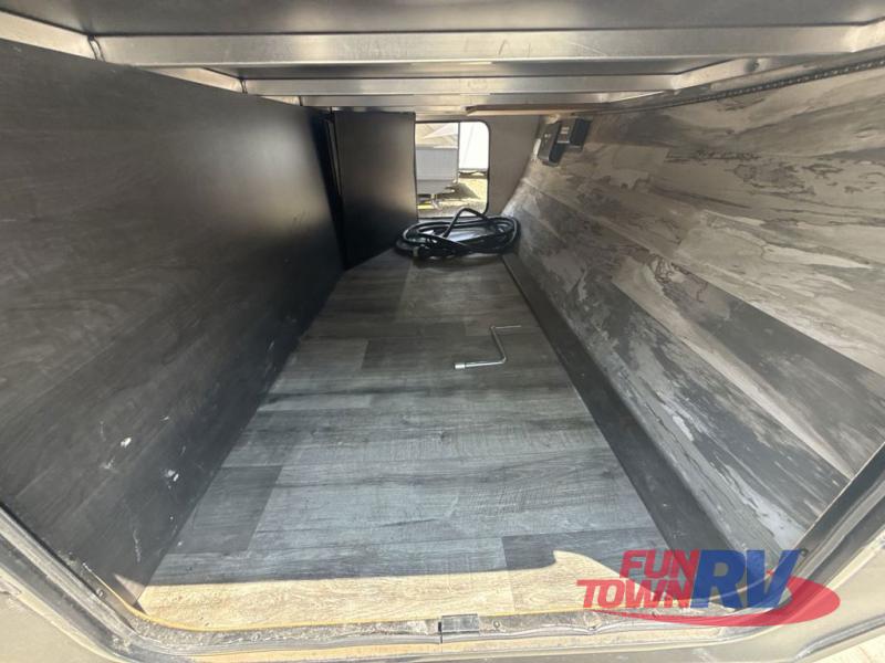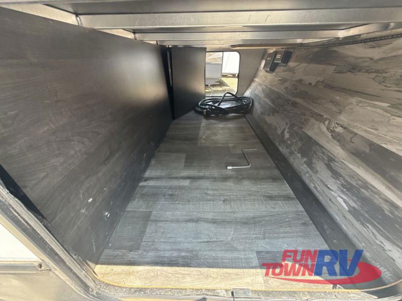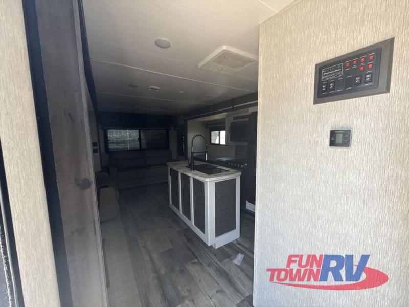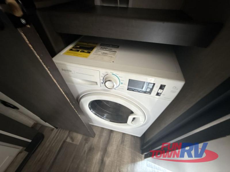 Enjoy the camping lifestyle as it should be; comfortable and convenient, with high-end features as a bonus touch! The dual opposing slides will create an open floorplan, and the kitchen island will bring the whole room together. Your crew will find seating space on the tri-fold sofa, the U-shaped dinette, and the theatre seats that have a great view of the 50" TV TV lift and fireplace. You will appreciate two pantries, with one pantry including space to add an optional washer and dryer to make wash day easier than ever. The full bath includes a 30" x 36" shower with a skylight for more standing space and natural light, and the front private bedroom will provide a great night's rest with its king bed!