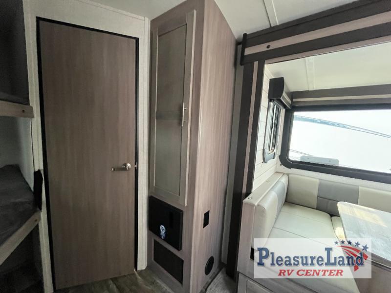 From the front private bedroom with a king bed and a slide out, to the rear corner bath and double-size bunks, you will love everything about this travel trailer. When you wake up in the morning you can prepare breakfast on the exterior camp kitchen, and if it's raining outside, the glass top range indoors will get the job done. There is also a stainless steel microwave for quick meals, and the wardrobe/pantry can store paper goods and the kids' cereal. Play a game of cards around the U-shaped dinette before heading off to bed in the front private bedroom!