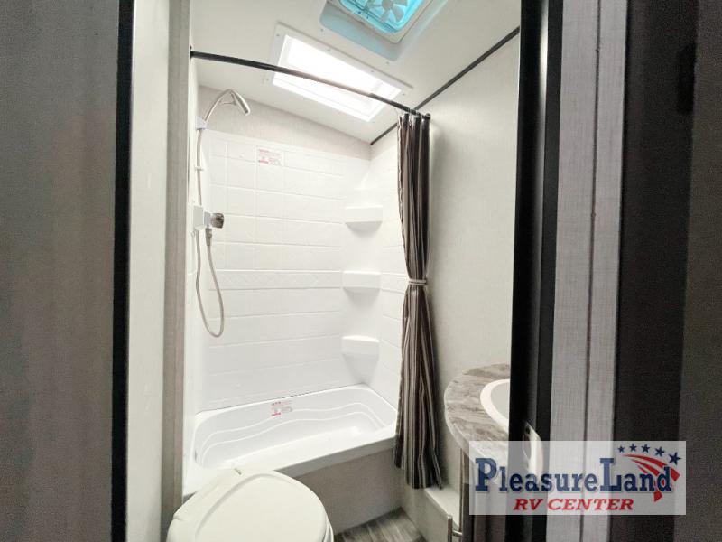 With any Sunset Trail travel trailer by CrossRoads RV, the interior offers a stainless steel farmhouse single bowl sink with a cover, solid surface countertops in the kitchen, a 12 volt refrigerator, USB ports in the bedroom and main area, and a Connexx entertainment TV with soundbar for inside enjoyment. Also included is the Extreme Weather package with maximum insulation with reflective foil, a 30,000 BTU furnace, and a 2" heat duct in the enclosed underbelly for four seasons of traveling. And the Blade Air system offers 20% more airflow and re-engineered components on the A/C.  The HyperDeck flooring is water resistant, fiberglass reinforced and has polypropylene layers. Make your lightweight and comfortable RV decision today!