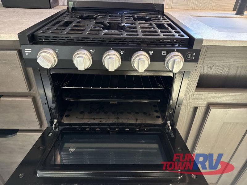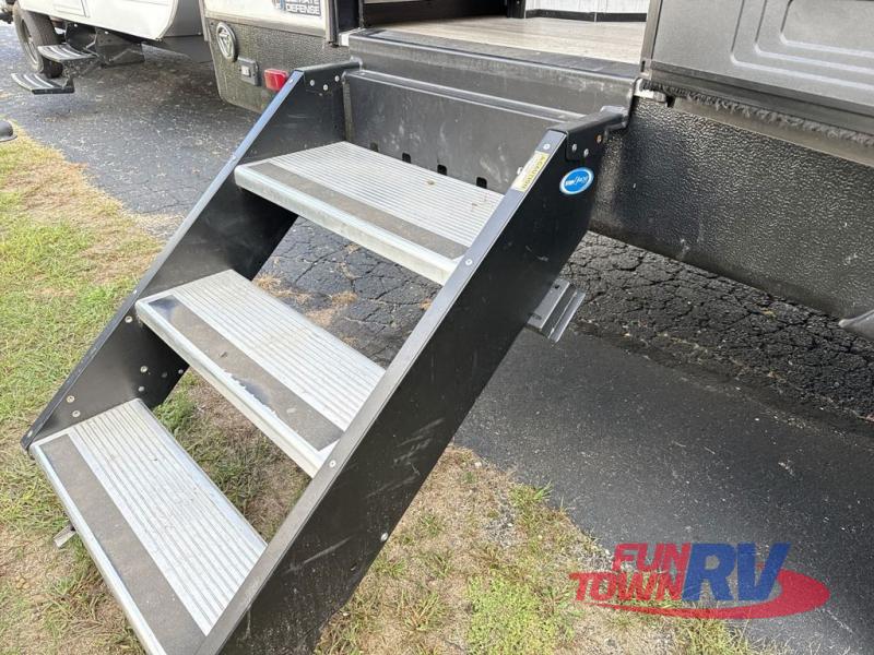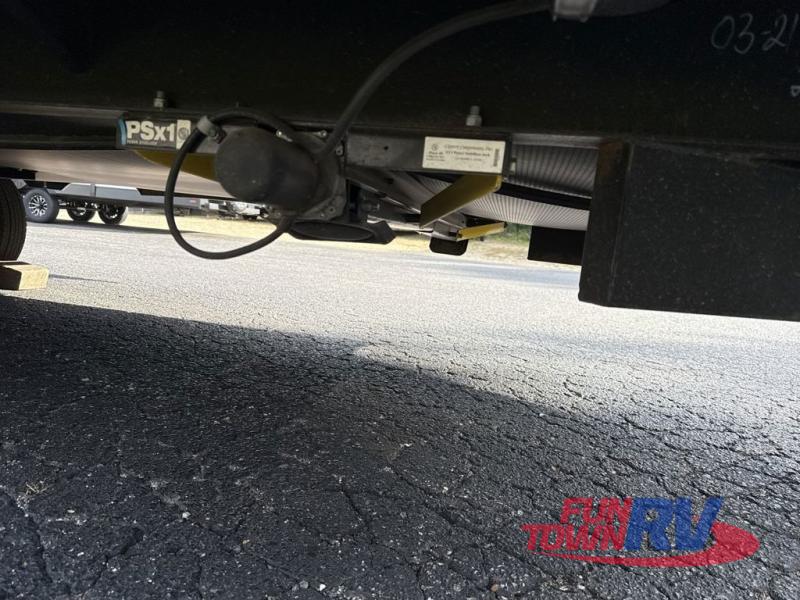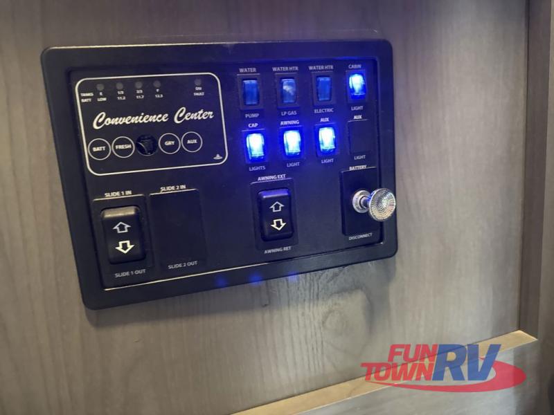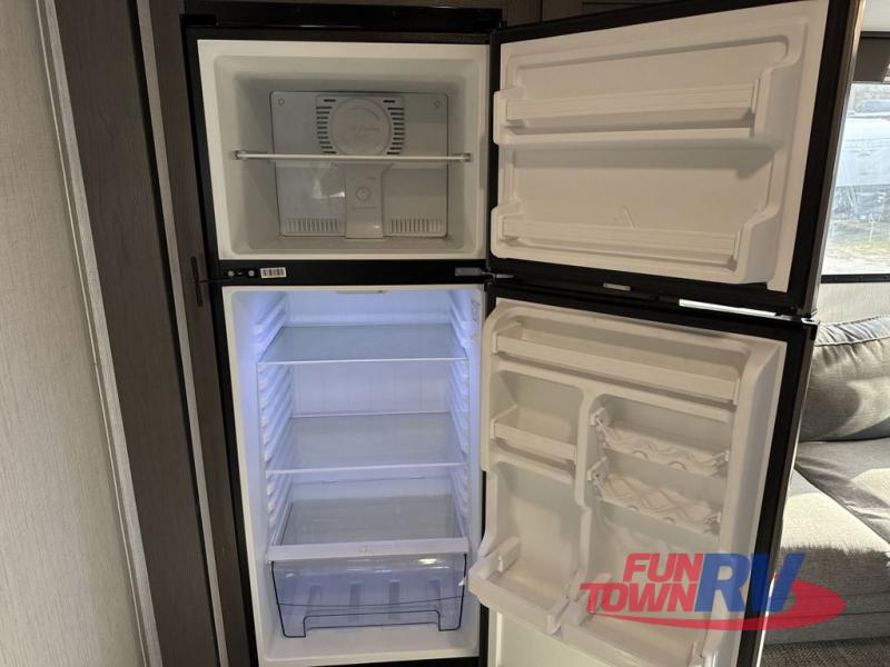 This is the perfect couple's trailer with space for an overnight guest on the sofa within the large slide out. You will enjoy the sliding king bed in the front bedroom, plus there are dual wardrobes for your clothes. The kitchen includes a counter with two stools for breakfast in the morning, two pantries, plus a 10.7 cu. ft. double door refrigerator. A rear corner full bath on board allows you to freshen up each day, and the exterior full belly storage system will be great for fishing poles, lawn chairs, and luggage!