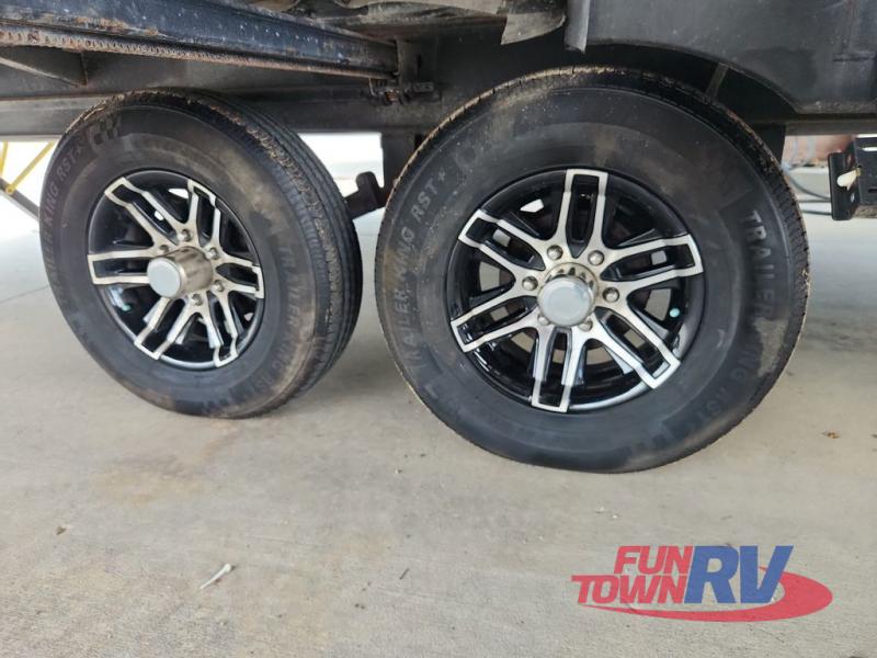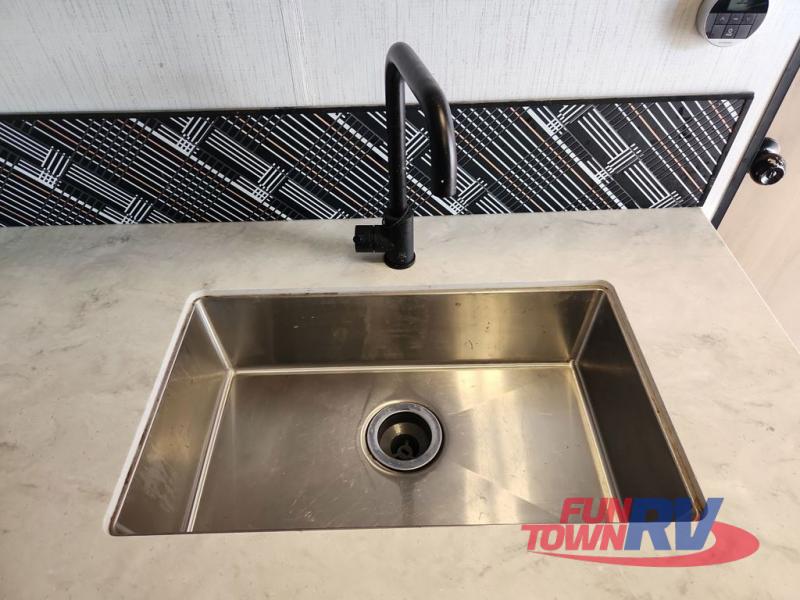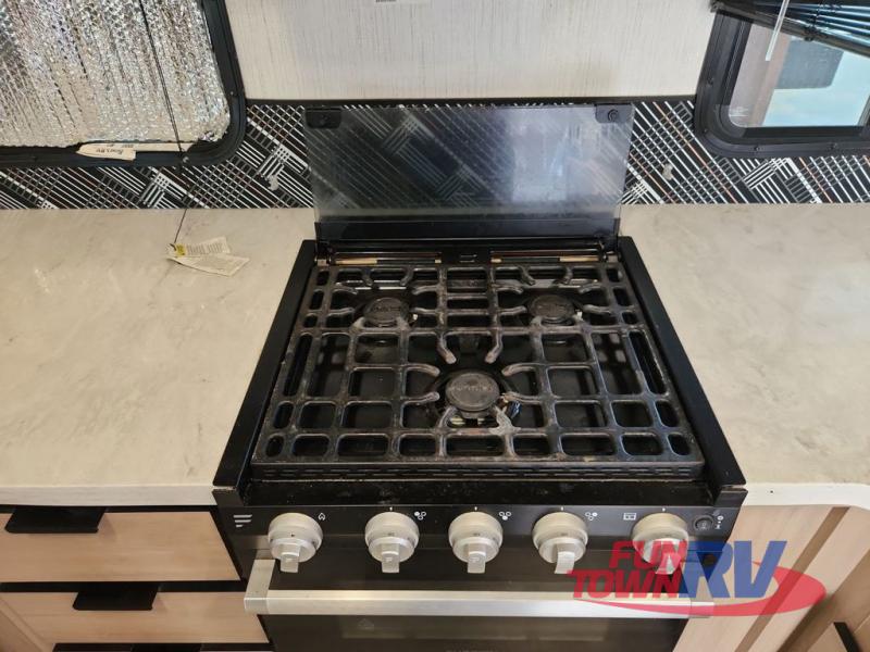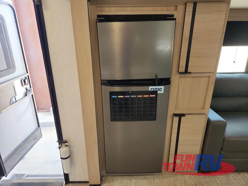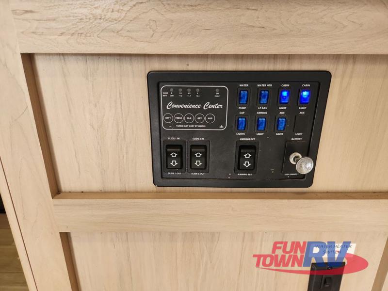 This travel trailer features dual opposing slides, providing you with tons of space to relax. You can add an optional LED TV to the rear entertainment center, and the two sofas here will provide seating and sleeping space. The kitchen is fully packed with a three burner cooktop, a microwave oven, plus a 10.7 cu. ft. double-door refrigerator for perishables. A walk-through bath will create a front master bedroom you are sure to love. Here, you'll find a king bed and dual bedroom wardrobes to keep your clothes wrinkle-free. Start camping today!