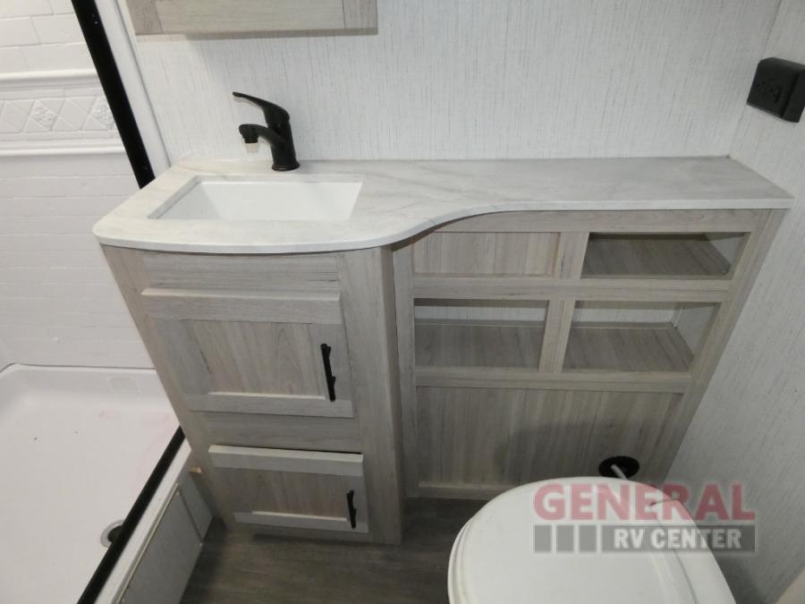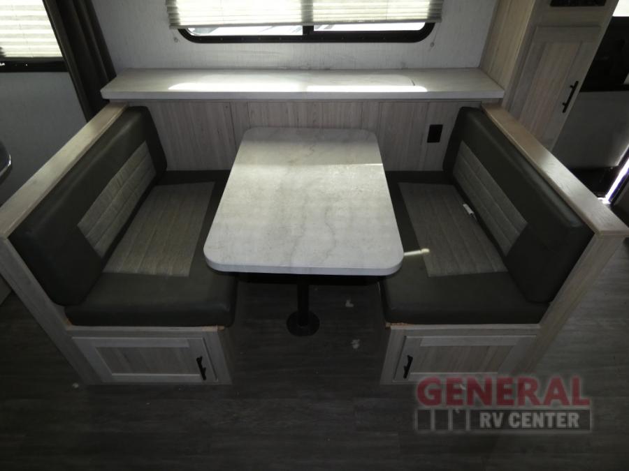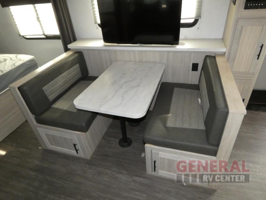 Start camping in luxury with this travel trailer! The patent pending king bed sliding system offers a comfortable place to lay your head at night, as well as for your furry friend with the pet palace underneath it. A friend or two can tag along in the fun too and sleep on the booth dinette once converted. Everyone's bellies will stay full with a three burner cooktop and feel clean with the shower in the rear corner bathroom. It's easy to access your outdoor gear from the exterior full belly storage system!