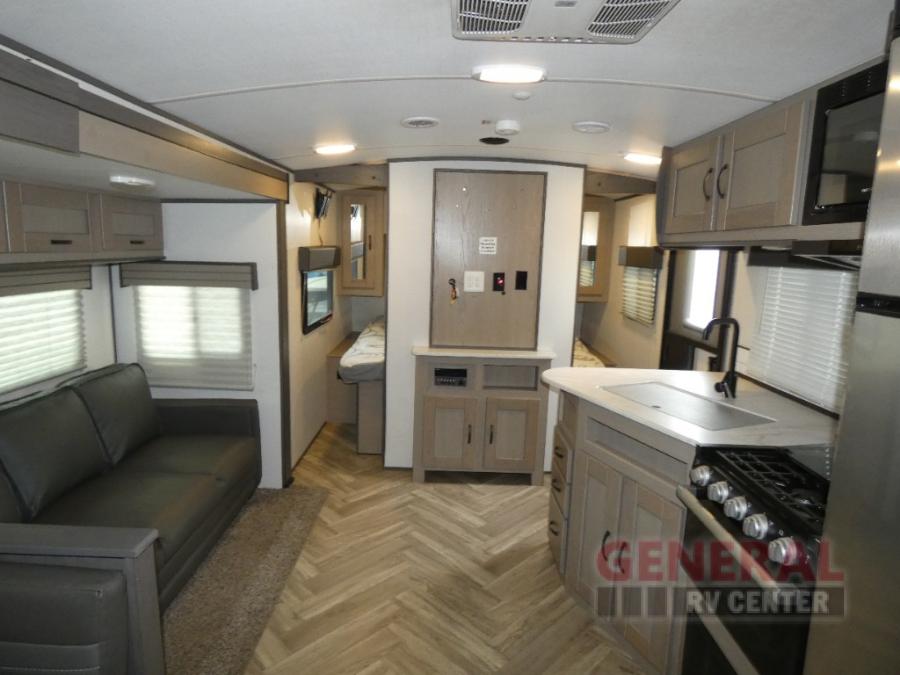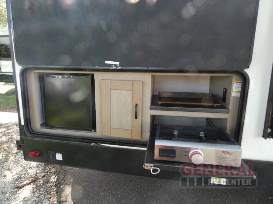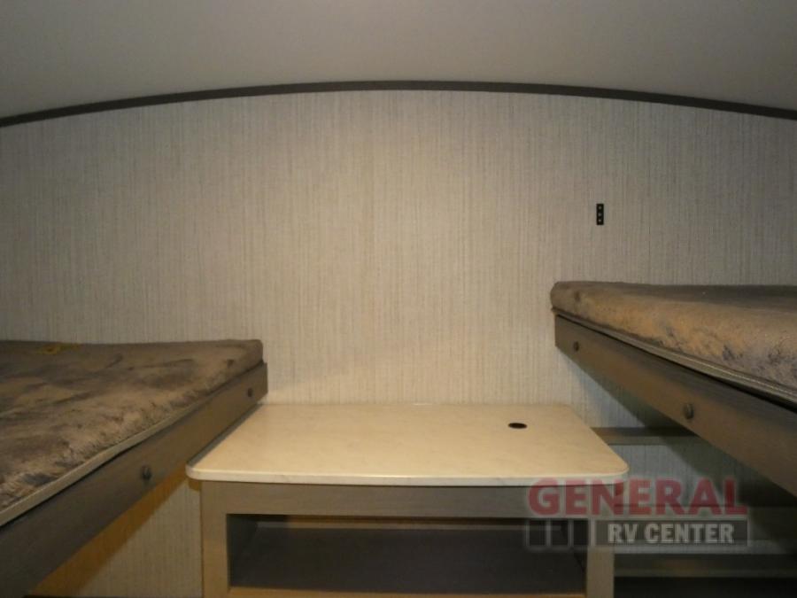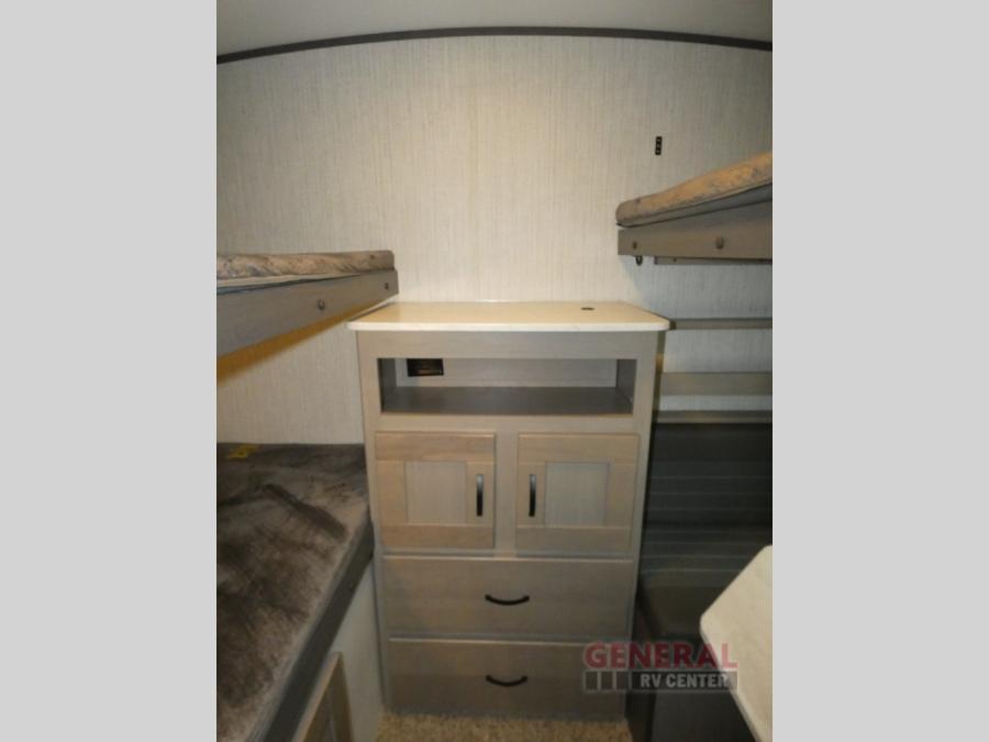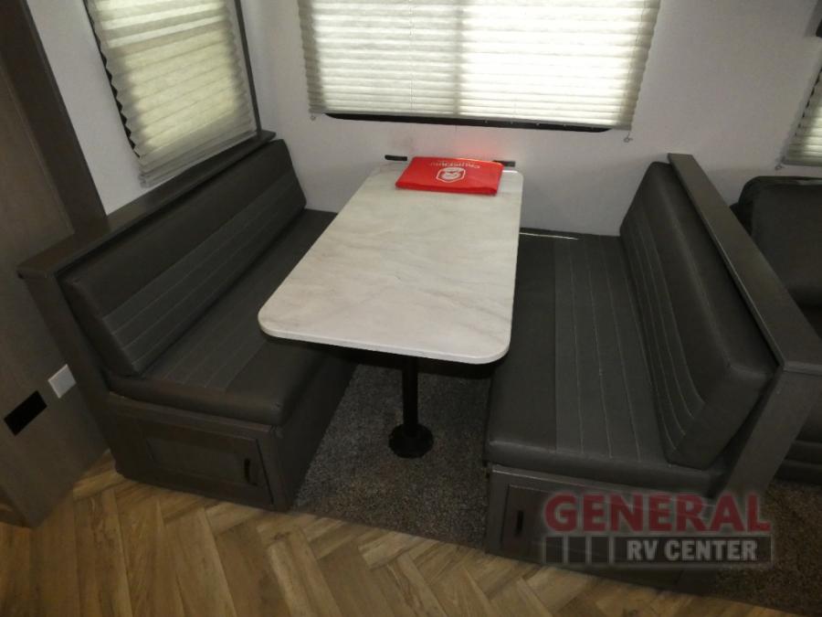 The kids or guests will love having their own privacy with the rear private bunkhouse in this travel trailer! The bunkhouse has a set of double bunk beds and a bunk above a dinette. The chef can prepare their best meals either indoors with the three burner cooktop or head to the outside kitchen and grill some burgers on the two burner cooktop. The sofa and booth dinette slide creates more walking around space, comfortable places to eat and socialize, and even extra sleeping spaces. The front private bedroom has a patent pending king bed sliding system with a pet palace underneath for your furry friend and wardrobes on either side to keep your clothes looking nice!