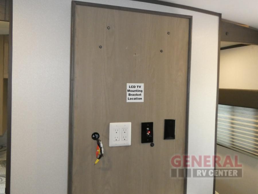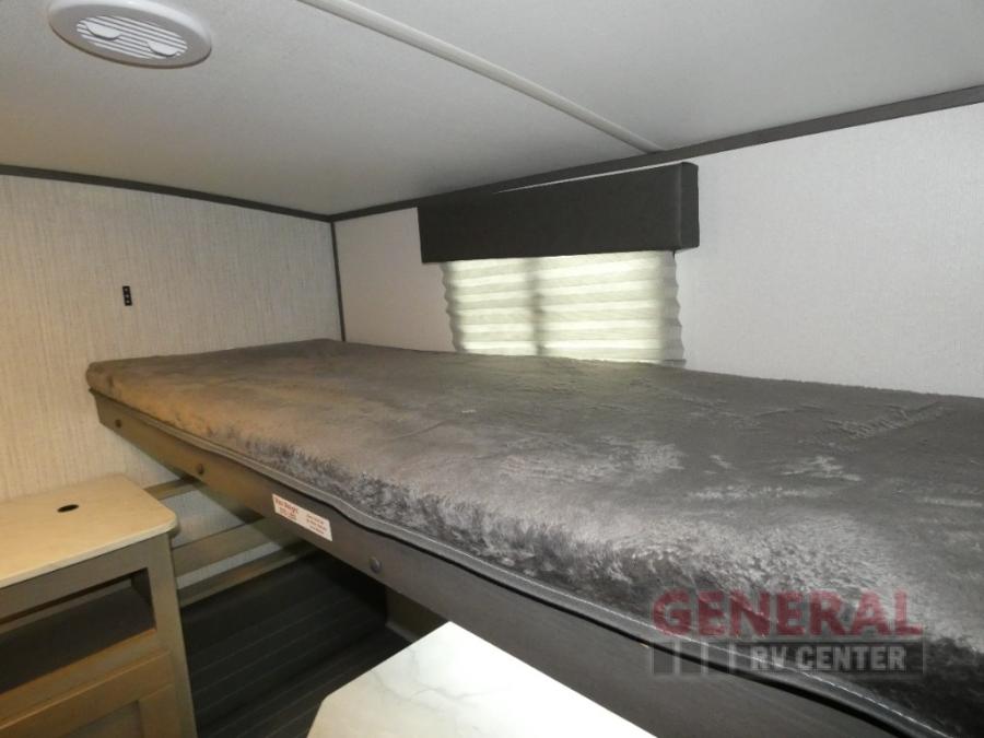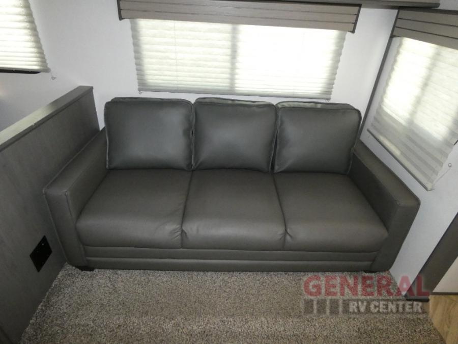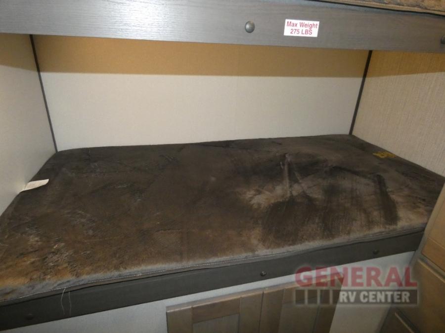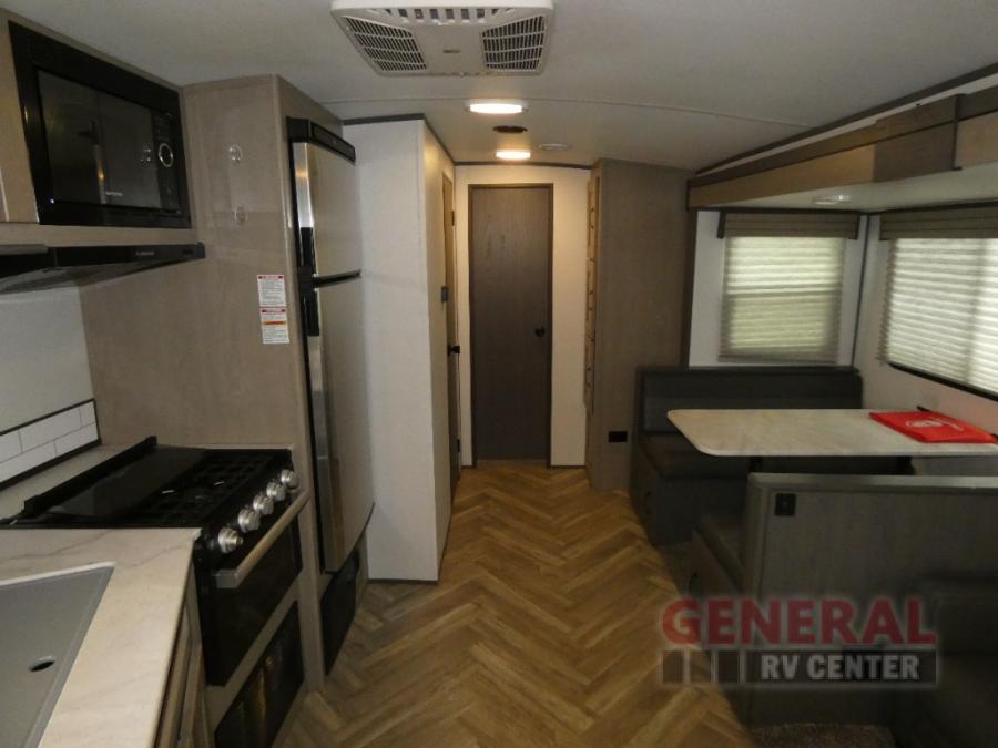 The kids or guests will love having their own privacy with the rear private bunkhouse in this travel trailer! The bunkhouse has a set of double bunk beds and a bunk above a dinette. The chef can prepare their best meals either indoors with the three burner cooktop or head to the outside kitchen and grill some burgers on the two burner cooktop. The sofa and booth dinette slide creates more walking around space, comfortable places to eat and socialize, and even extra sleeping spaces. The front private bedroom has a patent pending king bed sliding system with a pet palace underneath for your furry friend and wardrobes on either side to keep your clothes looking nice!