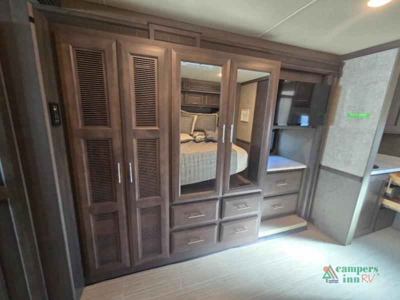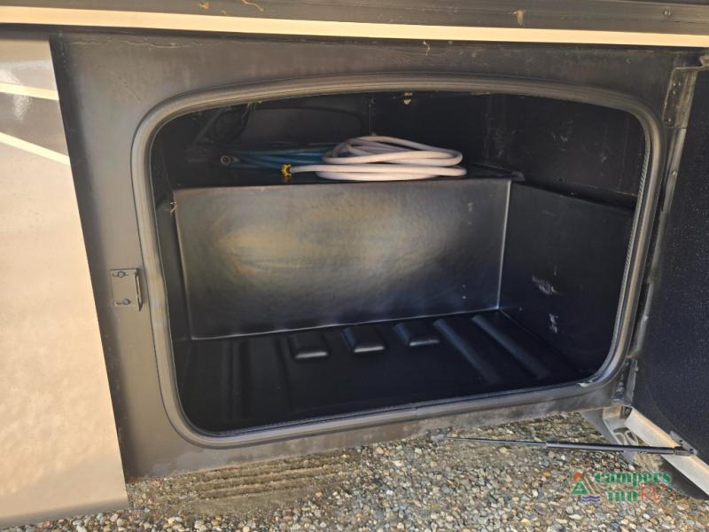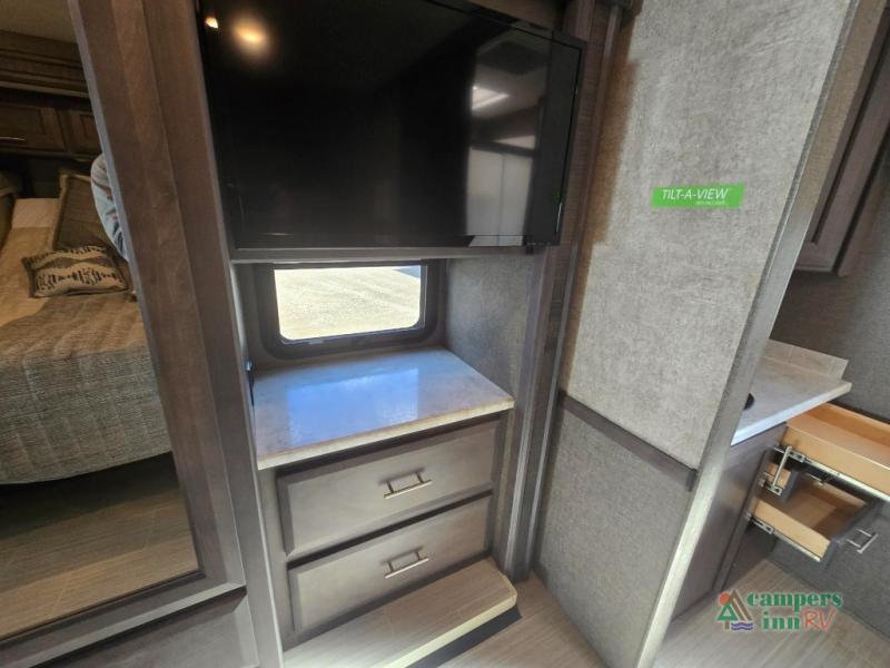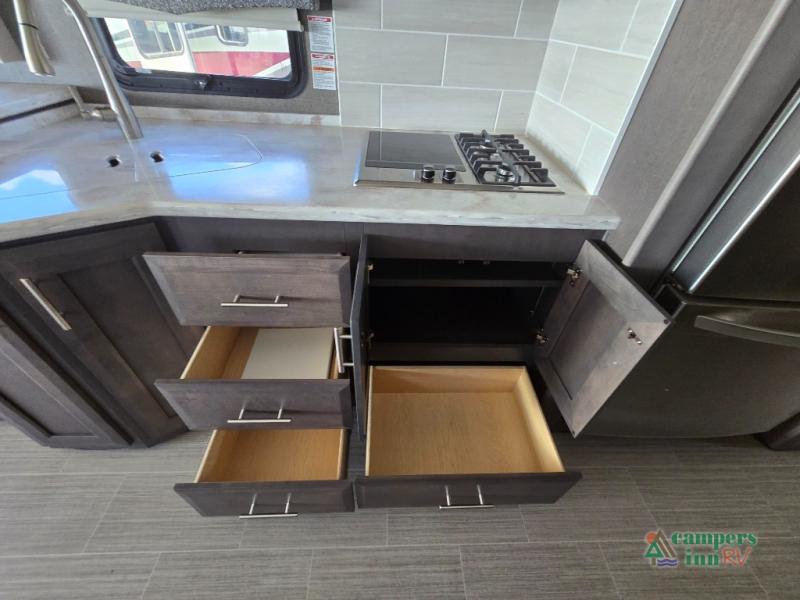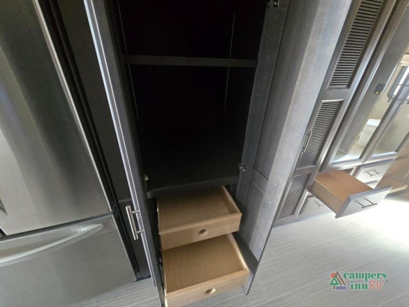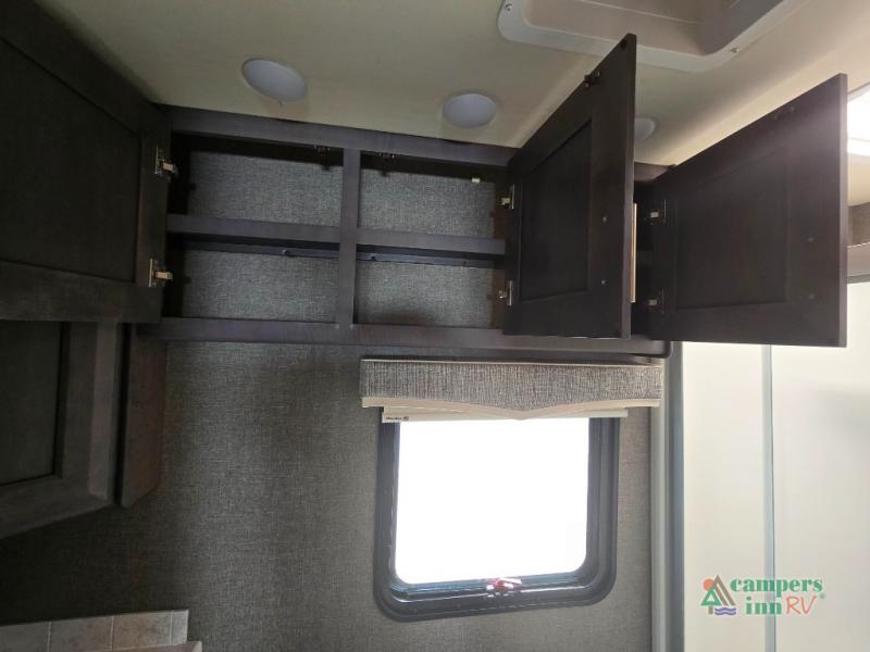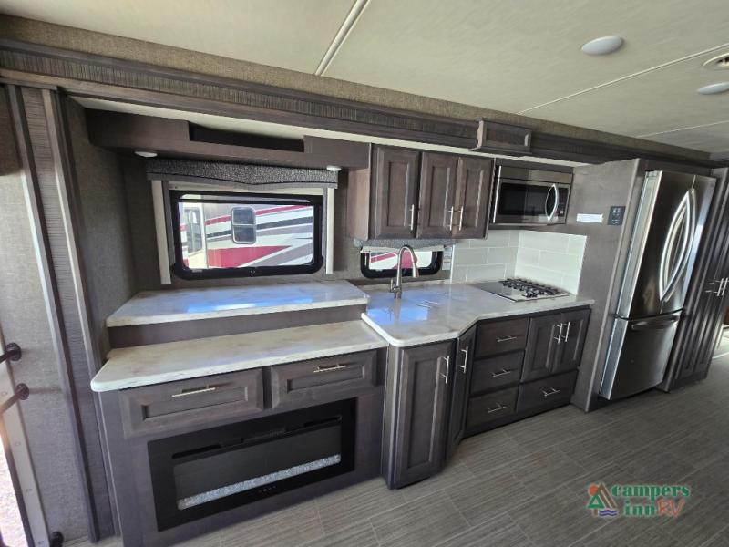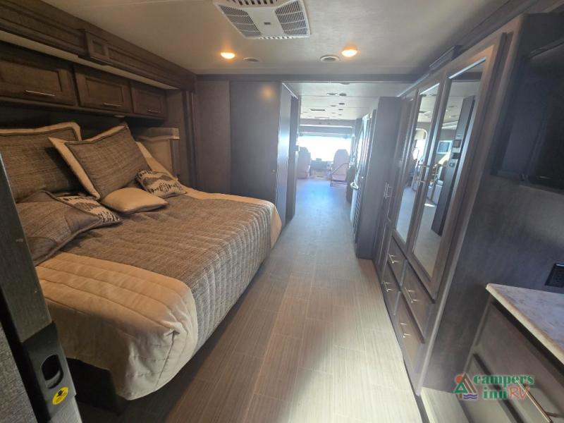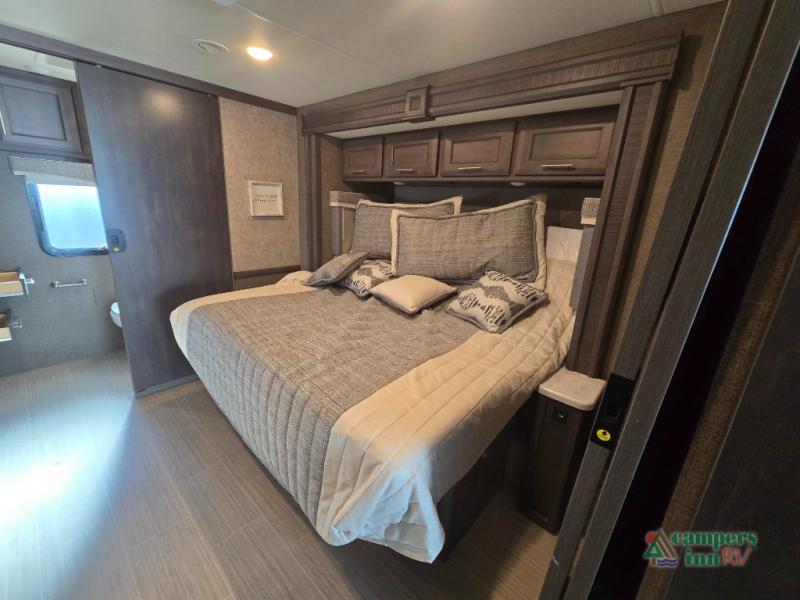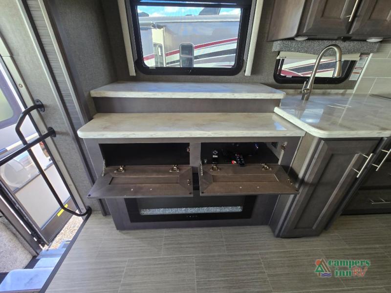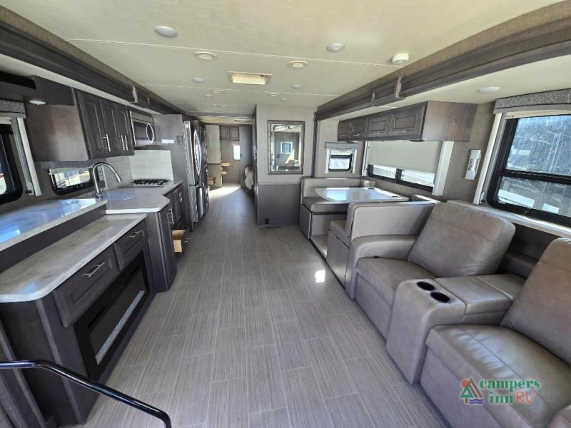 This motorhome features a full-wall slide, plus two additional slides for maximum space and comfort. You can sleep seven people thanks to the drop-down overhead bunk, the king bed slide out, and the furniture in the main living area. The fireplace and retractable 49" TV will make it feel a little more like home, and the residential kitchen is any chef's dream. Since this model includes a bath and a half, your guests won't have to wait in line, and you'll find plenty of storage space throughout for everyone's belongings.