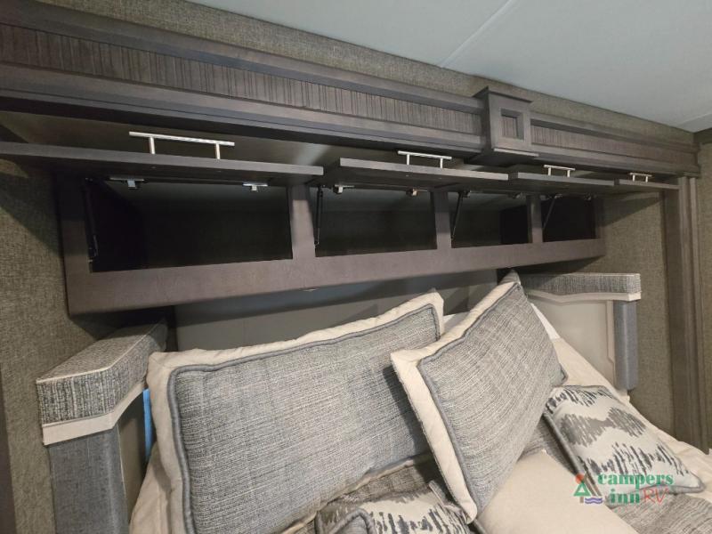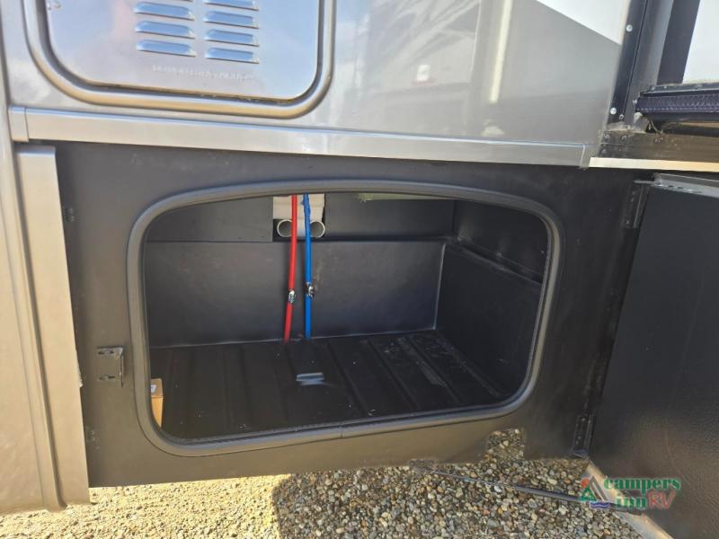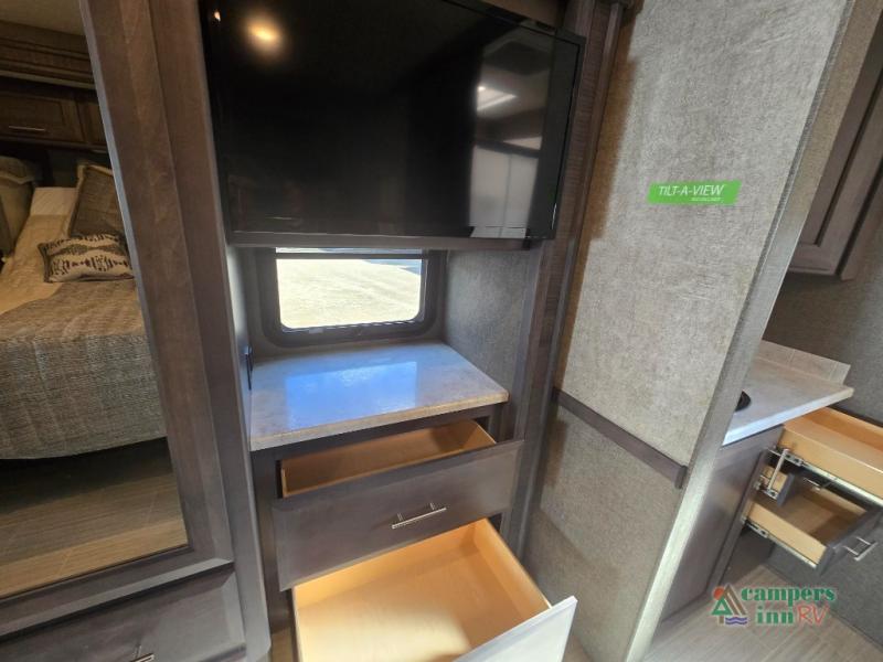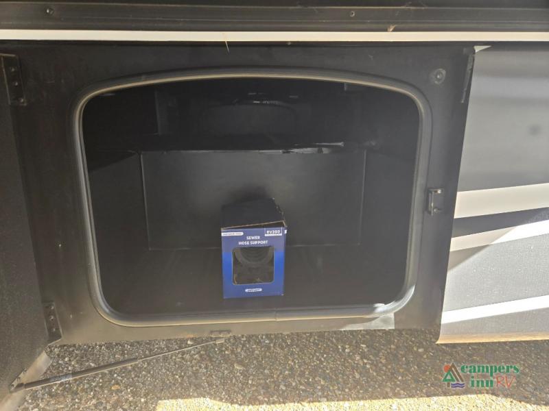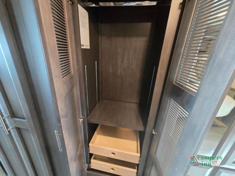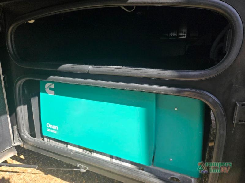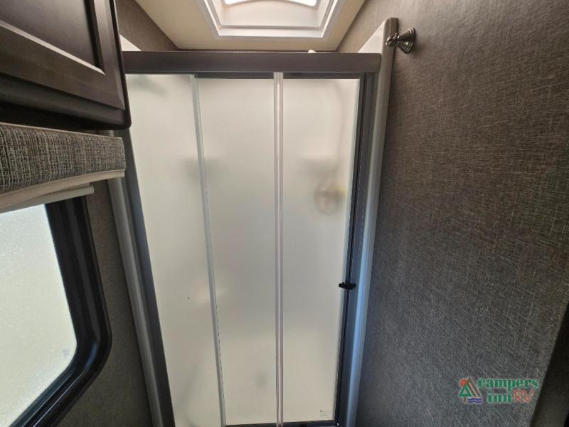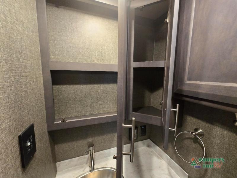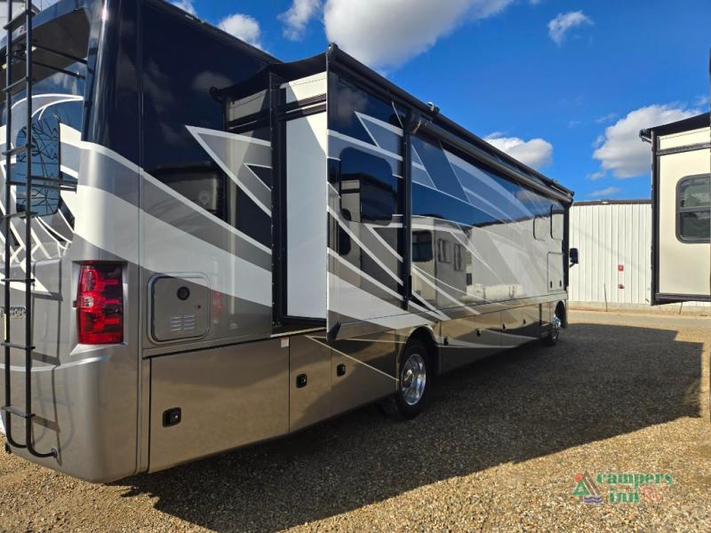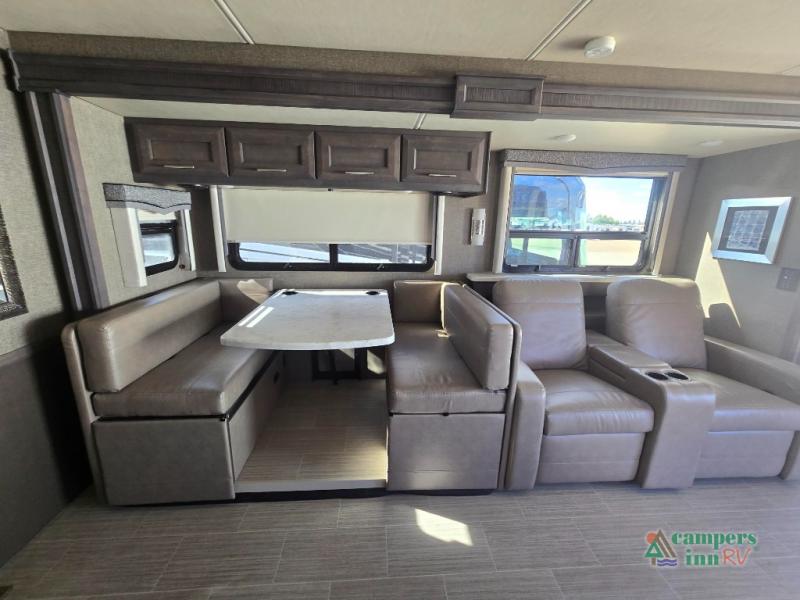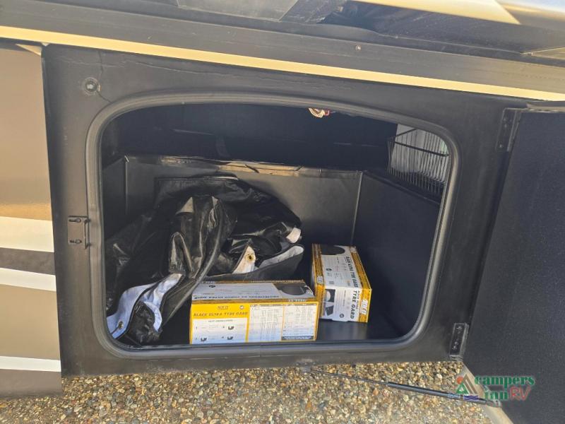 This motorhome features a full-wall slide, plus two additional slides for maximum space and comfort. You can sleep seven people thanks to the drop-down overhead bunk, the king bed slide out, and the furniture in the main living area. The fireplace and retractable 49" TV will make it feel a little more like home, and the residential kitchen is any chef's dream. Since this model includes a bath and a half, your guests won't have to wait in line, and you'll find plenty of storage space throughout for everyone's belongings.