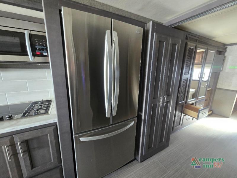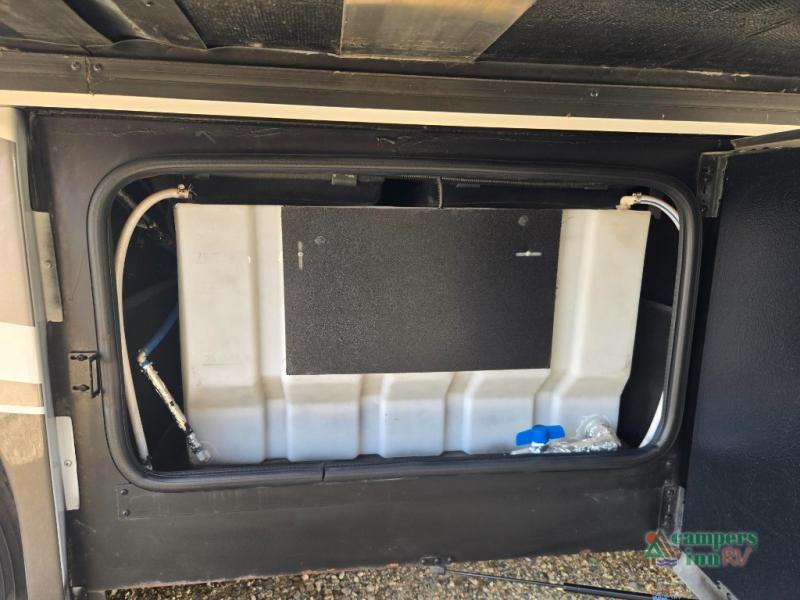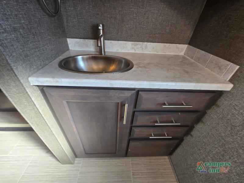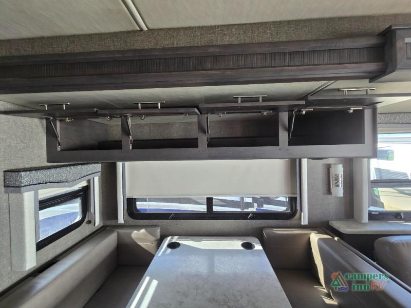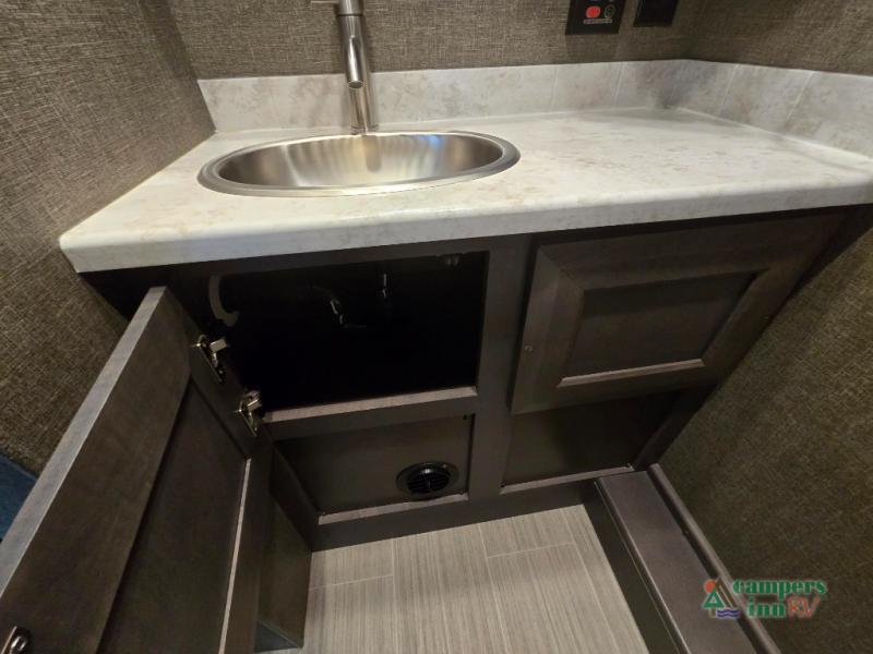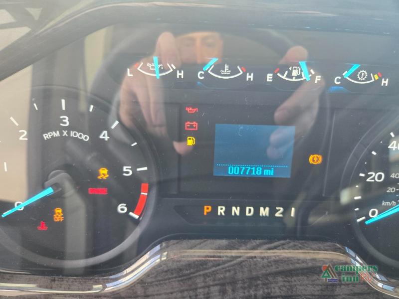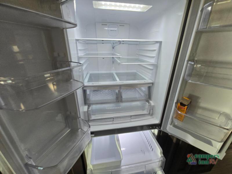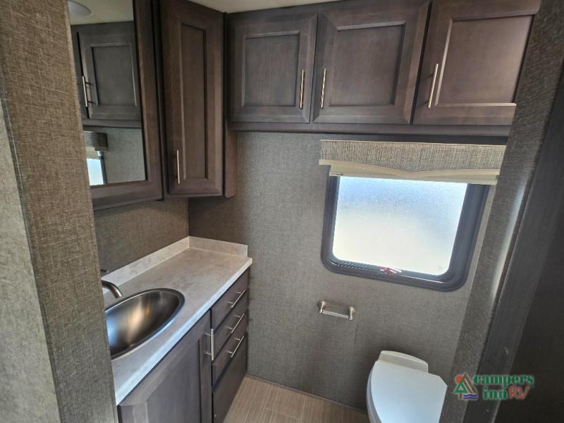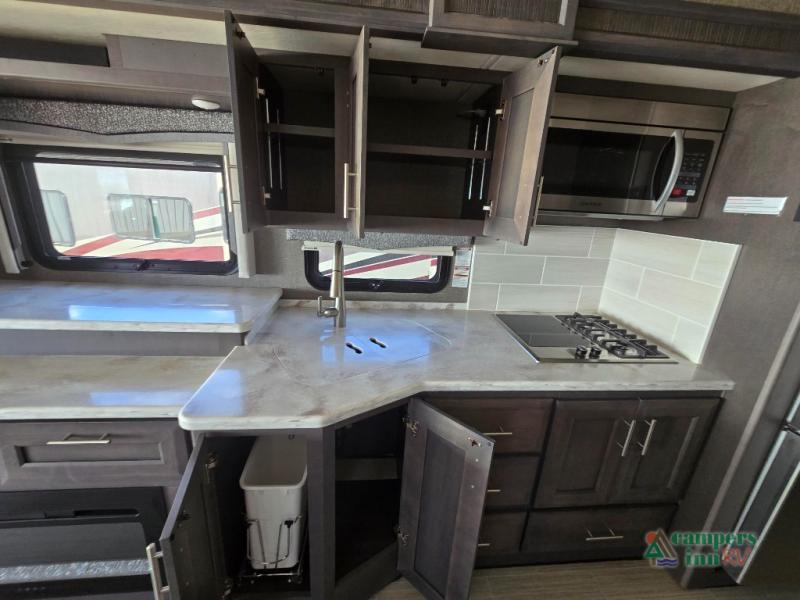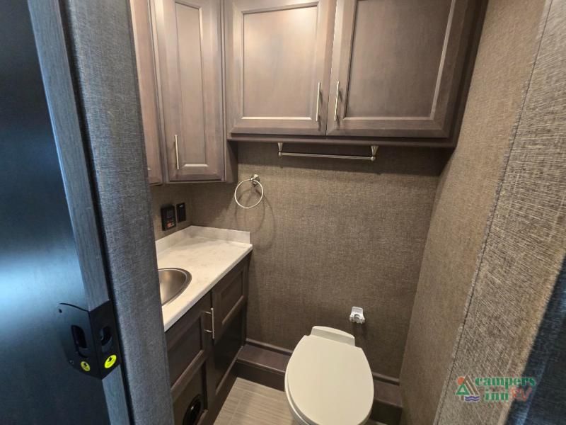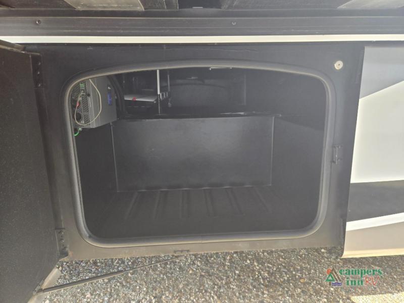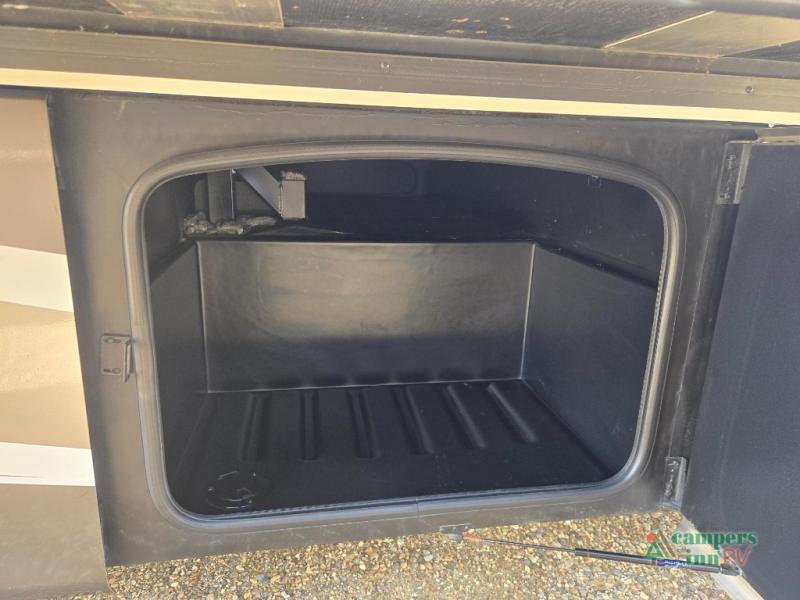 This motorhome features a full-wall slide, plus two additional slides for maximum space and comfort. You can sleep seven people thanks to the drop-down overhead bunk, the king bed slide out, and the furniture in the main living area. The fireplace and retractable 49" TV will make it feel a little more like home, and the residential kitchen is any chef's dream. Since this model includes a bath and a half, your guests won't have to wait in line, and you'll find plenty of storage space throughout for everyone's belongings.