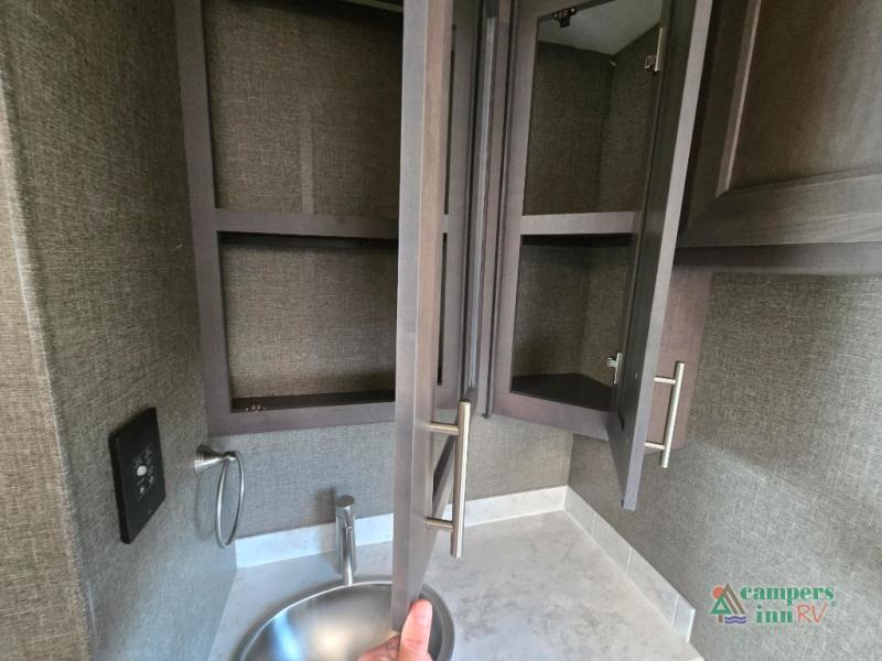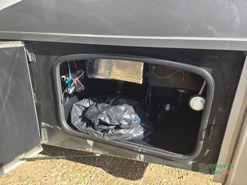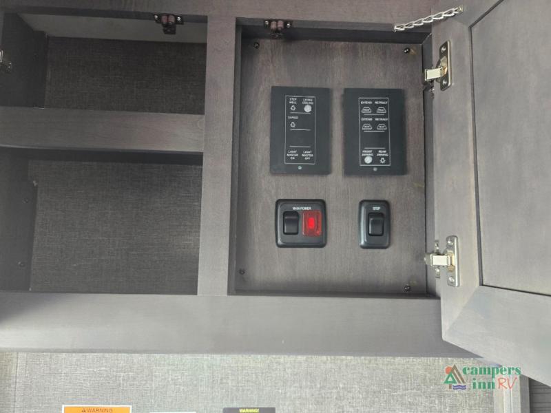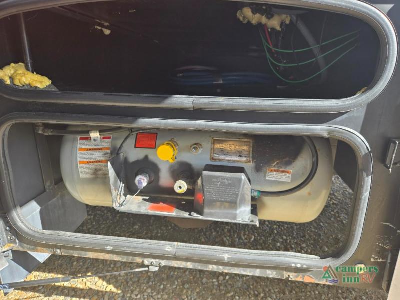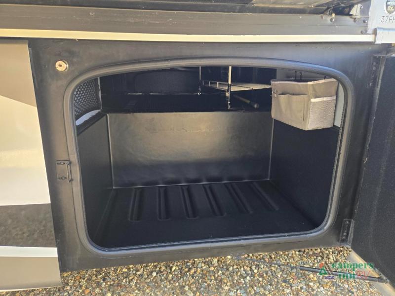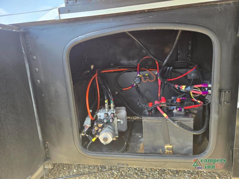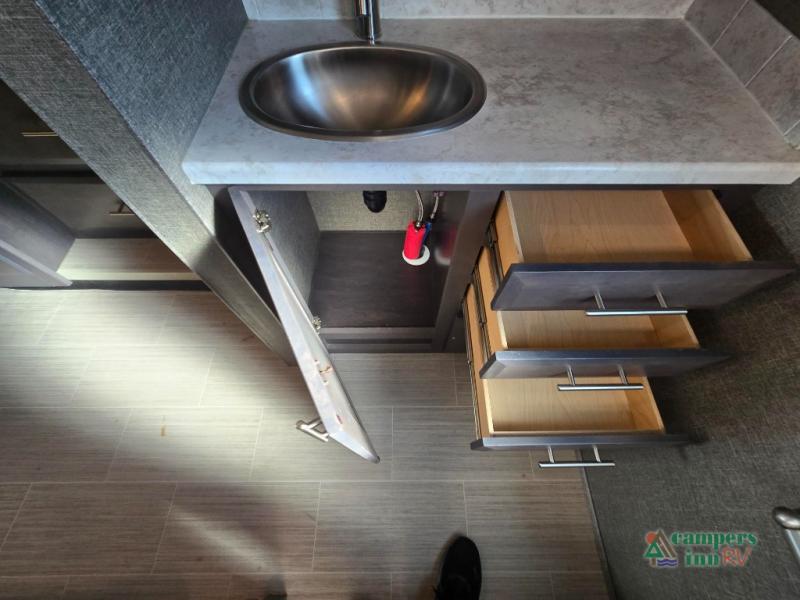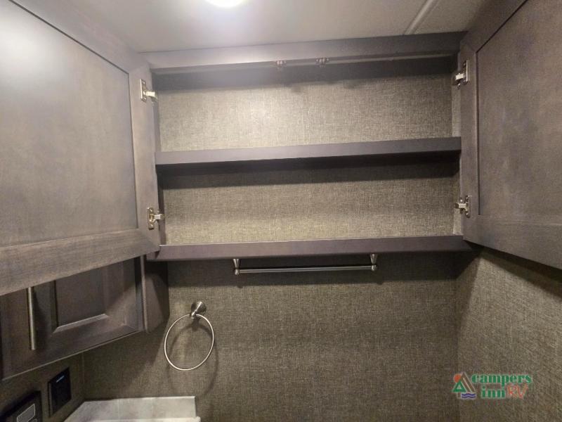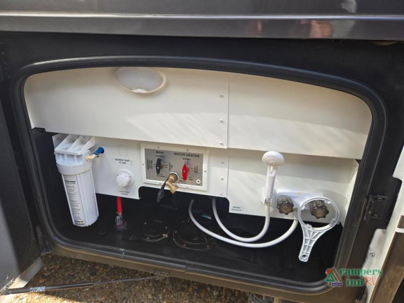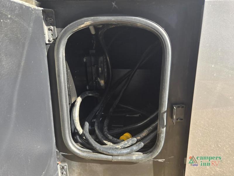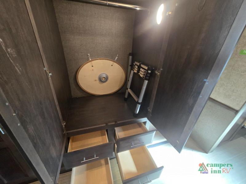 This motorhome features a full-wall slide, plus two additional slides for maximum space and comfort. You can sleep seven people thanks to the drop-down overhead bunk, the king bed slide out, and the furniture in the main living area. The fireplace and retractable 49" TV will make it feel a little more like home, and the residential kitchen is any chef's dream. Since this model includes a bath and a half, your guests won't have to wait in line, and you'll find plenty of storage space throughout for everyone's belongings.