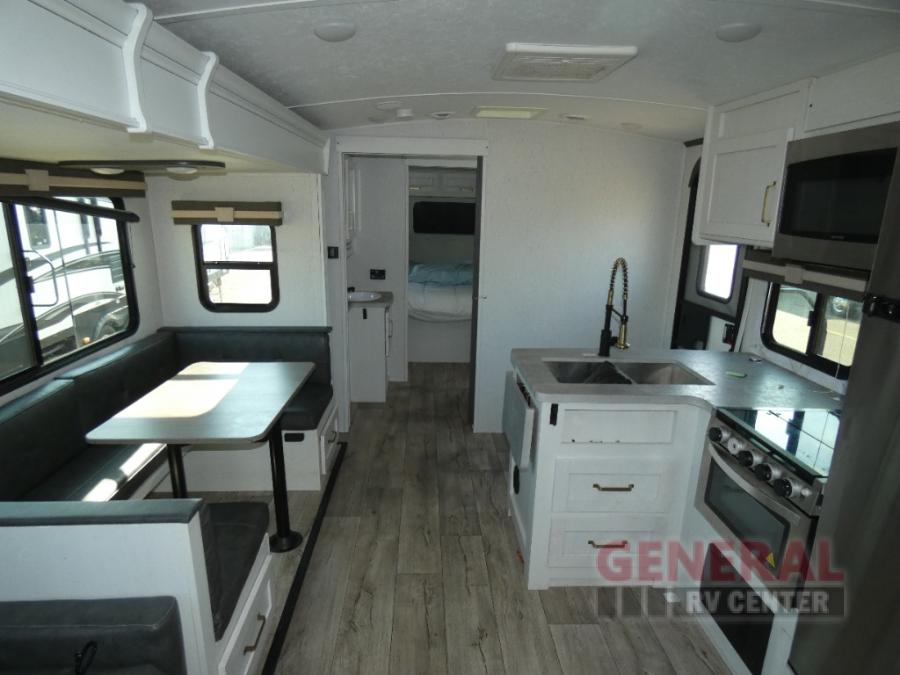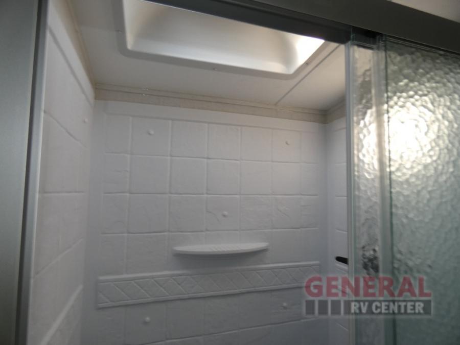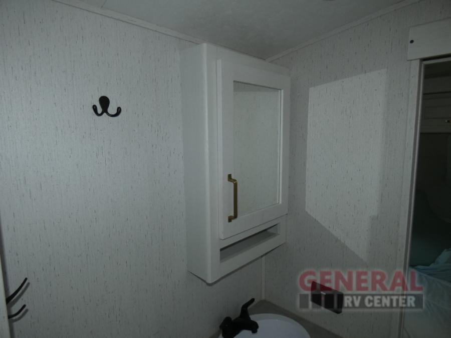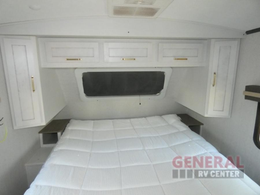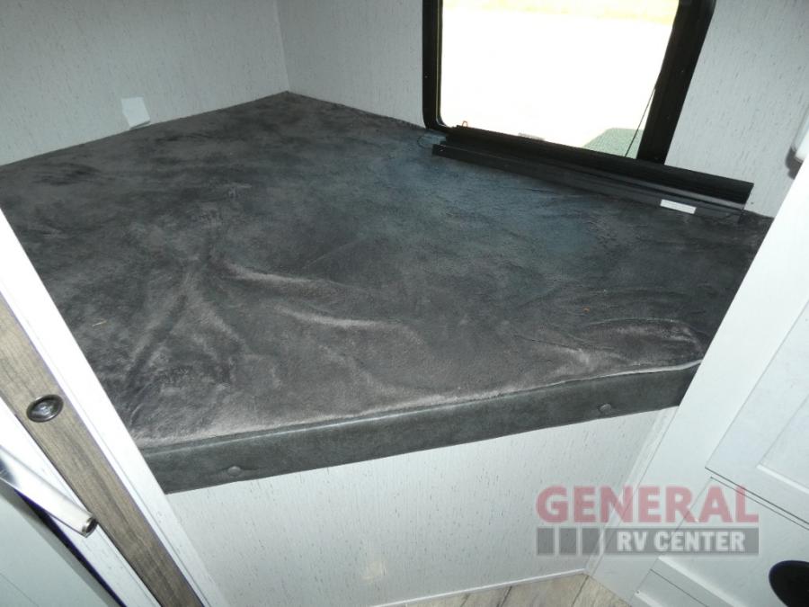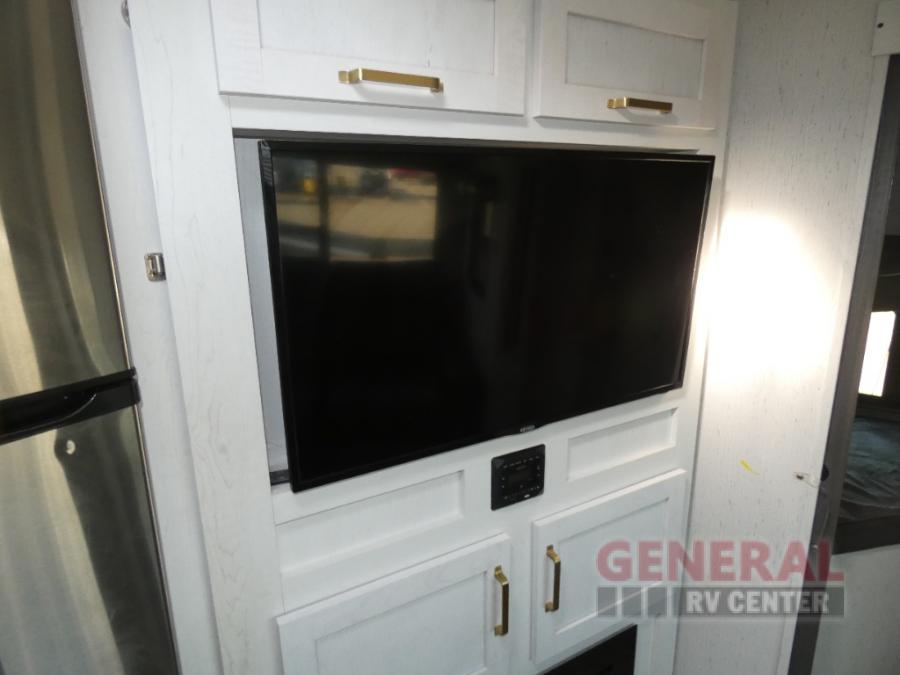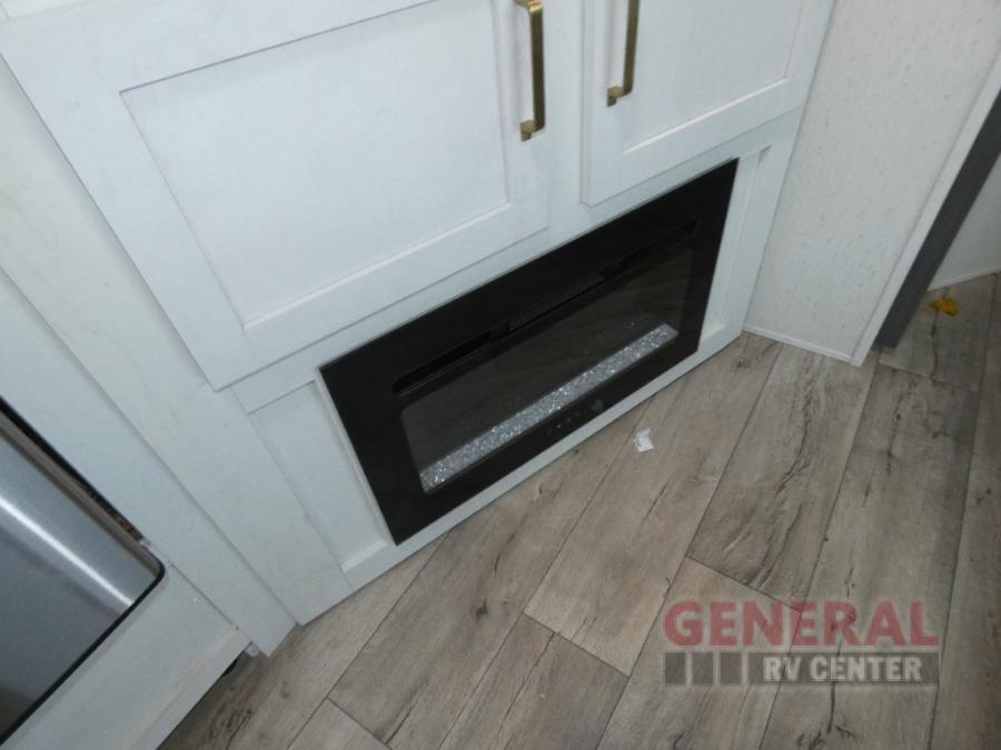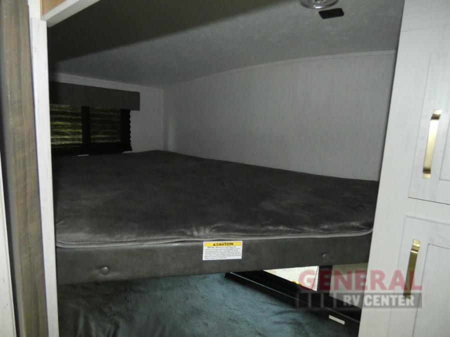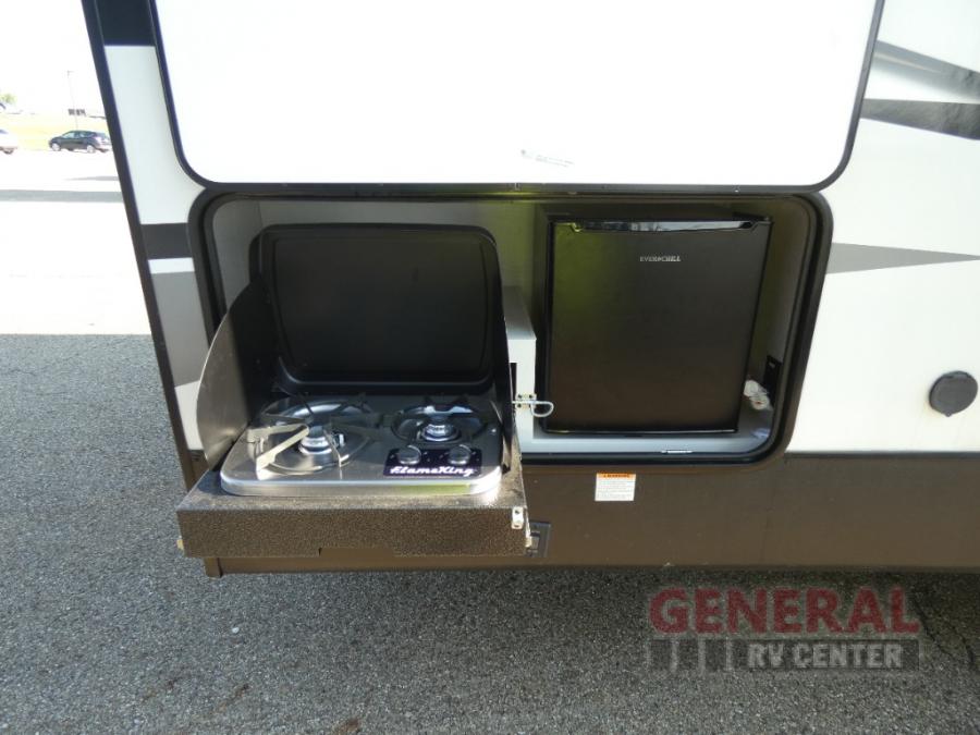 The family will love camping in this travel trailer! The kids can sleep in the rear private bunkhouse with the double-size bunk beds and store their clothes in the wardrobe. You will enjoy your own privacy with the front bedroom which has a king bed with wardrobes/nightstands on either side and an entrance into the walk-through bathroom. You will easily be able to prepare your best meals in the kitchen with the countertop extension, the 8 cu. ft. double door refrigerator, and the glass top three burner cooktop with a 17" oven, plus there is a pantry behind the hinged entertainment center which has a 40" LED TV to watch your favorite movies!
