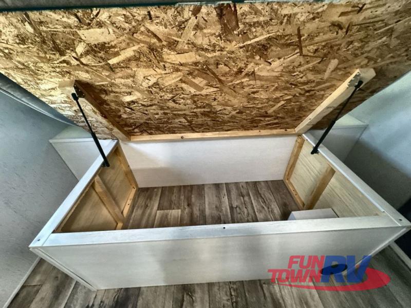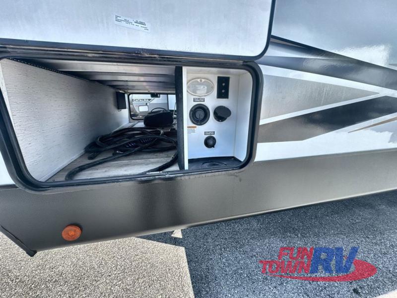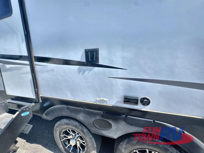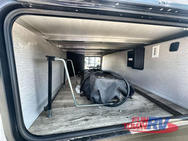 There are plenty of sleeping spaces for everyone in this travel trailer! From the rear private bunkhouse with a set of bunk beds along one side and a bunk bed above a sofa on the other to the front private bedroom with a king bed. You can even transform the tri-fold sofa and U-shaped dinette slide into extra sleeping spaces if needed. The walk-through bathroom has everything you will need to freshen up each morning. The chef will love cooking indoors with the glass top three burner cooktop with a 17" oven, yet may love cooking at the outdoor kitchen even more. Grab a snack from the walk-in pantry behind the entertainment center and watch your favorite movie on the 40" LED TV while a fire roars in the 30" glass fireplace!