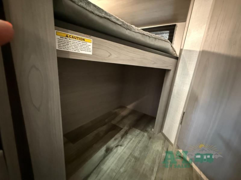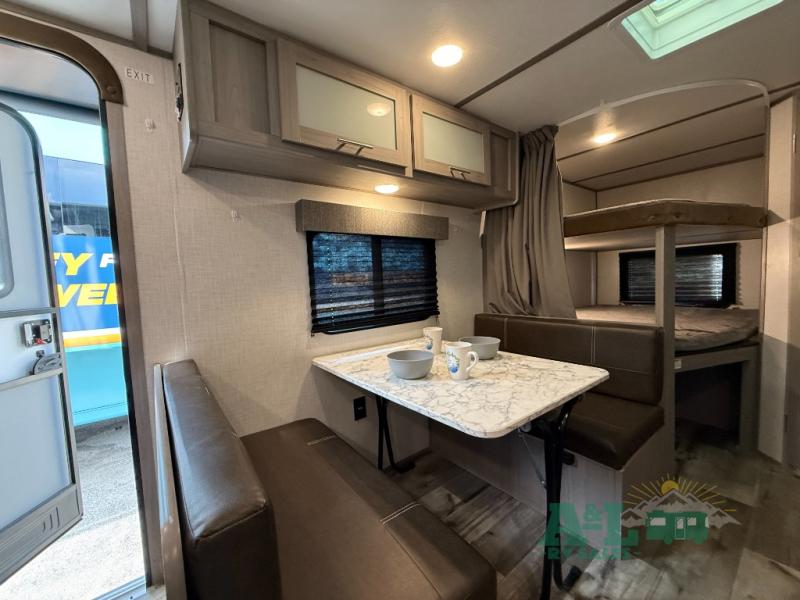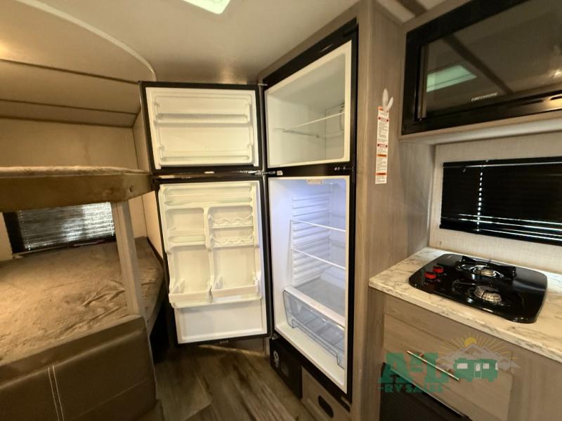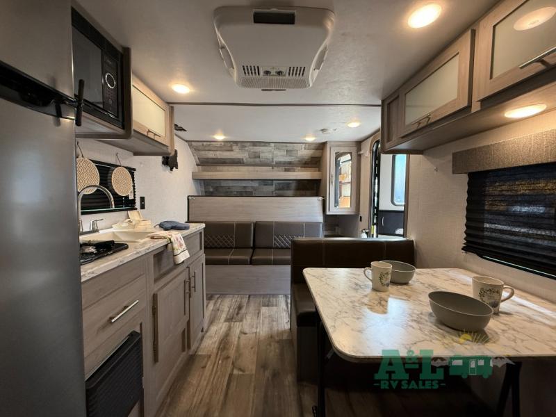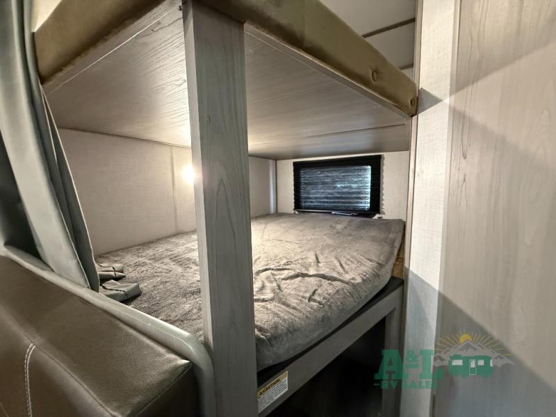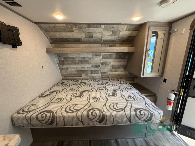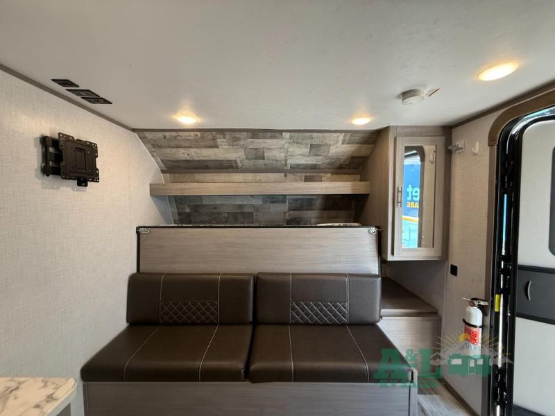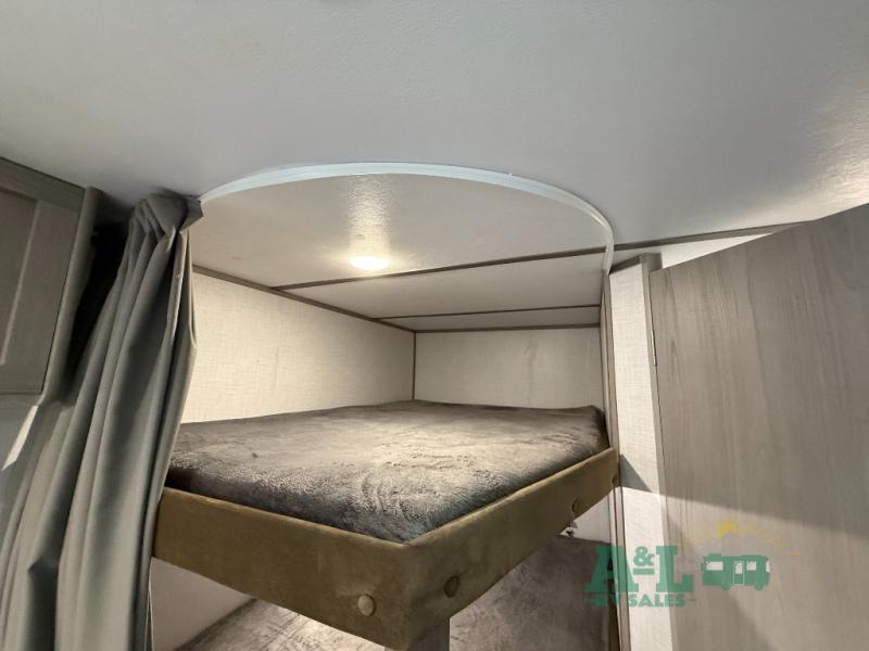 Camping trips to the lake are made cozy in this travel trailer that can sleep six people each night. The Murphy bed up front provides space to sleep at night, and in the morning you can fold it away to relax on the sofa. The kids are sure to love the bunk beds, and there is a booth dinette that can serve as additional sleeping space when it's not being use to dine at. This model includes an outdoor griddle with a refrigerator to prepare breakfast outdoors, and the 10' power awning with LED lights will provide an outdoor living space.