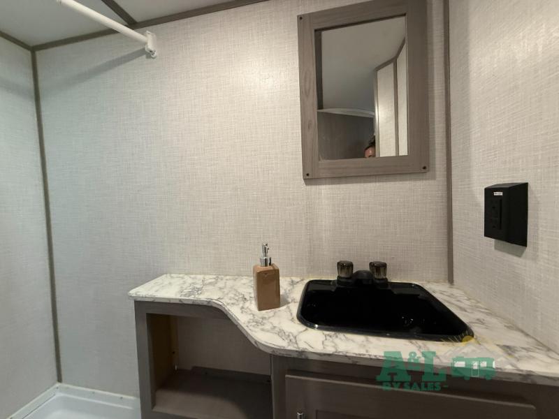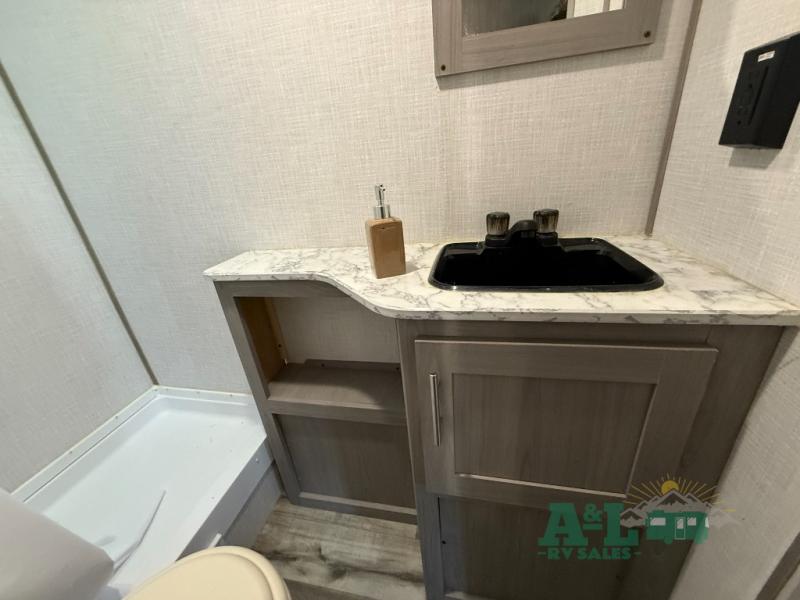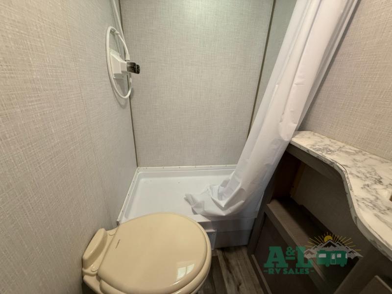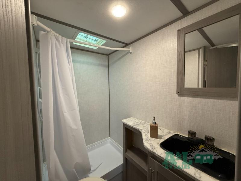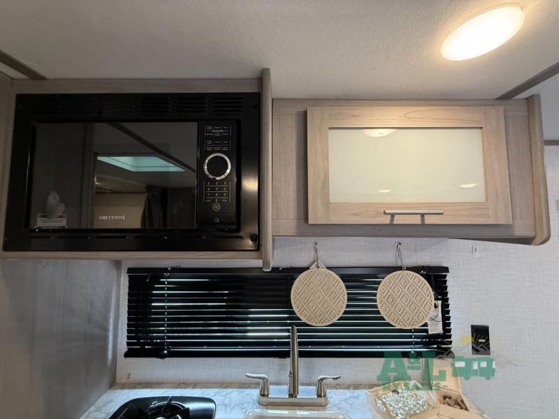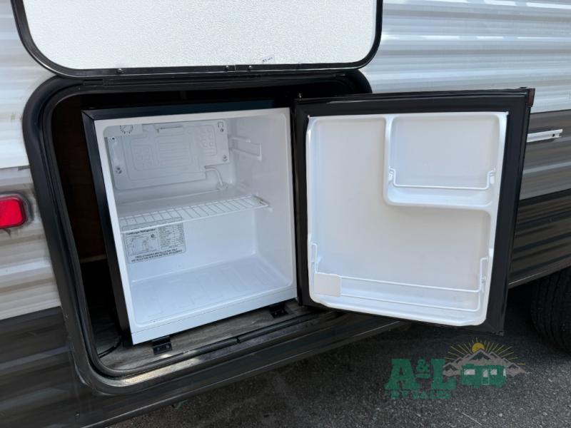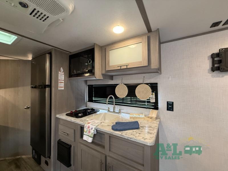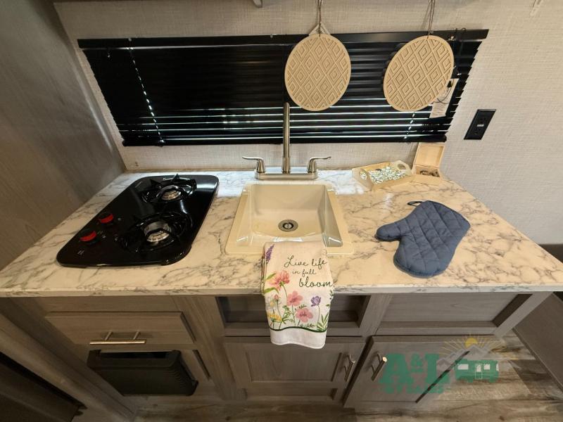Camping trips to the lake are made cozy in this travel trailer that can sleep six people each night. The Murphy bed up front provides space to sleep at night, and in the morning you can fold it away to relax on the sofa. The kids are sure to love the bunk beds, and there is a booth dinette that can serve as additional sleeping space when it's not being use to dine at. This model includes an outdoor griddle with a refrigerator to prepare breakfast outdoors, and the 10' power awning with LED lights will provide an outdoor living space.