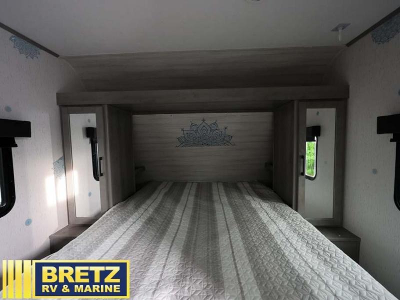 You can sleep eight happy campers in this spacious travel trailer thanks to the double-size bunks, the U-shaped dinette, and the queen bed in the front bedroom. The kitchen comes fully-equipped with a three burner cooktop, a microwave oven, and a 10 cu. ft. 12V refrigerator. Your crew can relax around the U-shaped dinette for dinner, then play a game of cards, or head outdoors to relax under the power awning with LED lights. And you'll find plenty of storage space for your belongings, including an exterior pass-through compartment!