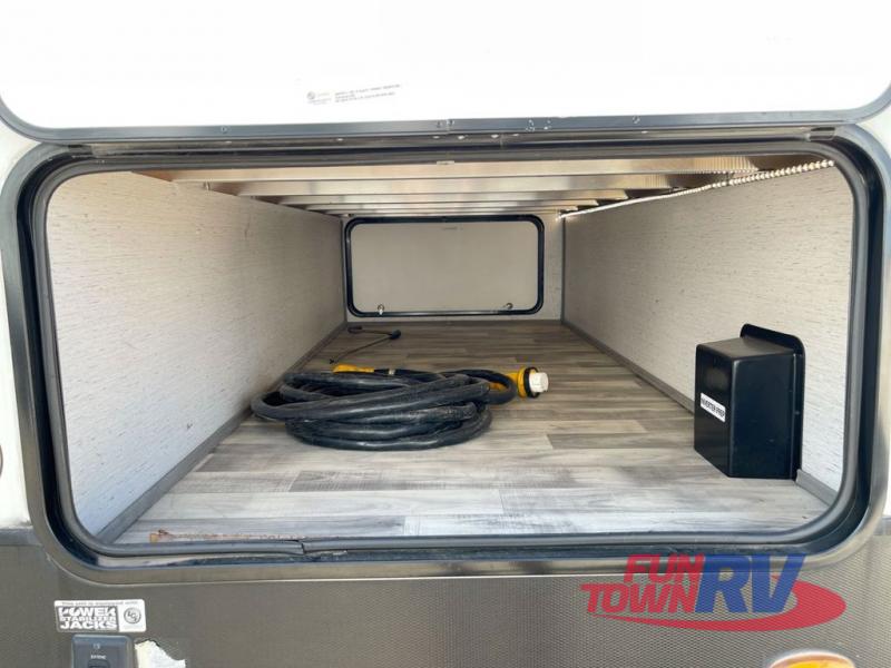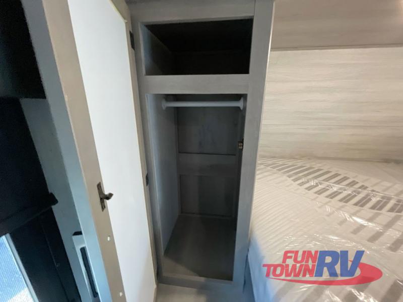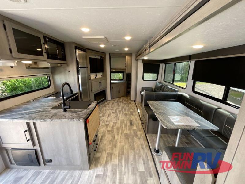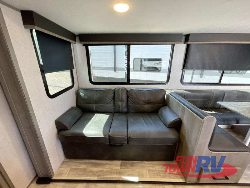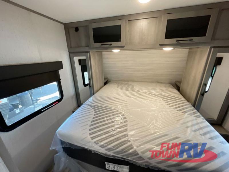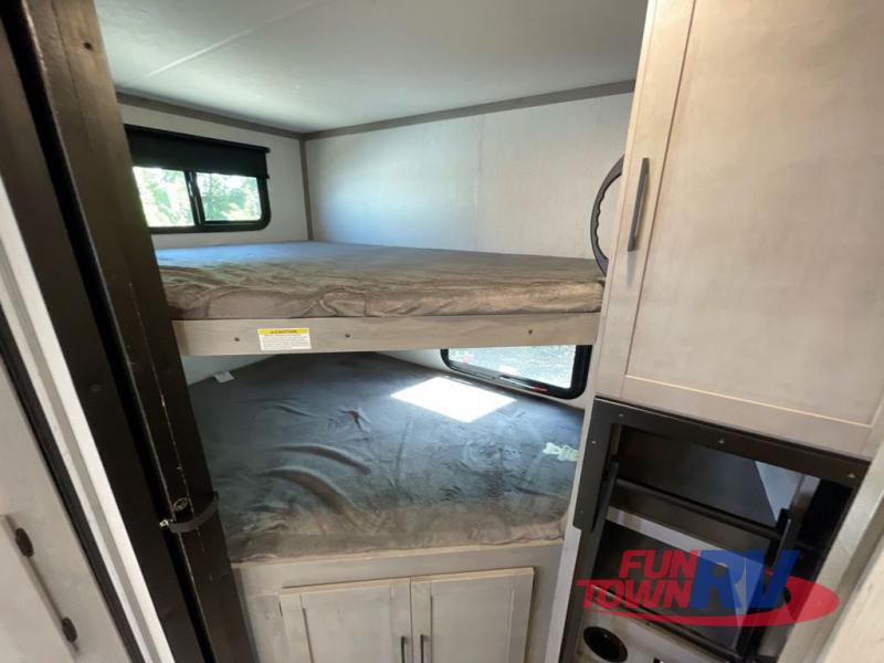 Comfort is found in this roomy travel trailer for eight! The rear bunk beds include their own door for privacy, plus there is a wardrobe here so your guests can store their things. When the large slide is out, the chef of the group can easily cook in the full kitchen, or they can use the outside kitchen if they need some fresh air. You'll also find Solid Entry steps, a 21' power awning with LED lights, plus a pass-through storage outside as well. You will love the front master bedroom with its queen bed with storage space on either side of the bed, plus the walk-through bath will be easily accessible for everyone to use!