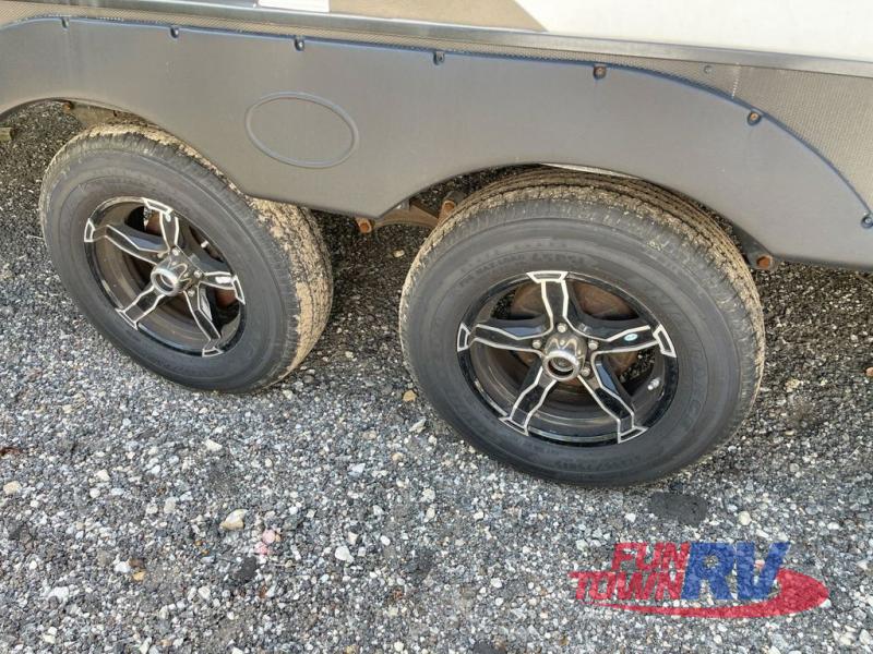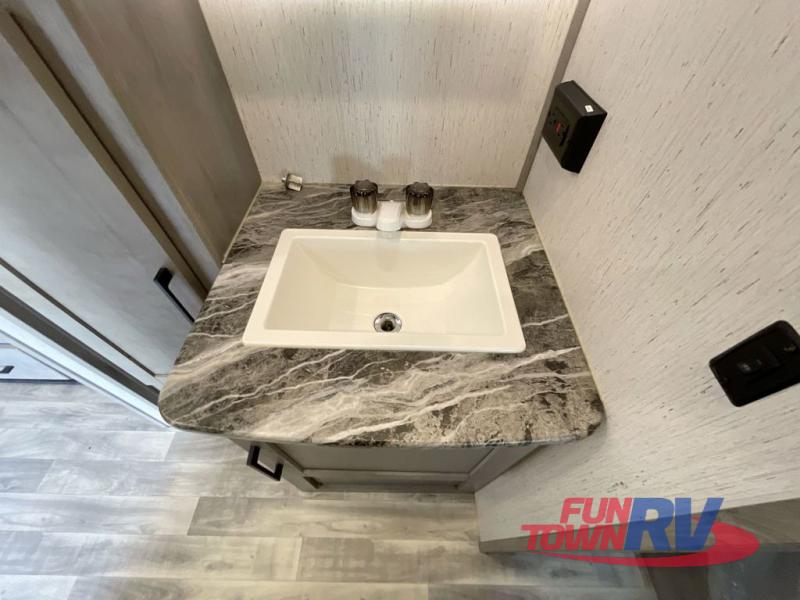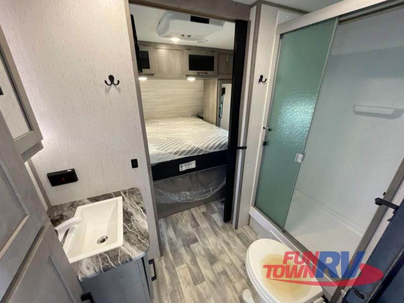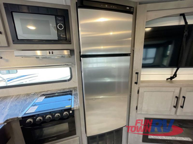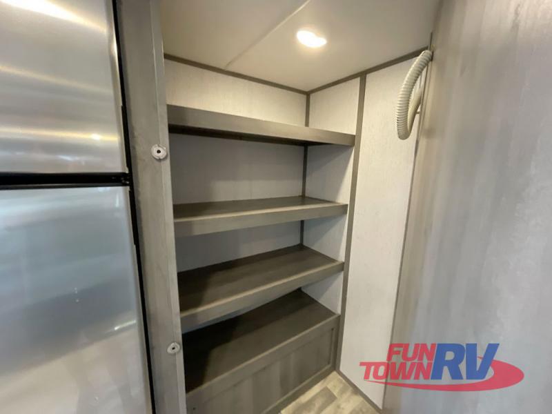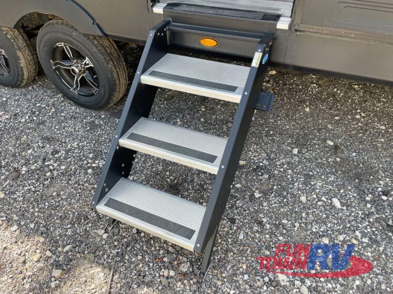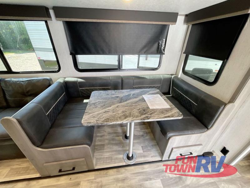 Comfort is found in this roomy travel trailer for eight! The rear bunk beds include their own door for privacy, plus there is a wardrobe here so your guests can store their things. When the large slide is out, the chef of the group can easily cook in the full kitchen, or they can use the outside kitchen if they need some fresh air. You'll also find Solid Entry steps, a 21' power awning with LED lights, plus a pass-through storage outside as well. You will love the front master bedroom with its queen bed with storage space on either side of the bed, plus the walk-through bath will be easily accessible for everyone to use!