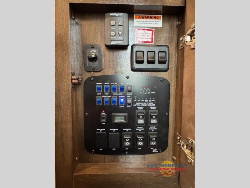 This Voltage toy hauler is what you need if you are the type of traveler that appreciates luxury! The entire unit is loaded with more amenities than you'll know what to do with, like an 18-cubic foot refrigerator, a garage TV, a heated and massaging residential sofa, a 30" residential microwave, a USB charging station, and a 50" LCD HDTV in the main living area. For comfort, there is a king-size bed in the front master suite, and once you remove the toys from the garage, there is a Happi-Jack power bunk above two sofas with a table top to use for dining or sleeping. For regular dining in the main living area, you can sit at the half booth dinette that is incorporated into the kitchen.