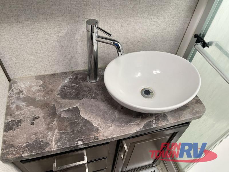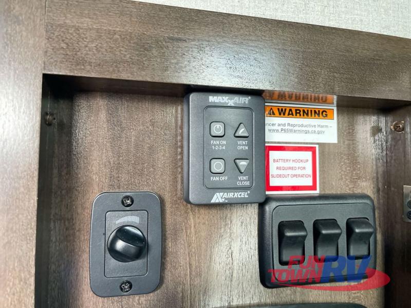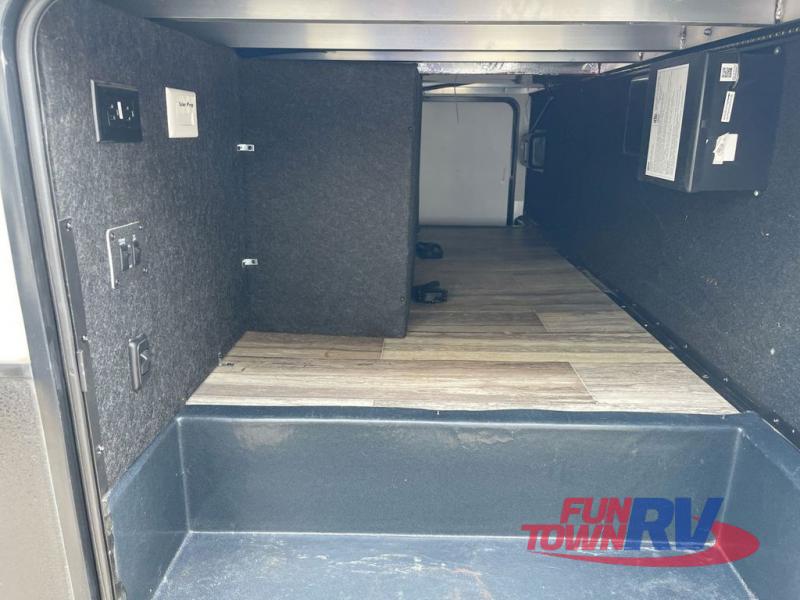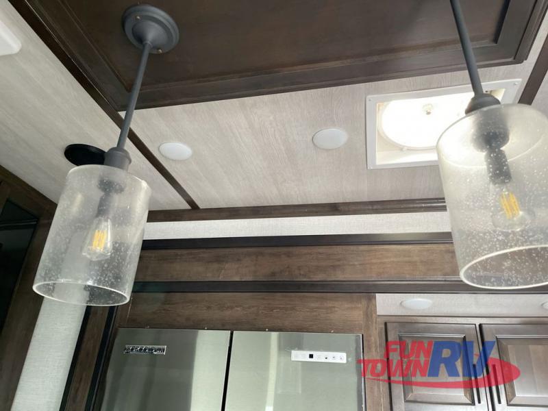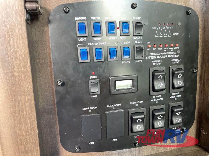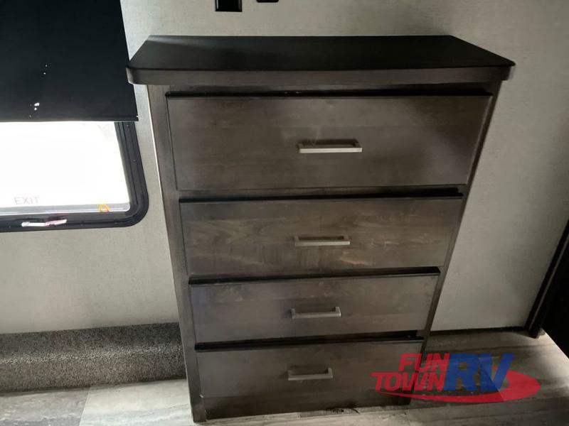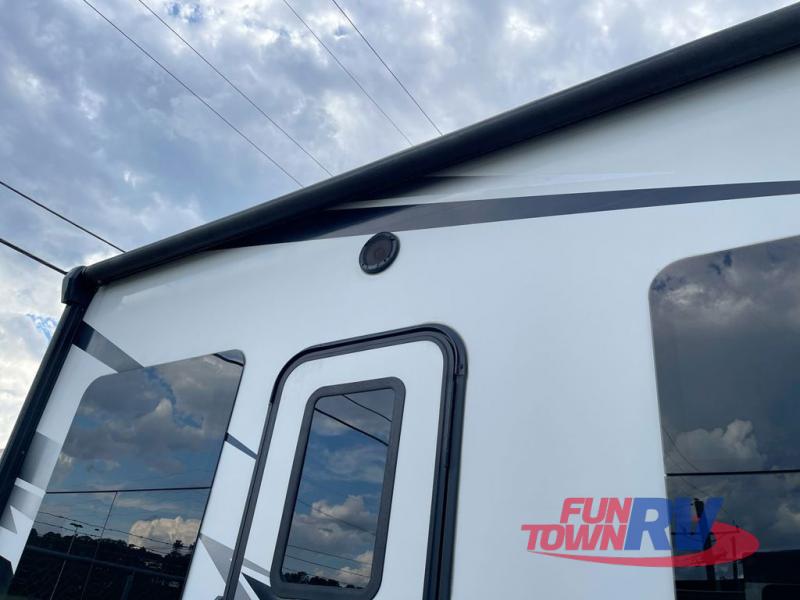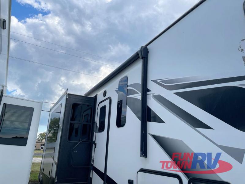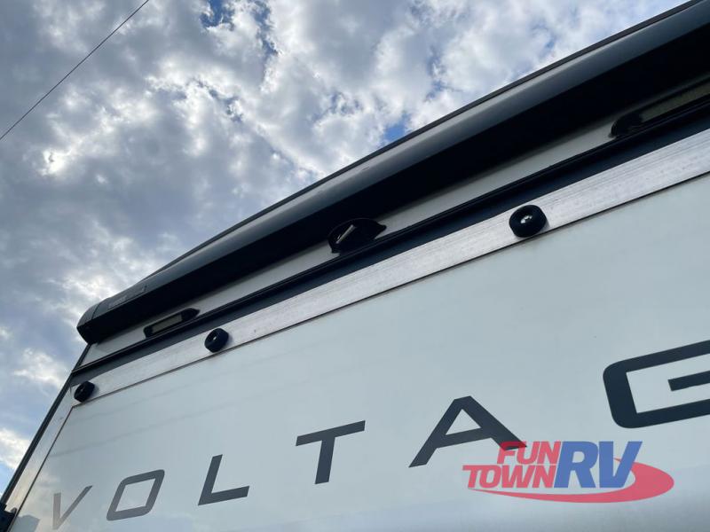 The Dutchmen Voltage toy hauler is an amazing RV that won't disappoint! These elegant units have more durability and luxury than you ever thought possible. They include an All Weather Package, 16" custom wheels, a gel-coat fiberglass exterior finish, MorRyde CRE 3000 suspension, Secure Stance entry steps, and a second fuel tank for a total of 60 gallons. There is a second power awning over the garage entry door, and you will even find a third awning above the ramp patio. The tinted frameless windows will protect you from outside prying eyes and harsh sunlight, and the interior solid-surface countertops in the kitchen will withstand many years of chopping and dicing. You'll also have a 12" diamond plate in the garage for protection, and there is an aluminum four-step entry that leads right into the garage.