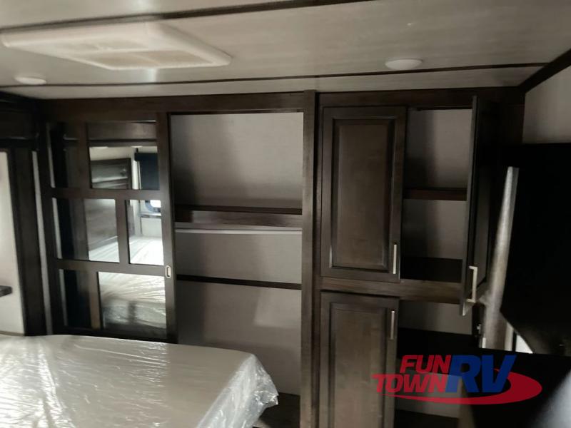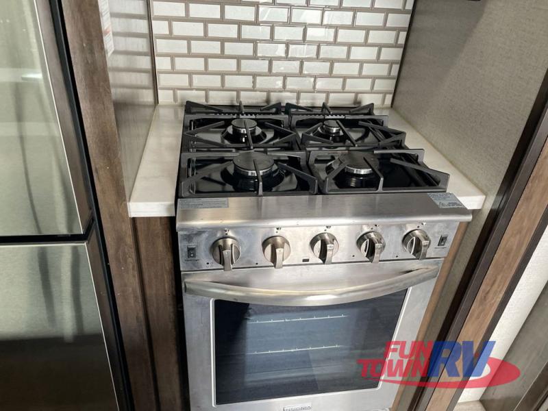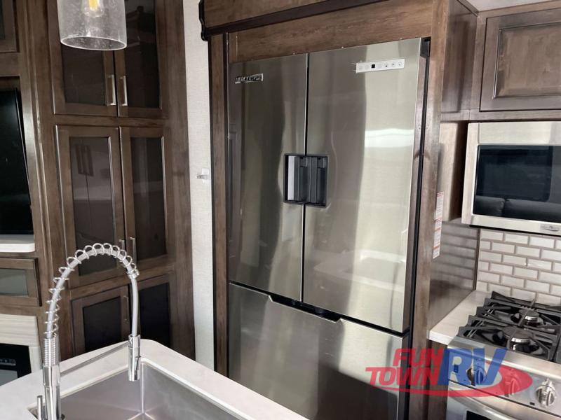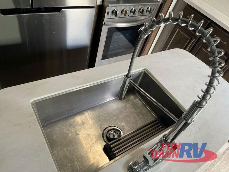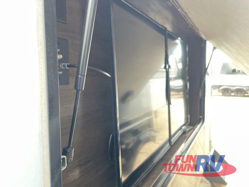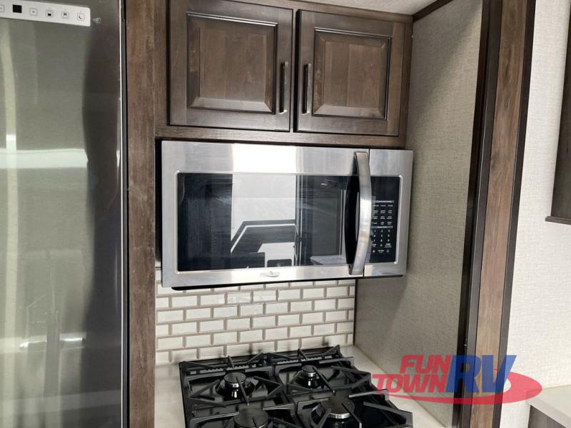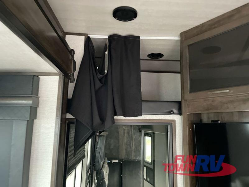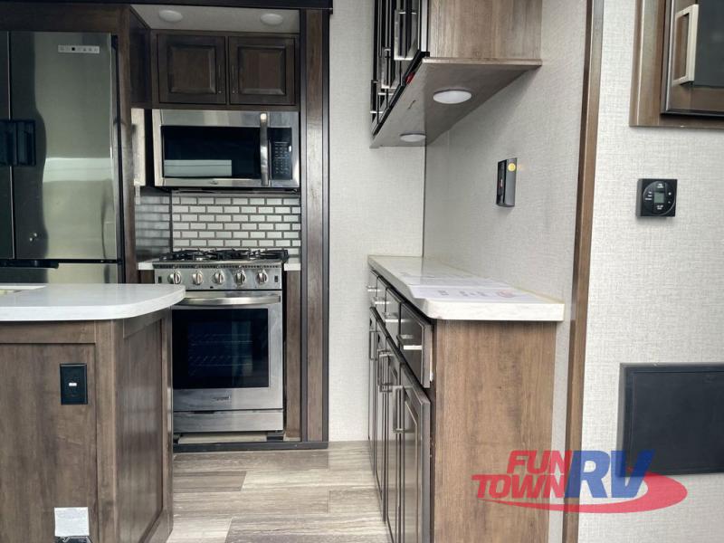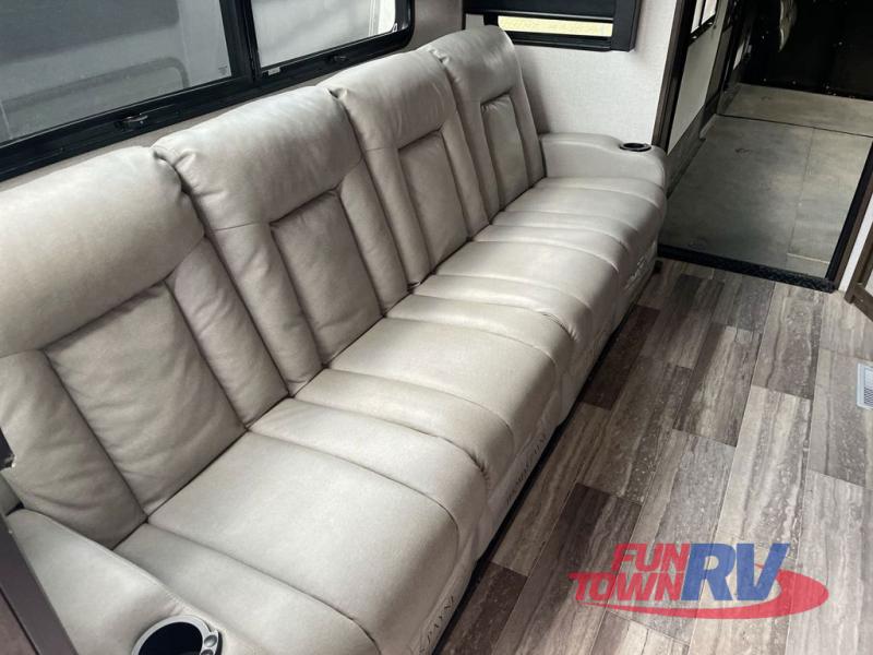 The Dutchmen Voltage toy hauler is an amazing RV that won't disappoint! These elegant units have more durability and luxury than you ever thought possible. They include an All Weather Package, 16" custom wheels, a gel-coat fiberglass exterior finish, MorRyde CRE 3000 suspension, Secure Stance entry steps, and a second fuel tank for a total of 60 gallons. There is a second power awning over the garage entry door, and you will even find a third awning above the ramp patio. The tinted frameless windows will protect you from outside prying eyes and harsh sunlight, and the interior solid-surface countertops in the kitchen will withstand many years of chopping and dicing. You'll also have a 12" diamond plate in the garage for protection, and there is an aluminum four-step entry that leads right into the garage.