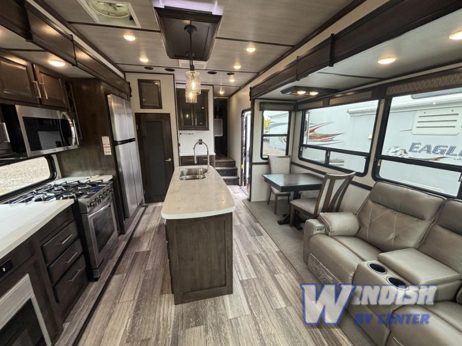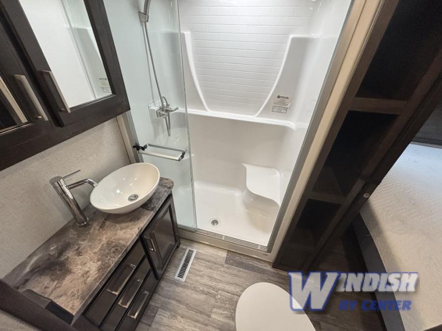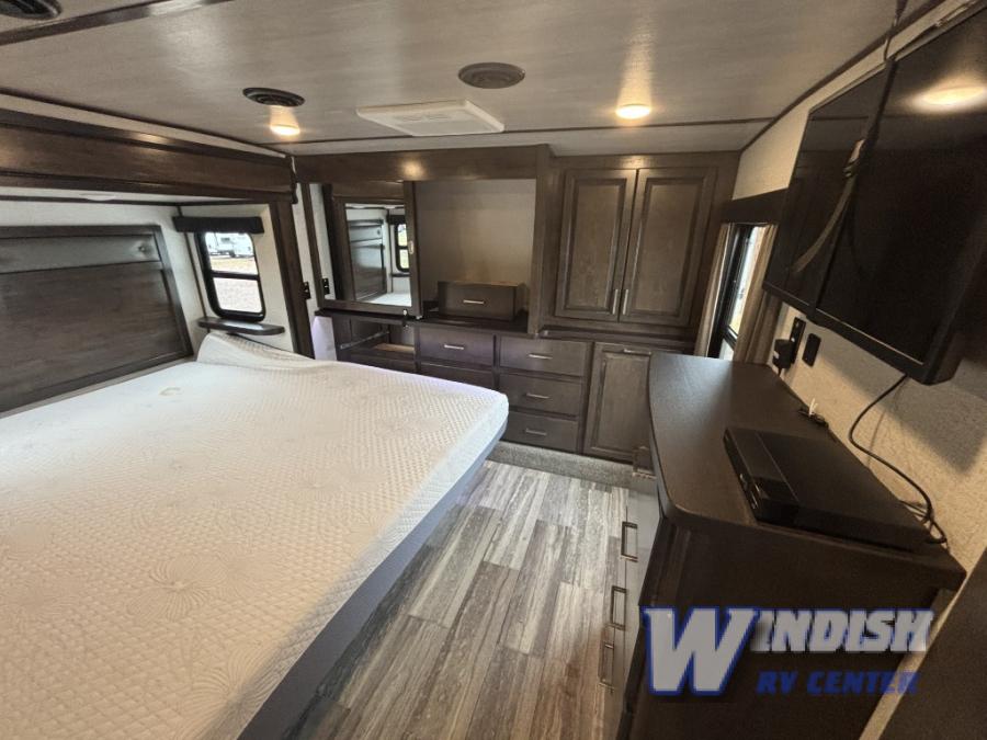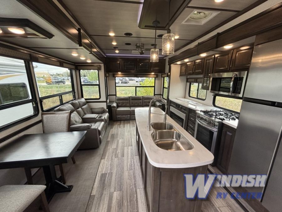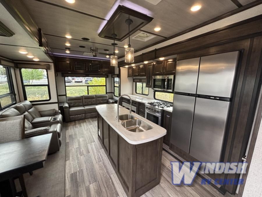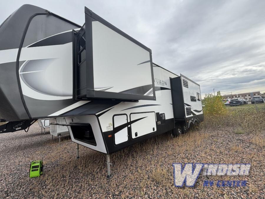 This Yukon fifth wheel takes your adventures to new heights with its excellent features! You'll find the largest oven in the industry on this unit, and the large kitchen island will make meal prep a breeze. The master suite houses a king bed slide and 50" TV, and there is another 50" TV in the main living area at the entertainment center. The free-standing dinette is a great place to sit while you eat, and the large pantry will hold your favorite snacks. Spend some time relaxing on one of the two sofas, and enjoy the added interior living space that comes from the two opposing slides.