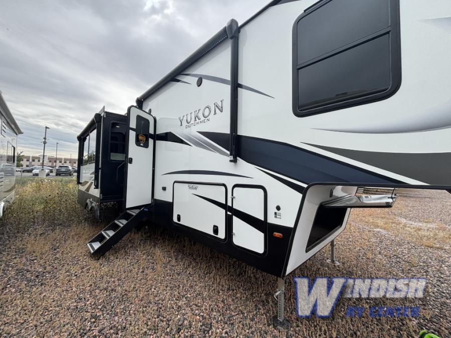 The Dutchmen Yukon fifth wheel features luxury you can take anywhere! The main floor structure consists of linoleum flooring, Dynaspan floor decking, an aluminum frame with block foam insulation and heat duct, a Lauan panel, a Darco moisture barrier, a steel powder-coated main I-beam frame, radiant insulation, and a fully enclosed underbelly. There is a lot of thought and precision that goes into the construction of each Yukon, and the standard features are also well thought out. You'll have a roto flex pin box, dual 30-LB propane tanks, an All Weather Thermal Package, six-point one-touch auto leveling, USB ports, and preparation for Wi-Fi 4G LTE. You also have the ability to add some options to your Yukon, like the optional third high-efficiency A/C unit or solar package with inverter.