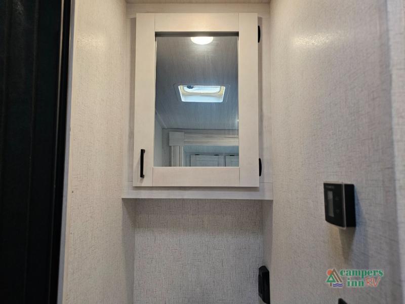 Vanity with medicine cabinet located just outside the bath for quick morning routines