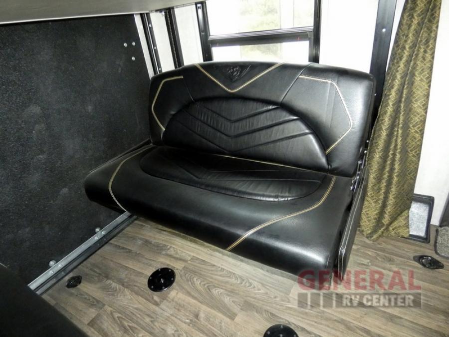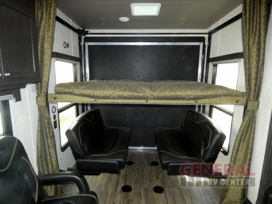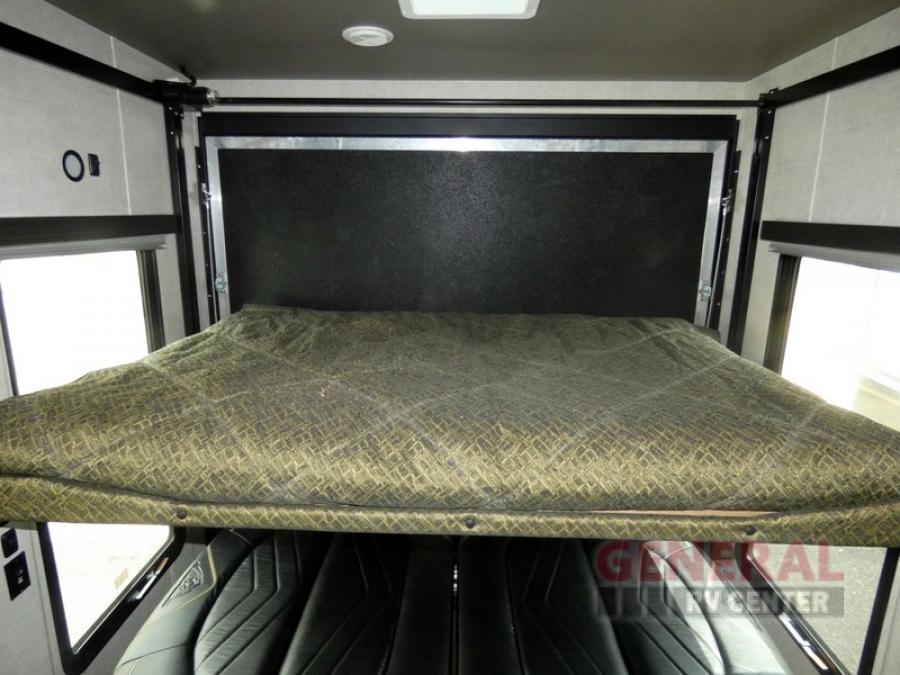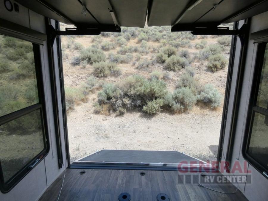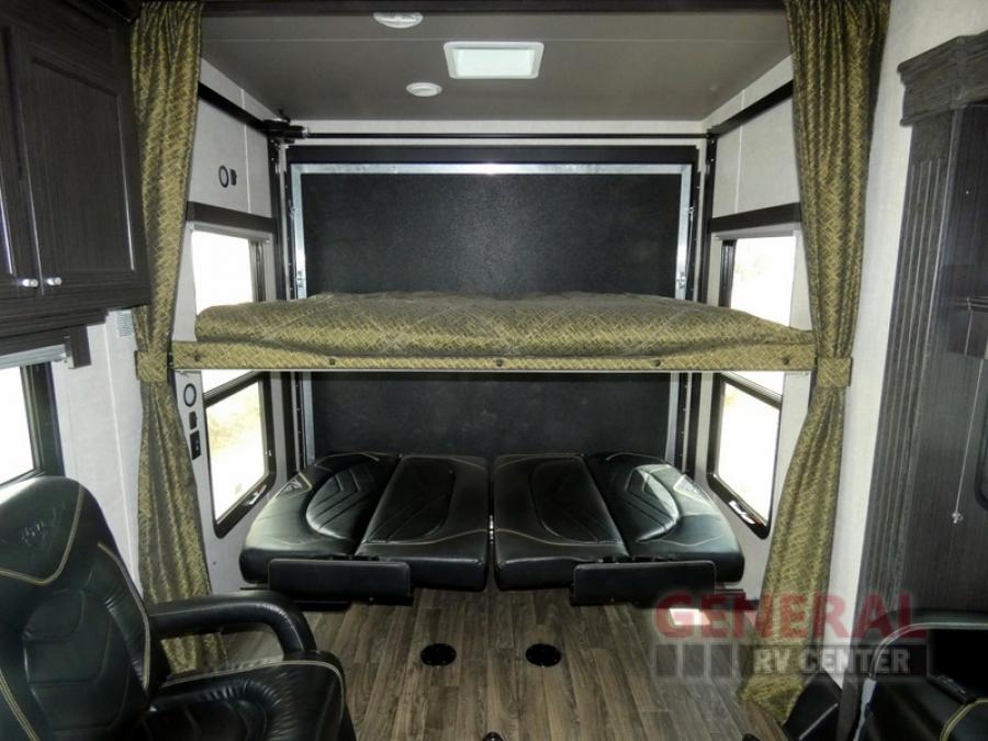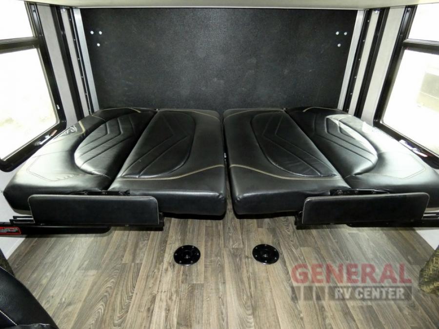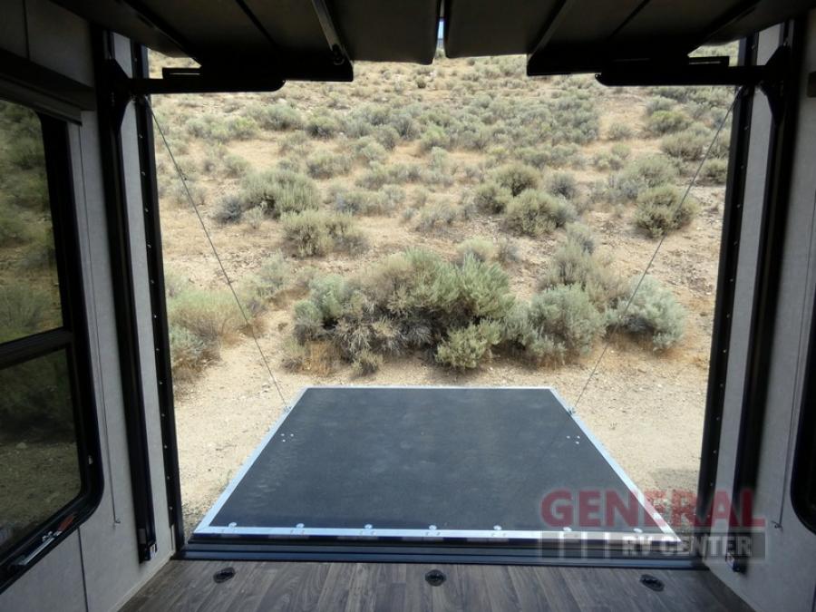 Easily find comfort and lots of legroom in this fifth wheel with a large slide out in the main living and kitchen area that is created after unloading from the cargo area. You can sleep family members between the queen bed in the front private bedroom with lots of storage for clothes and such, plus the electric bed and dinette seats in the cargo area, and the sofa next to the refrigerator. Make warm meals using the kitchen amenities, and the peninsula counter offers more space to serve food and wash the dishes. You will find storage throughout in overhead cabinets. And don't forget about the 14' to 17'7" of cargo space for your toys!
