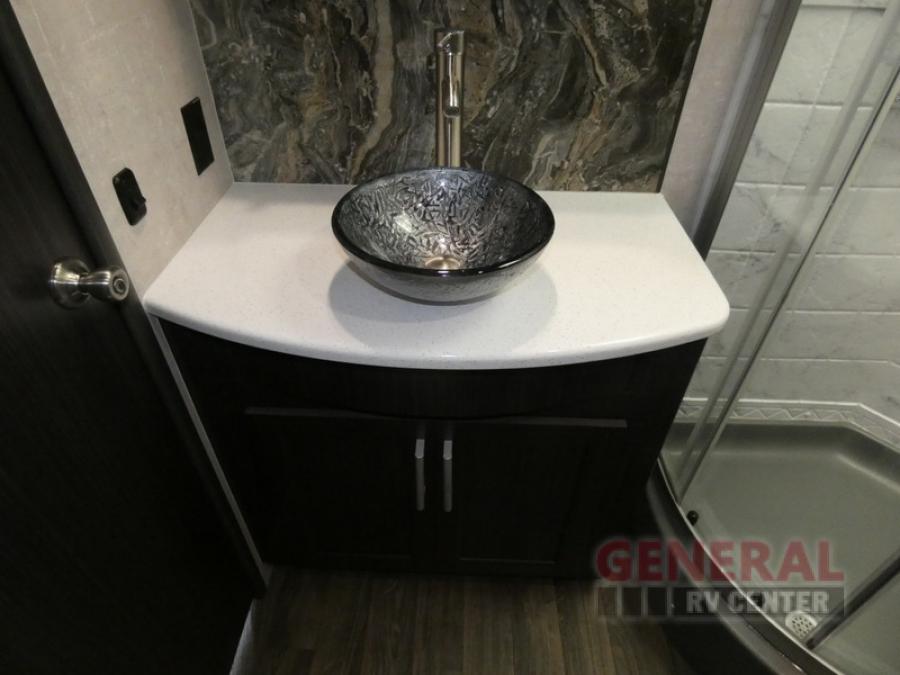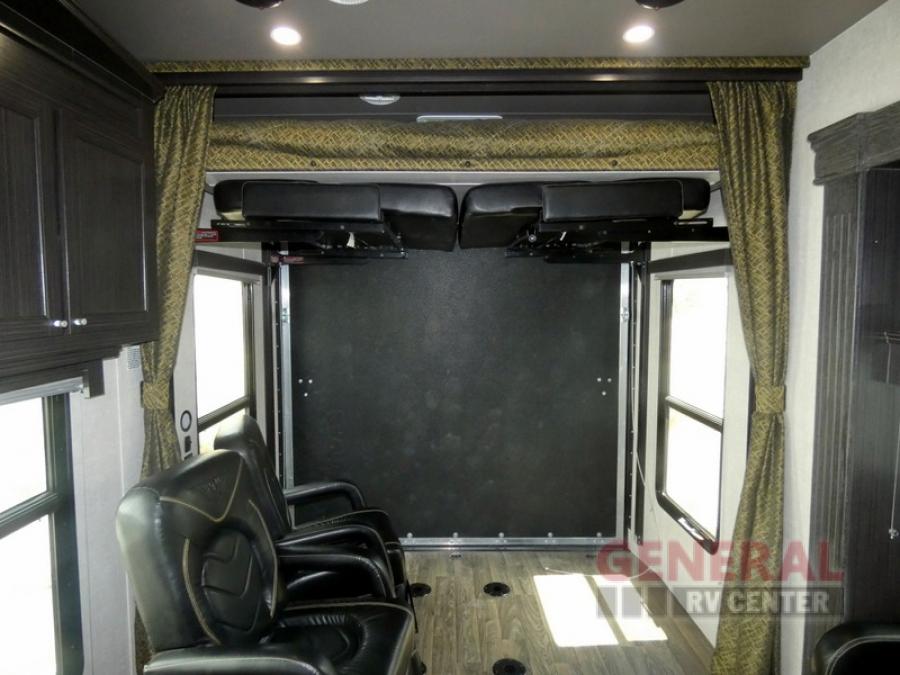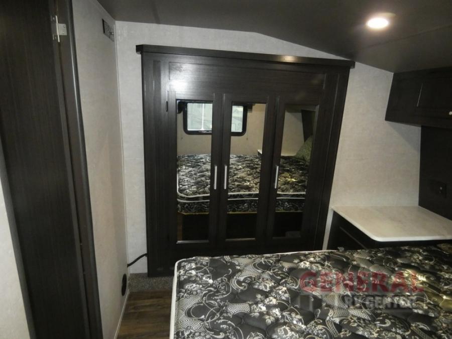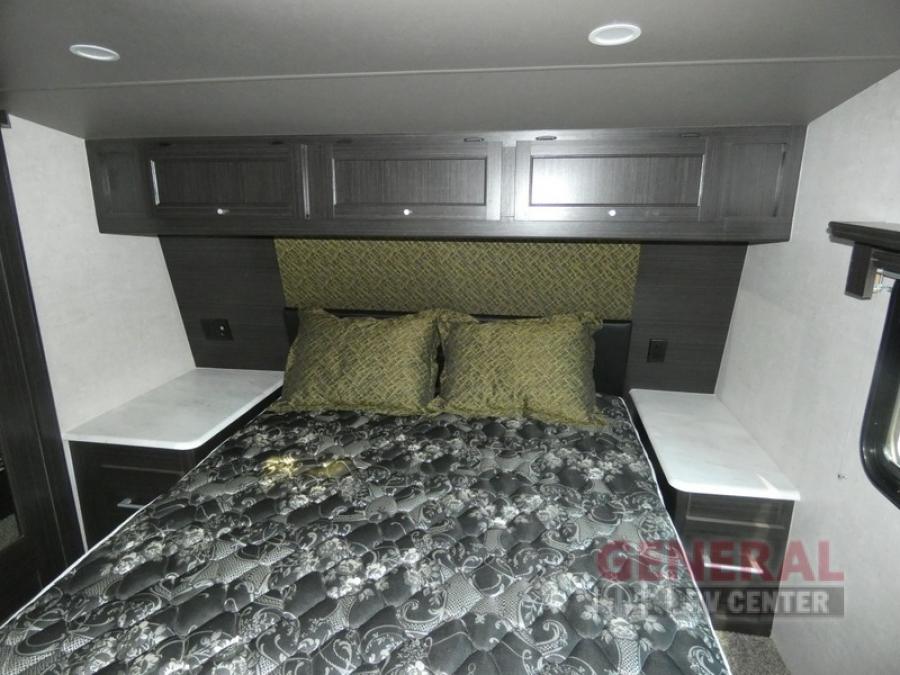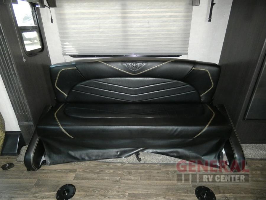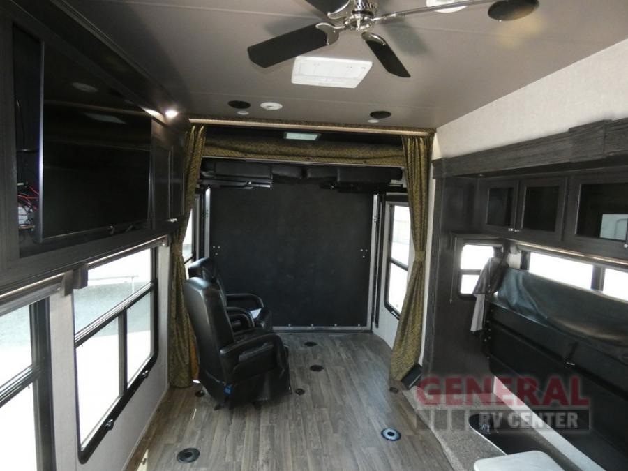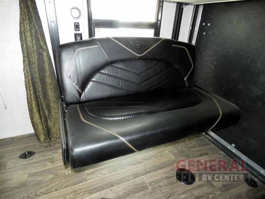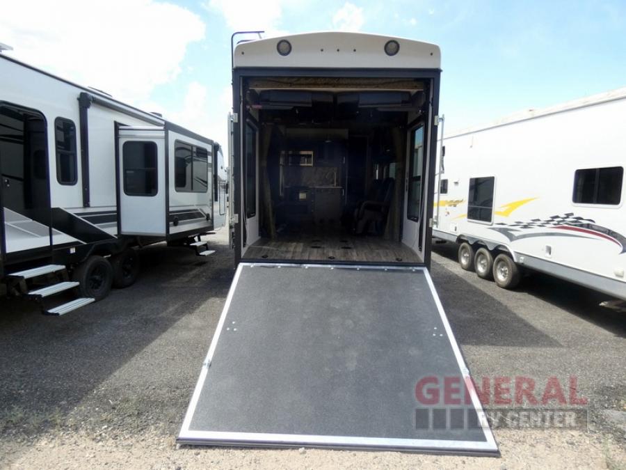 Easily find comfort and lots of legroom in this fifth wheel with a large slide out in the main living and kitchen area that is created after unloading from the cargo area. You can sleep family members between the queen bed in the front private bedroom with lots of storage for clothes and such, plus the electric bed and dinette seats in the cargo area, and the sofa next to the refrigerator. Make warm meals using the kitchen amenities, and the peninsula counter offers more space to serve food and wash the dishes. You will find storage throughout in overhead cabinets. And don't forget about the 14' to 17'7" of cargo space for your toys!
