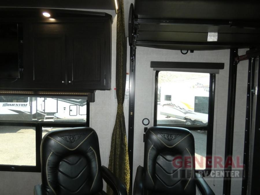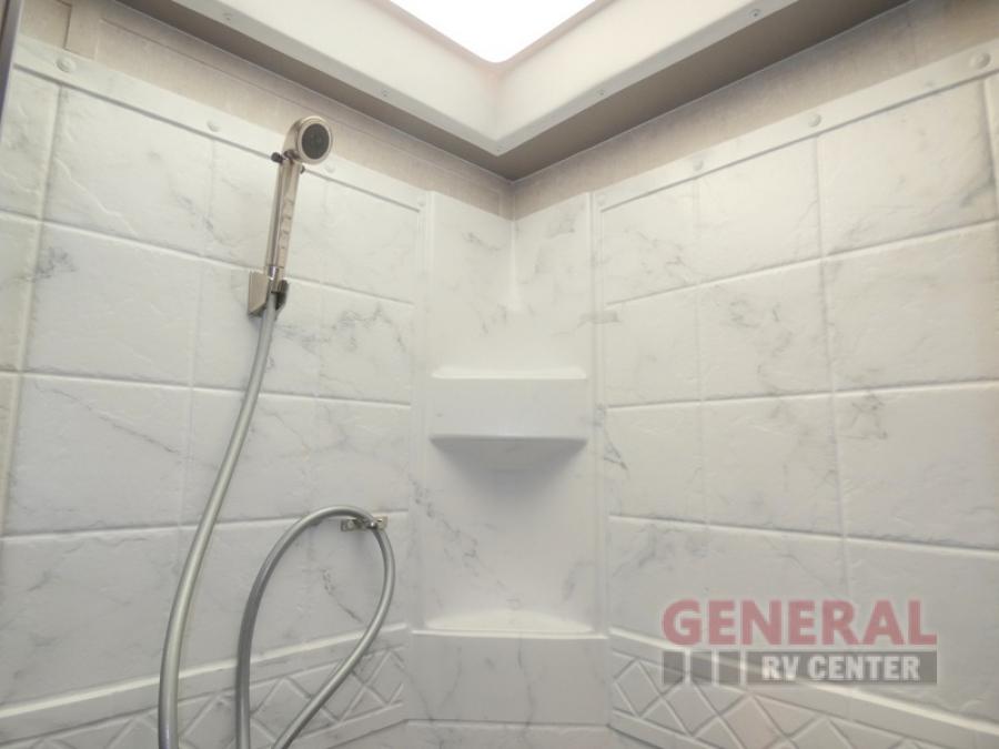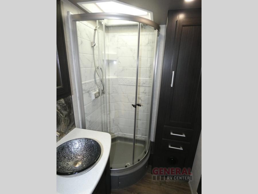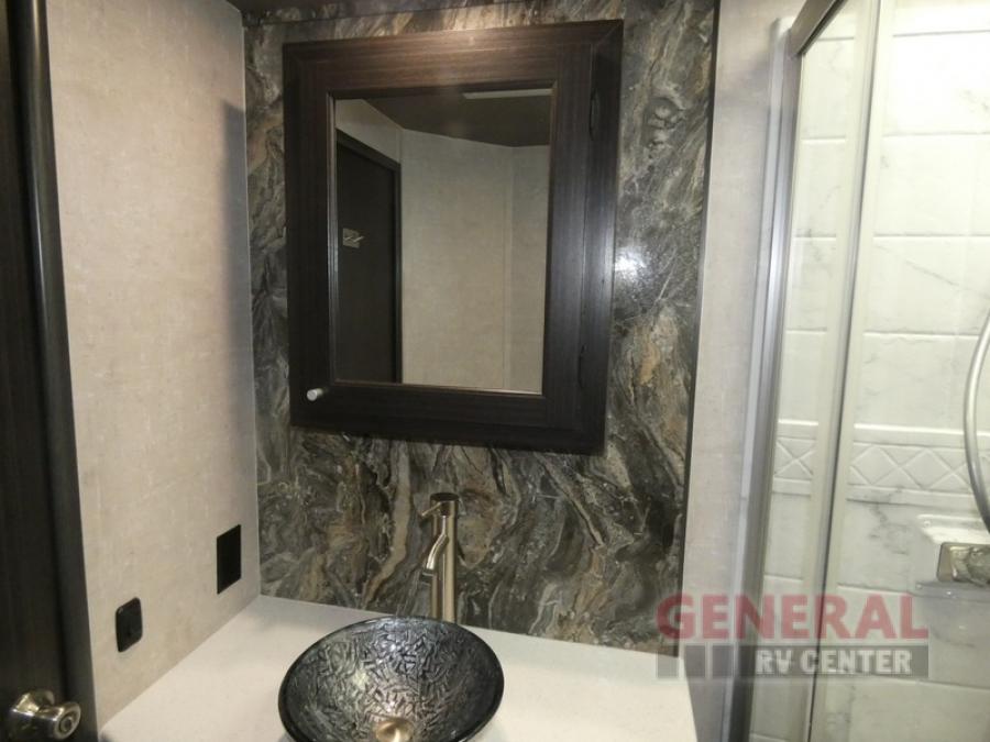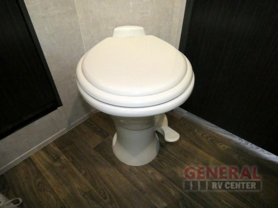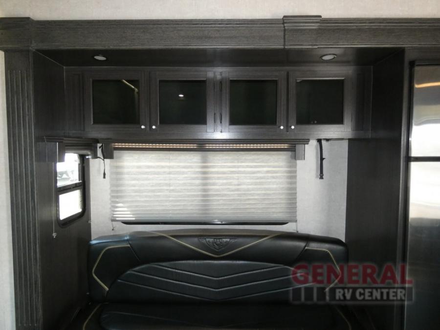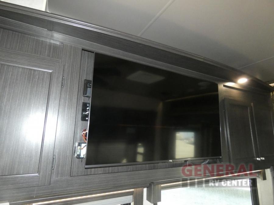 Easily find comfort and lots of legroom in this fifth wheel with a large slide out in the main living and kitchen area that is created after unloading from the cargo area. You can sleep family members between the queen bed in the front private bedroom with lots of storage for clothes and such, plus the electric bed and dinette seats in the cargo area, and the sofa next to the refrigerator. Make warm meals using the kitchen amenities, and the peninsula counter offers more space to serve food and wash the dishes. You will find storage throughout in overhead cabinets. And don't forget about the 14' to 17'7" of cargo space for your toys!