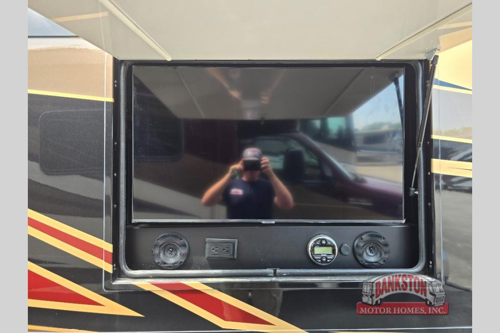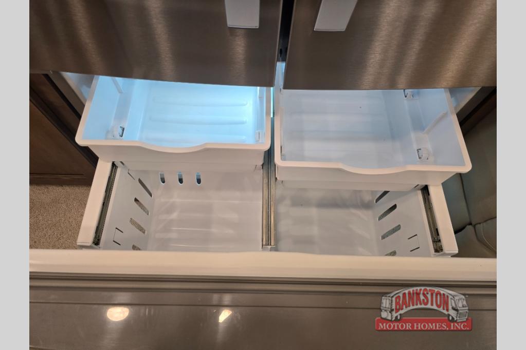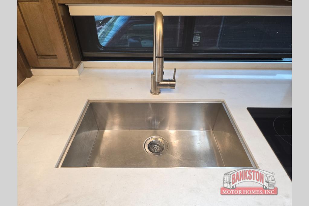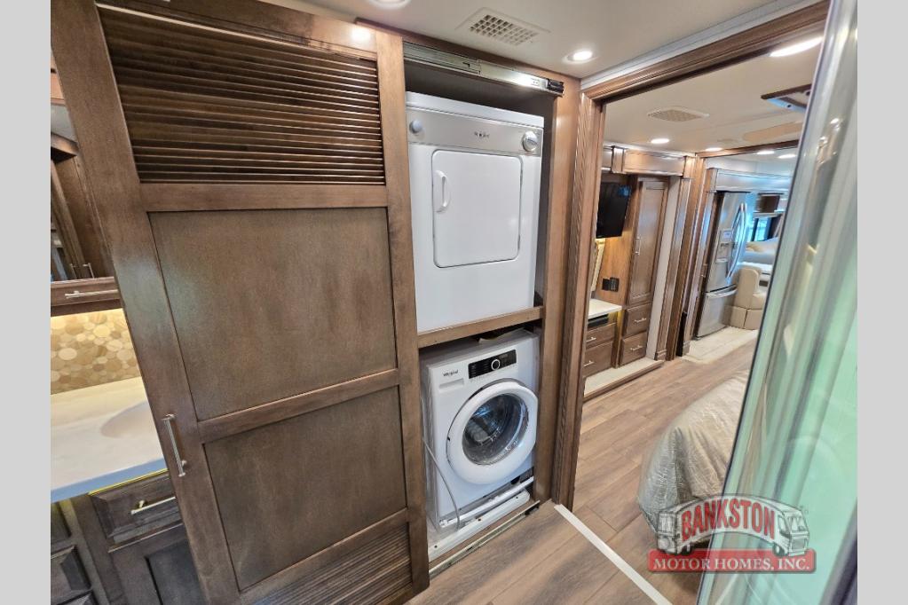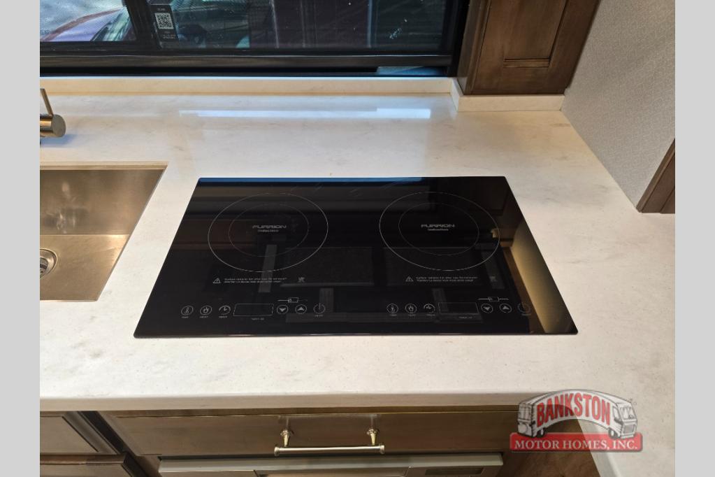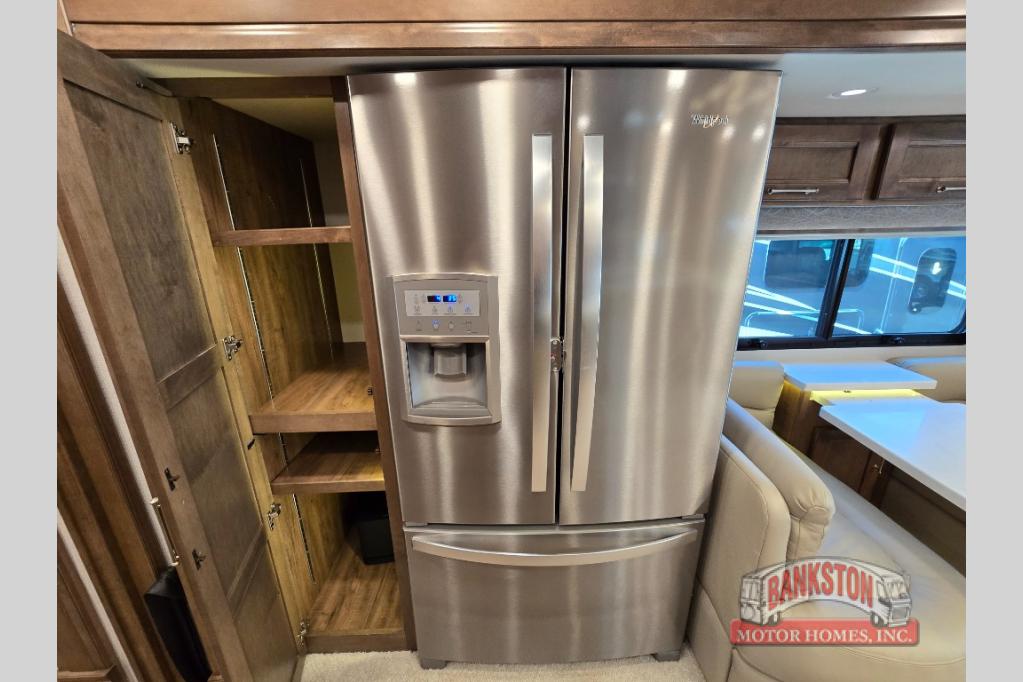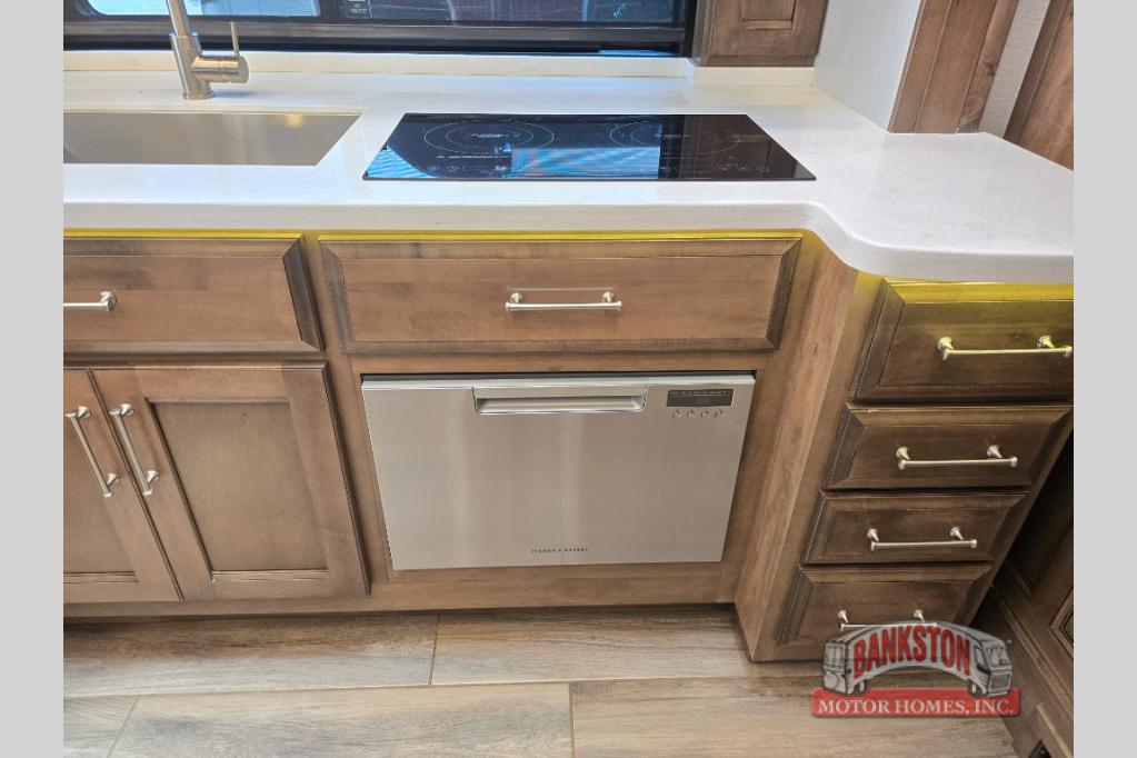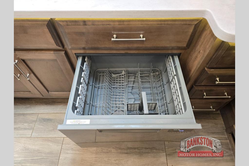 Four slides for tons of space, a full bath plus a half bath, and sleeping space for five make this coach a dream come true. Once you arrive at the campground, set up the power patio awnings while the kids ride their bikes. Everyone will enjoy the exterior 43" TV, plus there are three more TVs inside as well. Prepare lunch on the induction cooktop, or use the Whirlpool convection microwave. The kitchen also includes a Fisher and Paykel dishwasher, a deep drawer for a waste basket with an easy access trash chute, and a residential refrigerator with ice and water in the door. Mom and dad will sleep soundly on the slide out king bed, while the kids take the hide-a-bed sofa or the second sofa. Family vacations just got sweeter in this Aspire motorhome!