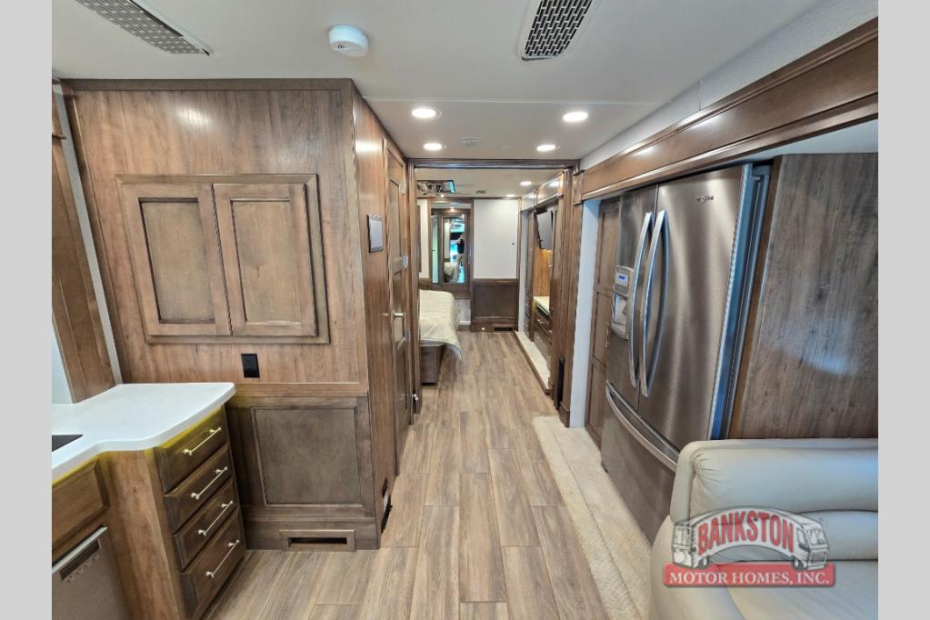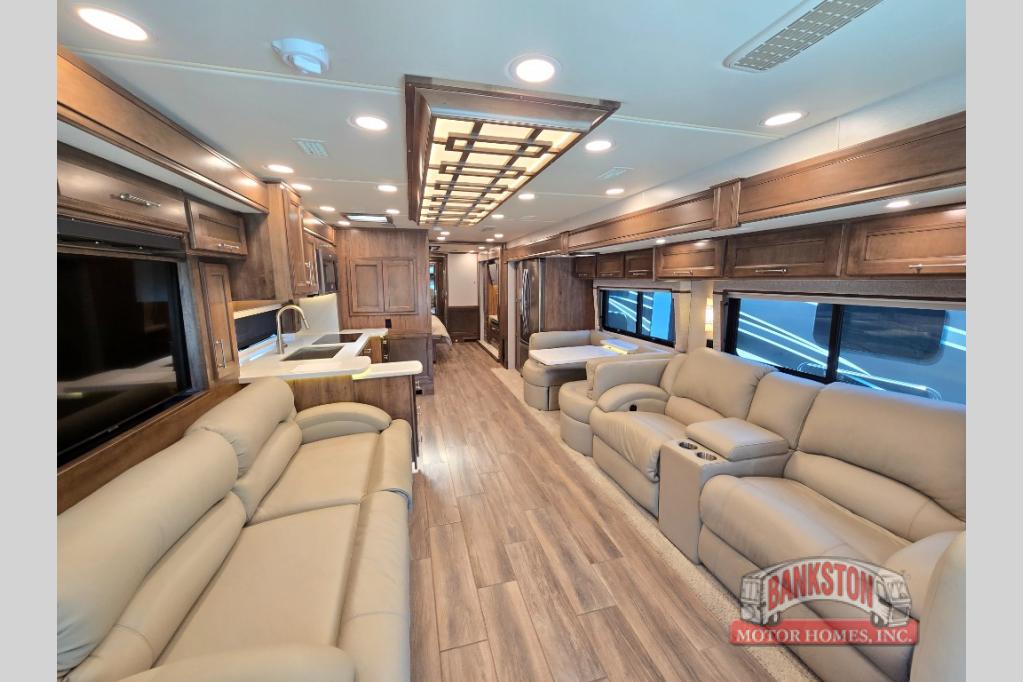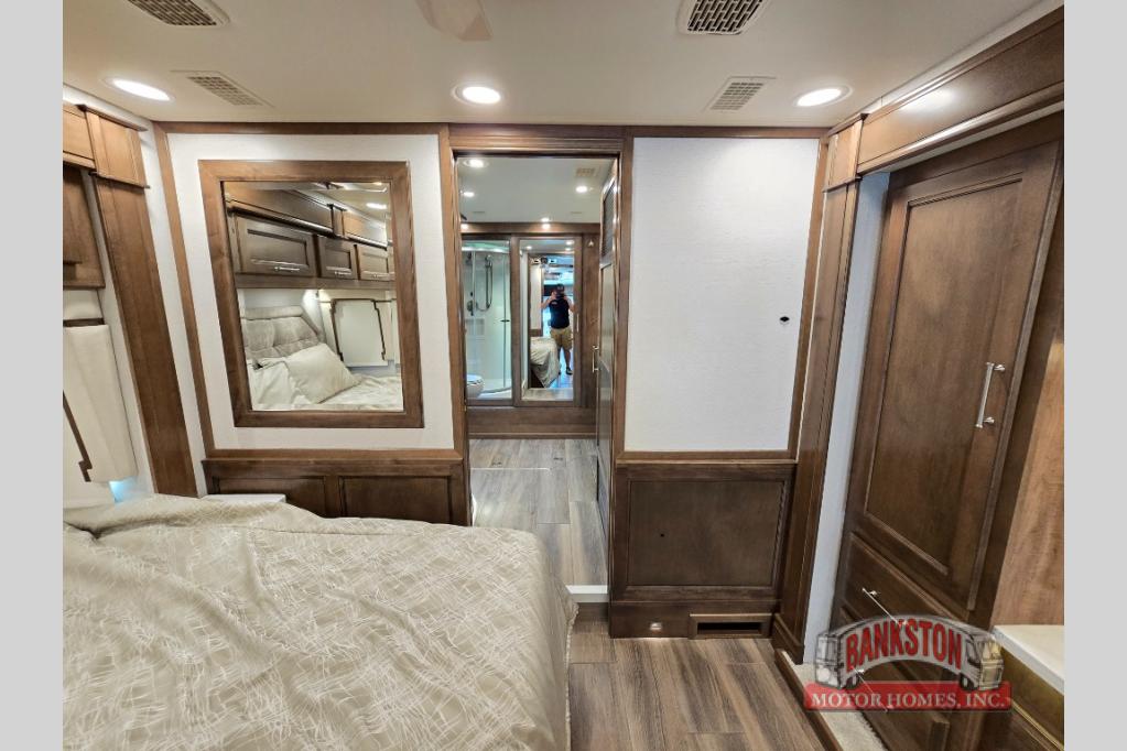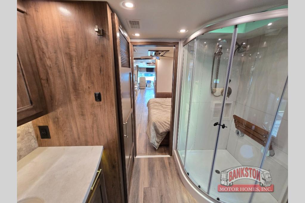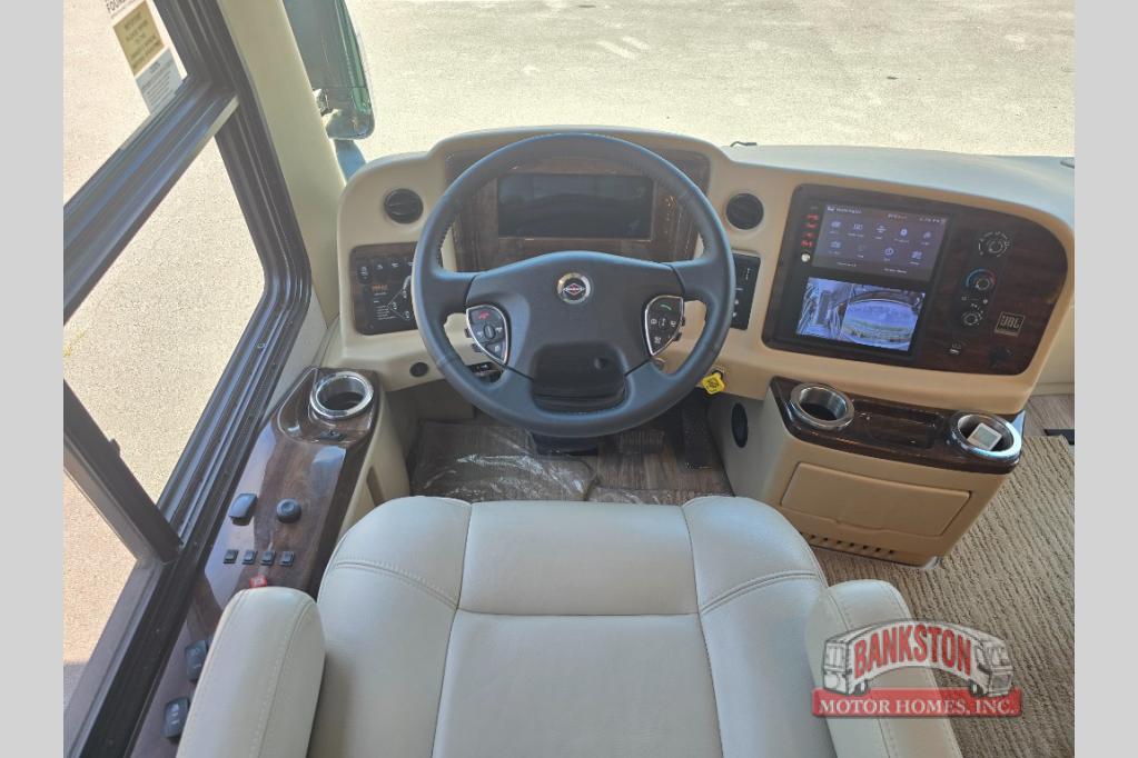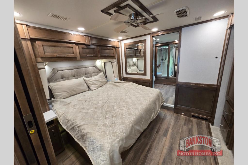 The Aspire Class A diesel motorhome by Entegra Coach starts with a Spartan K2 raised-rail chassis and a Cummins L9 turbocharged 450 HP engine to bring power to your adventures. The cockpit is packed with features to make each trip enjoyable, like the Xite XSG4 infotainment system, the E-Z Steer adjustable power steering assist, and the JBL premium audio 5-speaker sound system to crank up the highway tunes. Each model includes Aqua-Hot heated basement storage, three 15,000 BTU A/C units, an Onan 10,000-watt diesel generator, and many more hassle-free utilities. You will fall in love with the Aspire interior that features premium leather Villa furniture, solar day shades and blackout night shades, a textured porcelain tile shower with a skylight and clear glass door, and a large cedar-lined wardrobe in the bedroom.