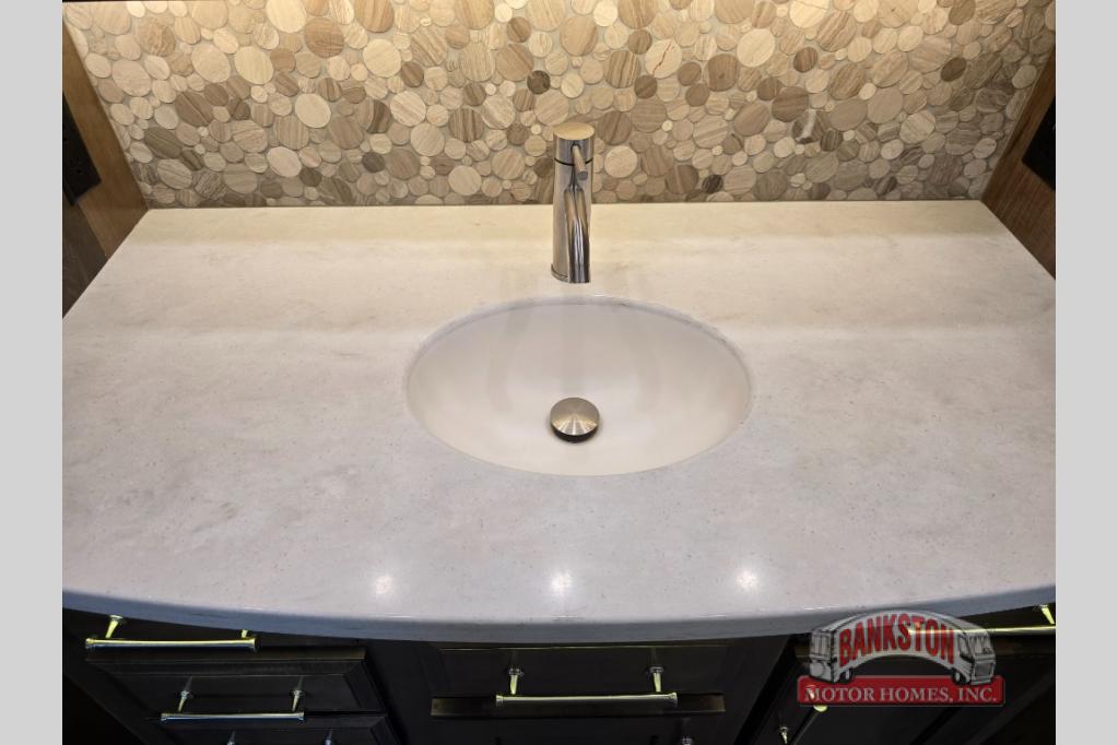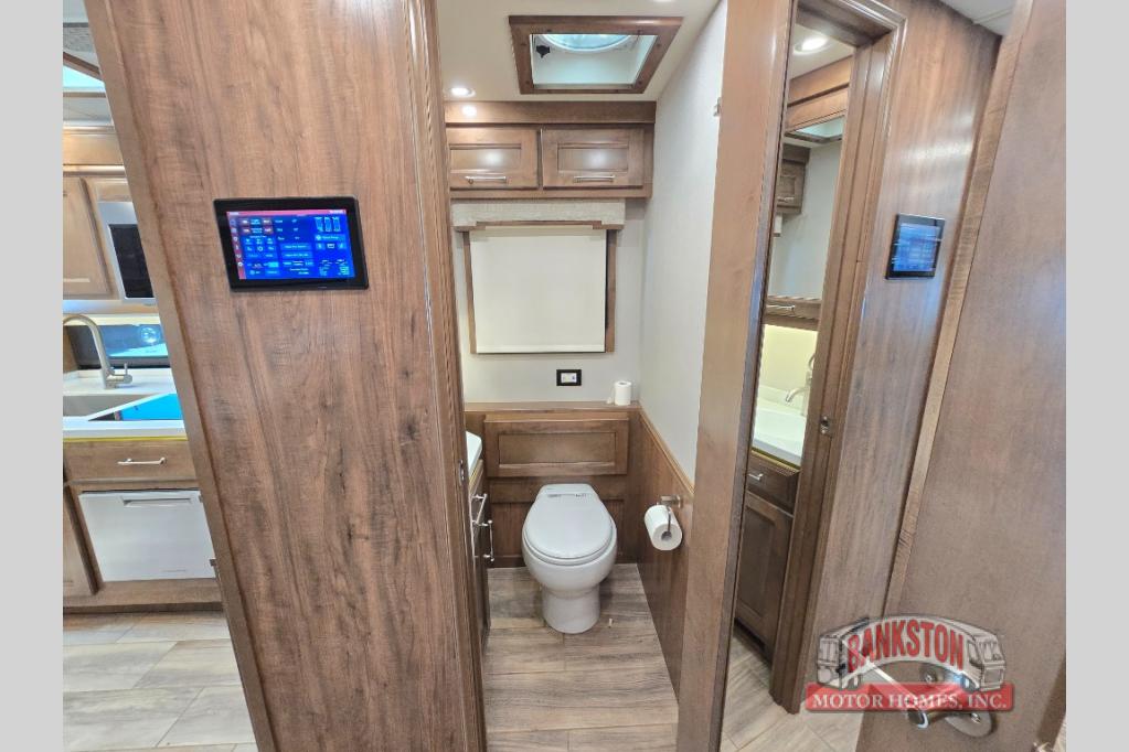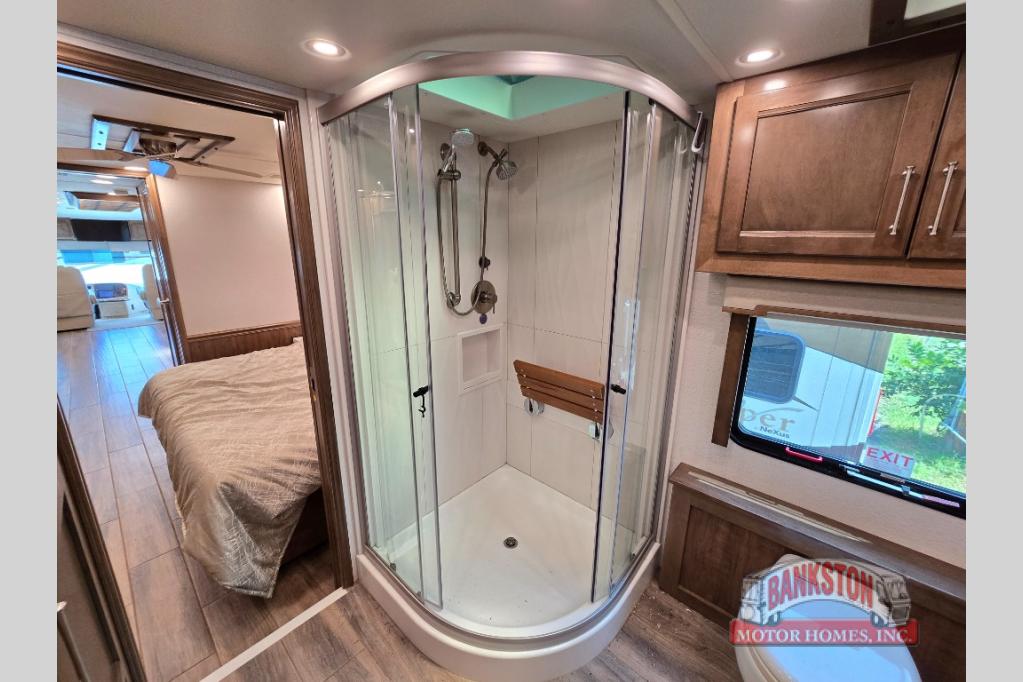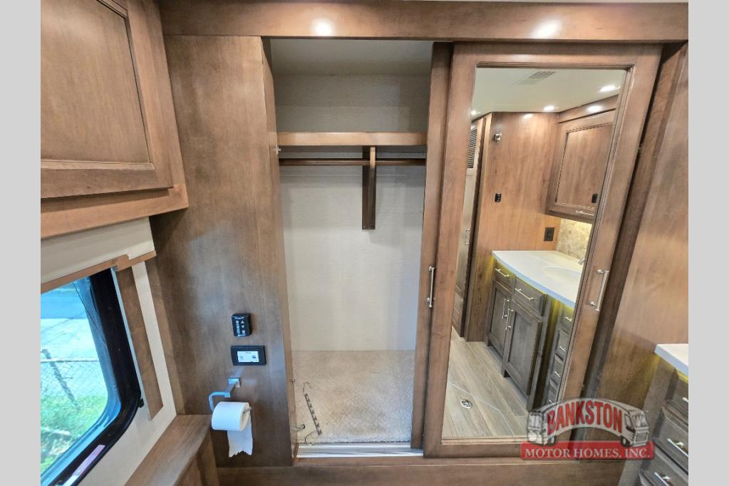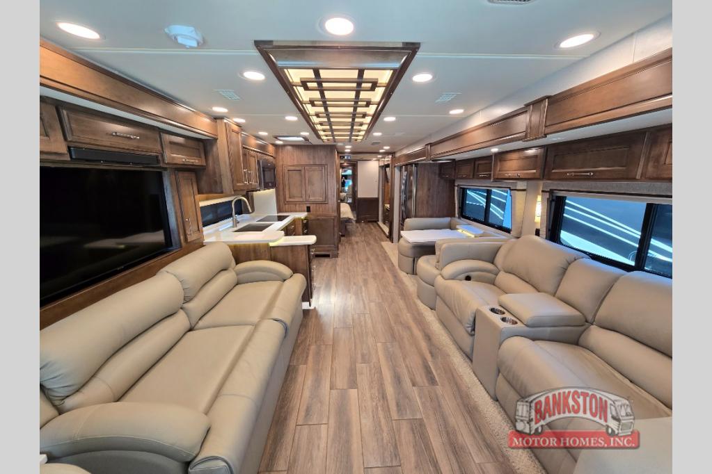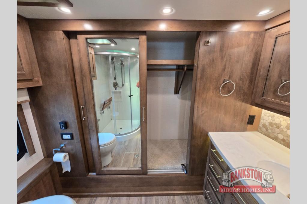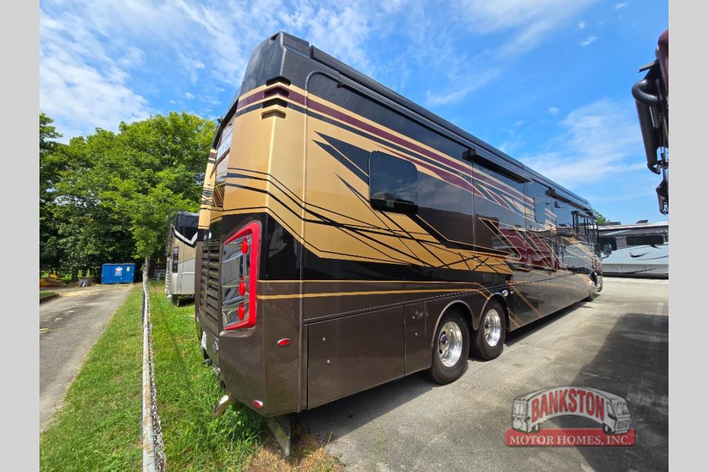 The Aspire Class A diesel motorhome by Entegra Coach starts with a Spartan K2 raised-rail chassis and a Cummins L9 turbocharged 450 HP engine to bring power to your adventures. The cockpit is packed with features to make each trip enjoyable, like the Xite XSG4 infotainment system, the E-Z Steer adjustable power steering assist, and the JBL premium audio 5-speaker sound system to crank up the highway tunes. Each model includes Aqua-Hot heated basement storage, three 15,000 BTU A/C units, an Onan 10,000-watt diesel generator, and many more hassle-free utilities. You will fall in love with the Aspire interior that features premium leather Villa furniture, solar day shades and blackout night shades, a textured porcelain tile shower with a skylight and clear glass door, and a large cedar-lined wardrobe in the bedroom.