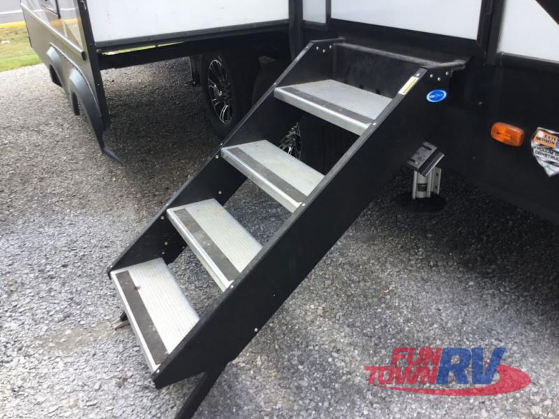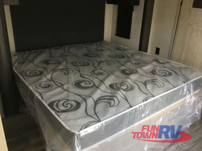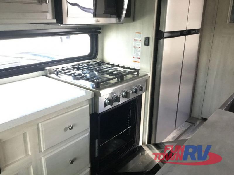 You won't want to camp any other way once you step inside this fifth wheel! Watch your favorite movies in comfort on either the rear hide-a-bed sofa or the theater seating across from the entertainment center with a fireplace. The chef will love using the kitchen island for meal prep and clean up will be a breeze with the farmhouse 60/40 stainless steel sink with a high rise, pull out bullet kitchen faucet. You can store your favorite snacks in the walk-in pantry and your dishes in the hutch. Freshen up each morning in the full bathroom with the 48" x 30" one piece molded fiberglass shower with a seat and skylight above for added natural lighting. The front private bedroom has a king bed slide for a good night's rest, a bench next to a dresser to sit while putting your shoes on, and a front wardrobe with shelves and an area prepped to add an optional washer and dryer!