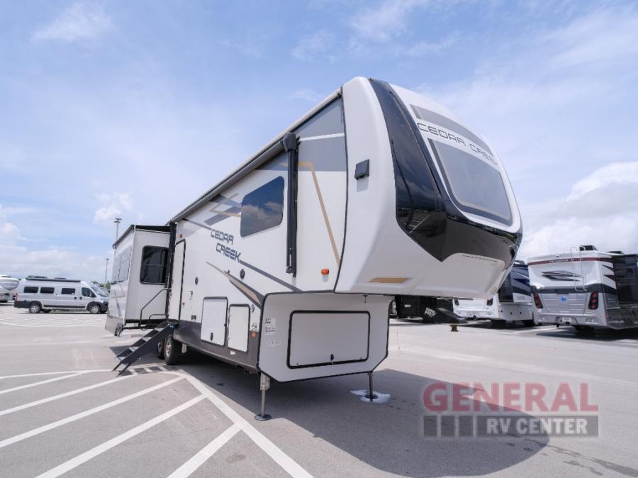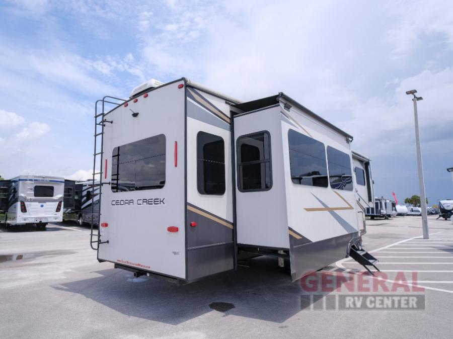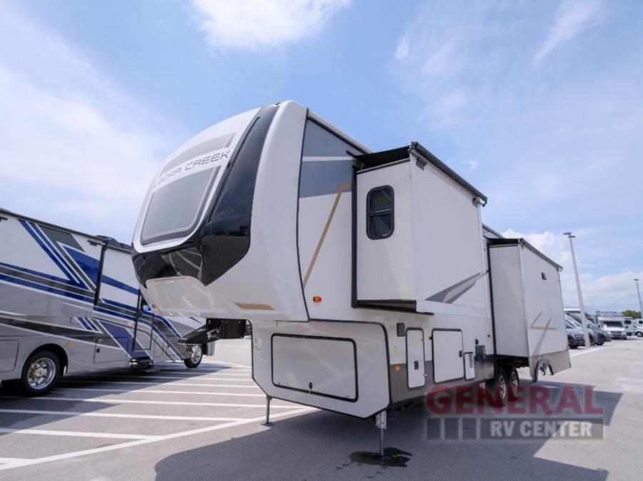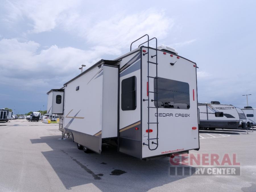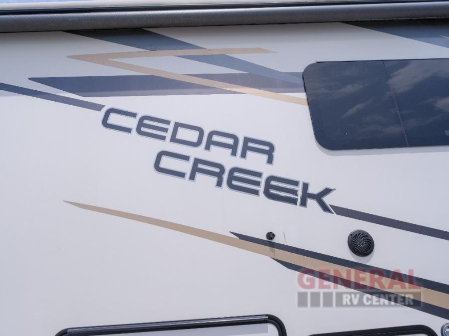 You will have peace of mind camping with any one of these Forest River Cedar Creek fifth wheels or fifth wheel toy haulers! Their aluminum superstructure, high gloss gelcoat exterior, and Dexter heavy duty axles with E-Z lube hubs will outlast all of your adventures. The Silaprene bonded sidewalls resist UV, heat, cold, oils, and highway chemicals with a bond that grows stronger with age while resisting delamination too. With the Vegatouch panel and Firefly dimmer switches, you can have total control of your unit in the palm of your hand. The exterior full docking station has multi-function tank levers, black tank flush, 12V battery disconnect, and an outside shower to keep the dirt where it belongs. The congoleum flooring throughout not only makes you feel right at home, but is also easy to clean. Come find the right model for you today!
