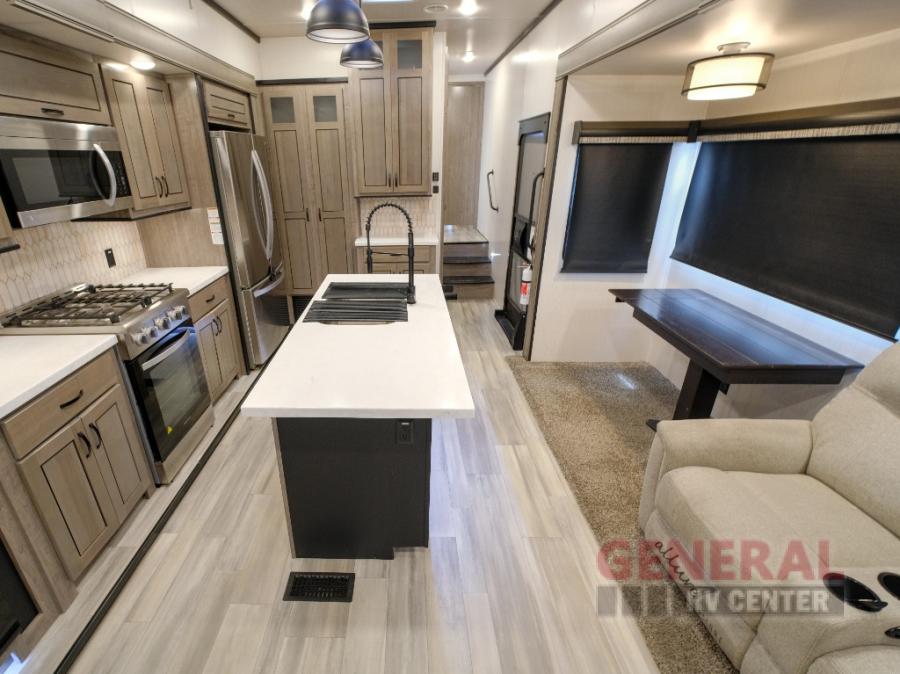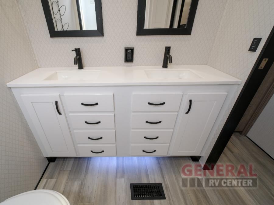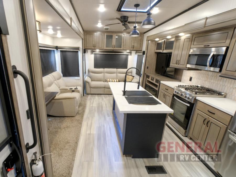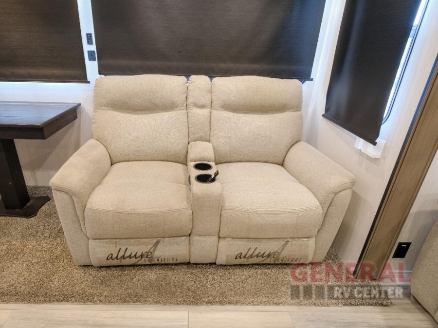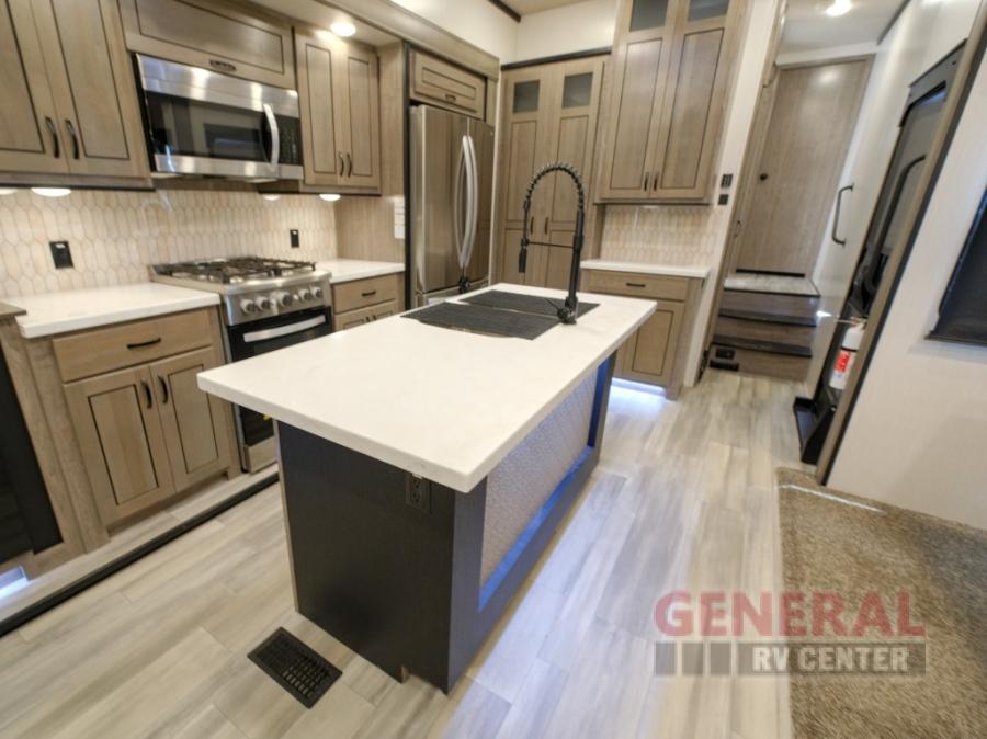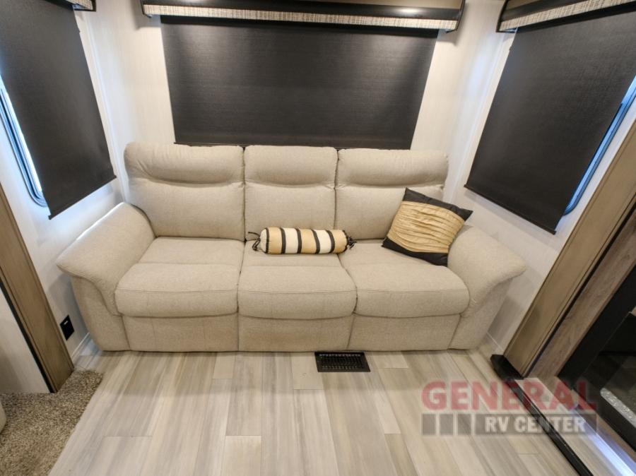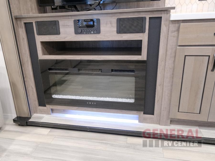 Enjoy a relaxing camping trip with this fifth wheel! The rear living area has a hide-a-bed sofa and power theater seating with USB charging across from an entertainment center with a fireplace and 50" flat screen TV to watch your favorite movies. The chef can prepare their best meals with the kitchen island and if you want an easier clean up time then add a dishwasher to the island. The full bathroom has a 48" x 30" shower with a seat to wash the sand out of your hair after a fun day at the beach and a dual sink vanity for two to get ready at once. The king bed slide in the front private bedroom welcomes you to enjoy a good night's rest and the front wardrobe has storage shelves and an area prepped to add a washer and dryer for you to have clean clothes throughout your entire trip!