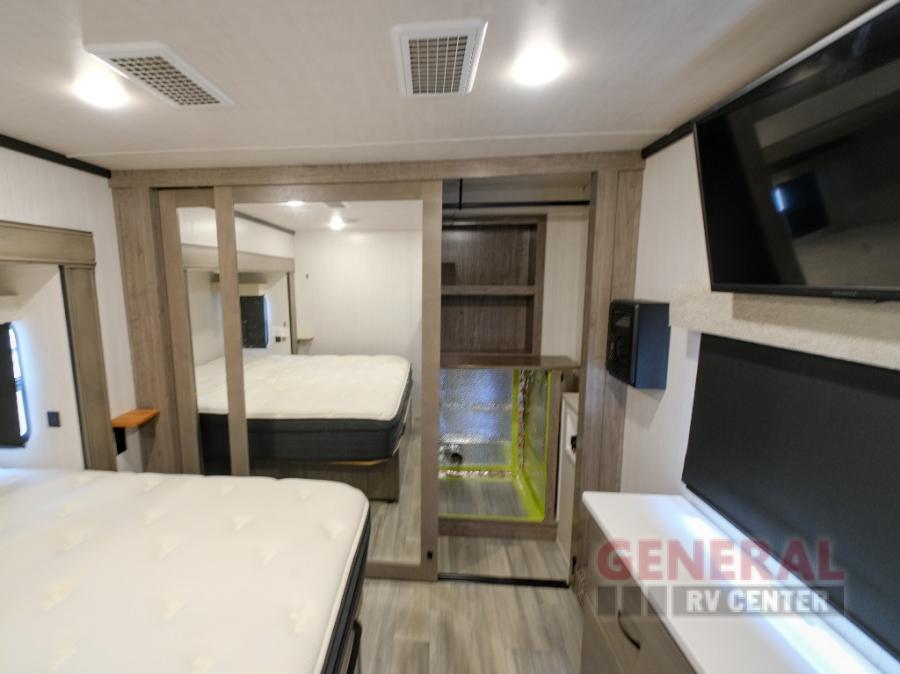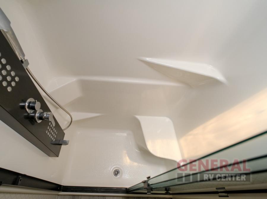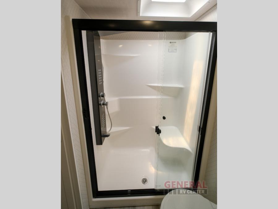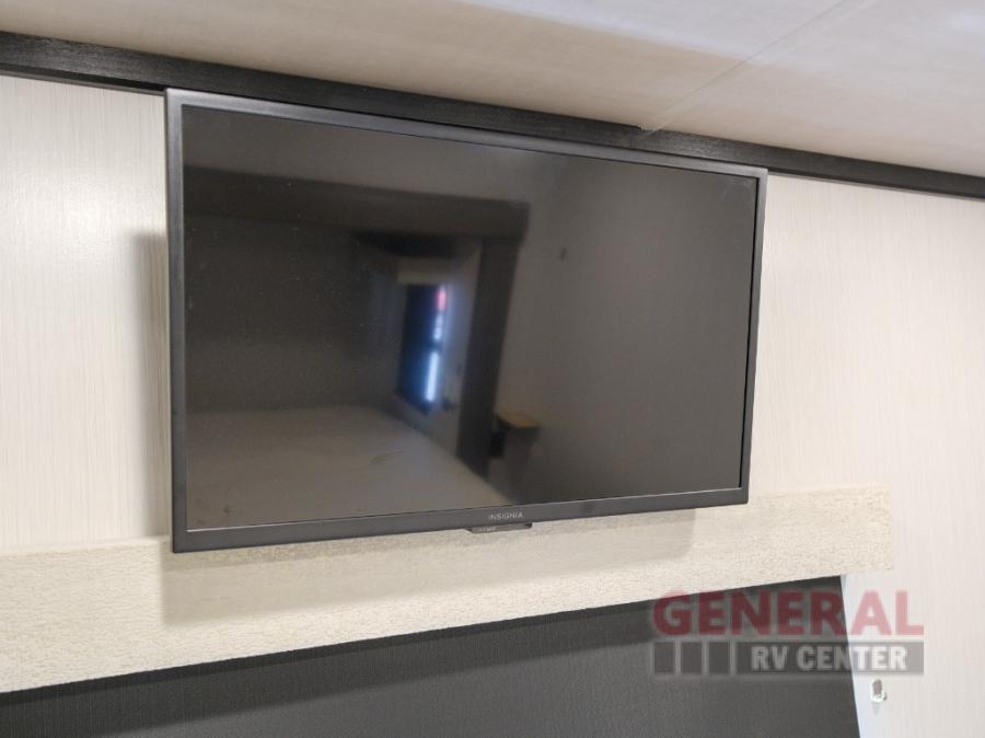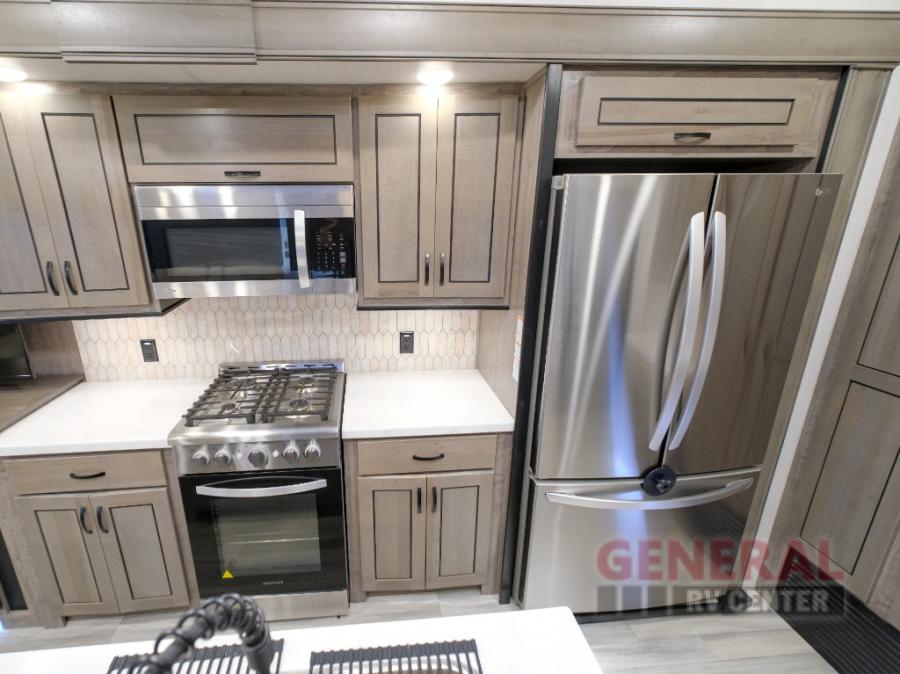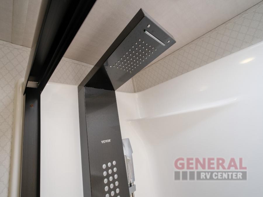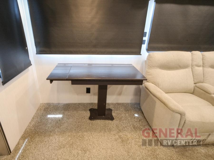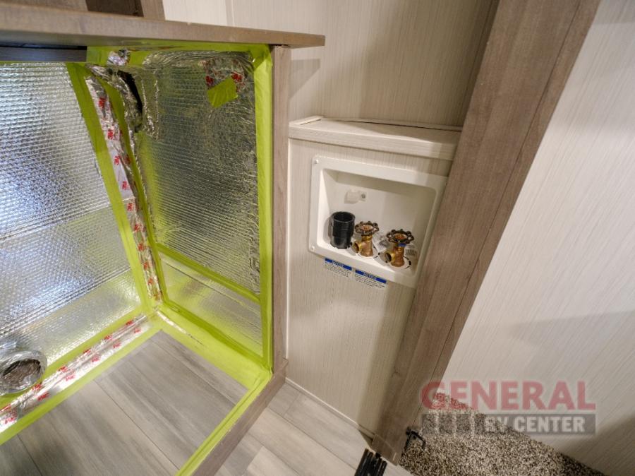 Enjoy a relaxing camping trip with this fifth wheel! The rear living area has a hide-a-bed sofa and power theater seating with USB charging across from an entertainment center with a fireplace and 50" flat screen TV to watch your favorite movies. The chef can prepare their best meals with the kitchen island and if you want an easier clean up time then add a dishwasher to the island. The full bathroom has a 48" x 30" shower with a seat to wash the sand out of your hair after a fun day at the beach and a dual sink vanity for two to get ready at once. The king bed slide in the front private bedroom welcomes you to enjoy a good night's rest and the front wardrobe has storage shelves and an area prepped to add a washer and dryer for you to have clean clothes throughout your entire trip!