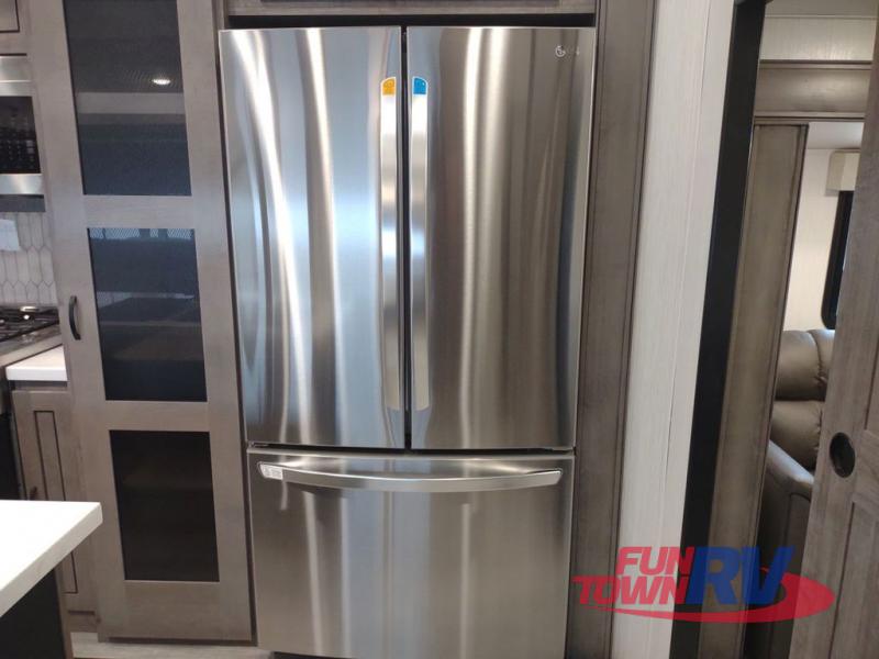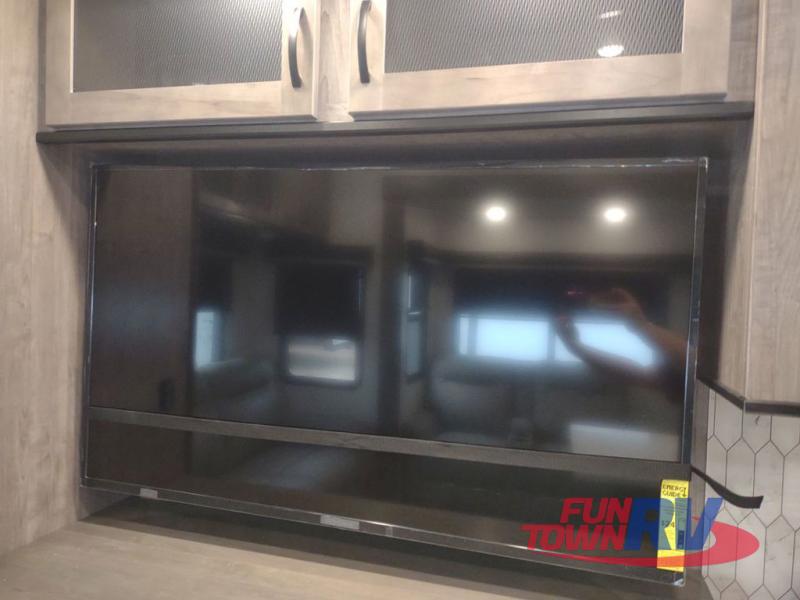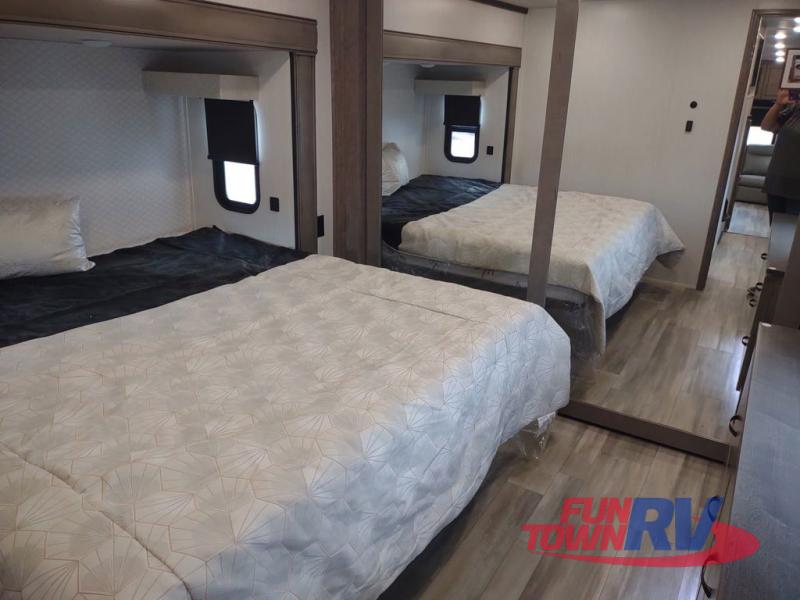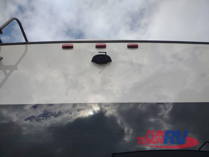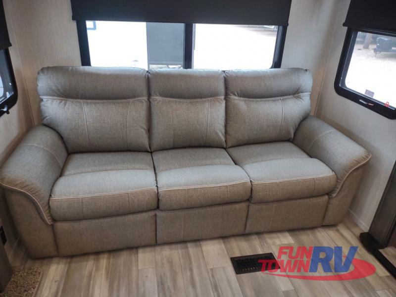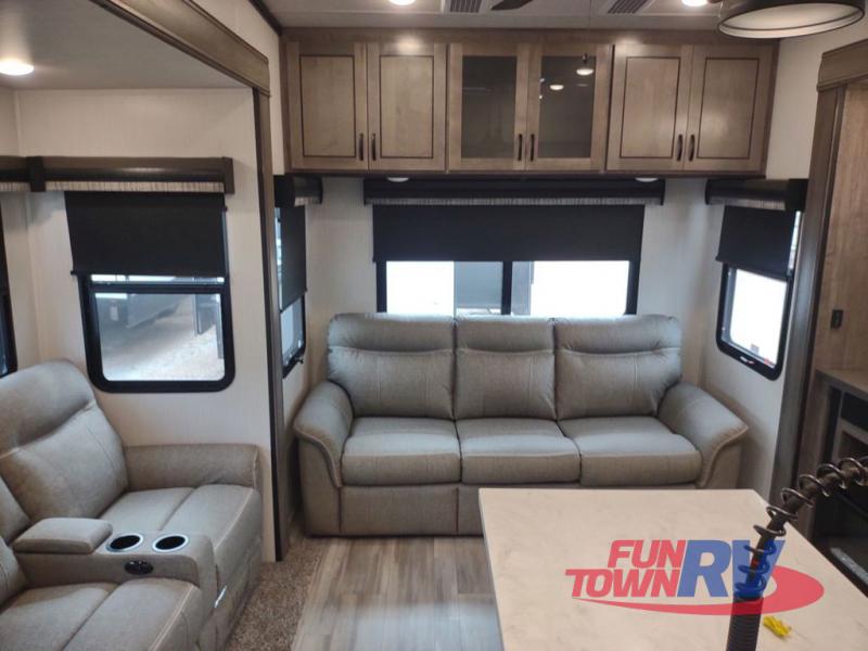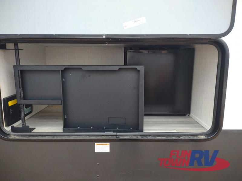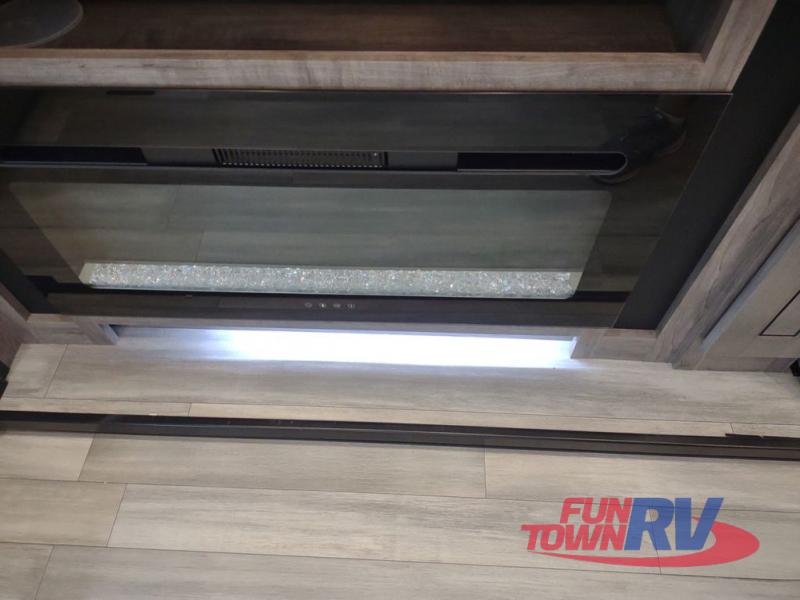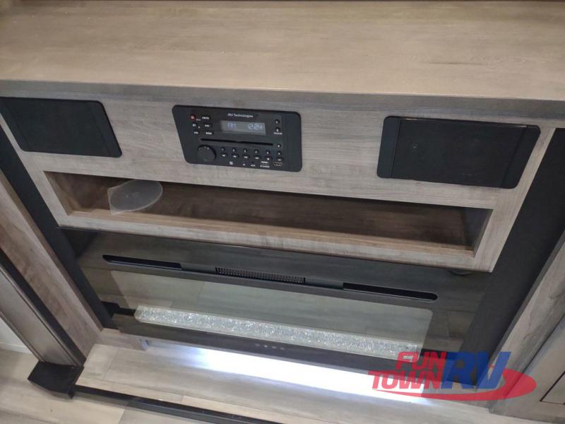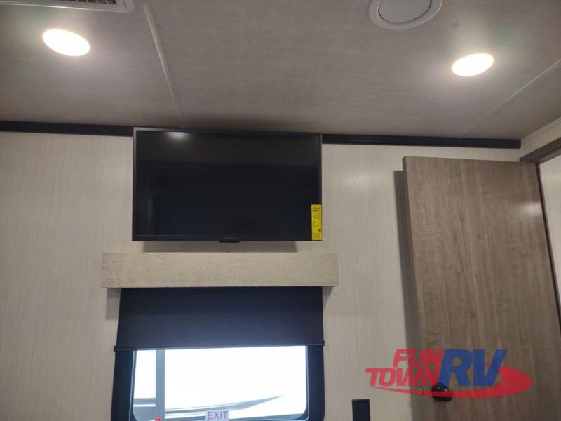 With two bedrooms in this fifth wheel, the whole family can camp together! The front private bedroom has a king bed slide to lay your head at night, a dresser with a TV, and a front wardrobe with storage shelves to keep your clothes looking nice. The second bedroom has a 91" x 64- 3/4" loft above a tri-fold sofa slide that is across from an area for a TV and wardrobe, and you could even switch out the sofa for an optional 73" desk to get some work done while you are away. Everyone can freshen up in the full bathroom with a shower with a seat and their bellies full with a kitchen island and 20 cu. ft. stainless steel refrigerator with ice maker. And for easy clean up add the optional dishwasher to the kitchen island. You can even cook your meals while breathing in some fresh air with the exterior camp kitchen. After a fun day outdoors, head to the rear living area and relax on either the hide-a-bed sofa or the power theater seating across from the fireplace and 50" flat screen TV!