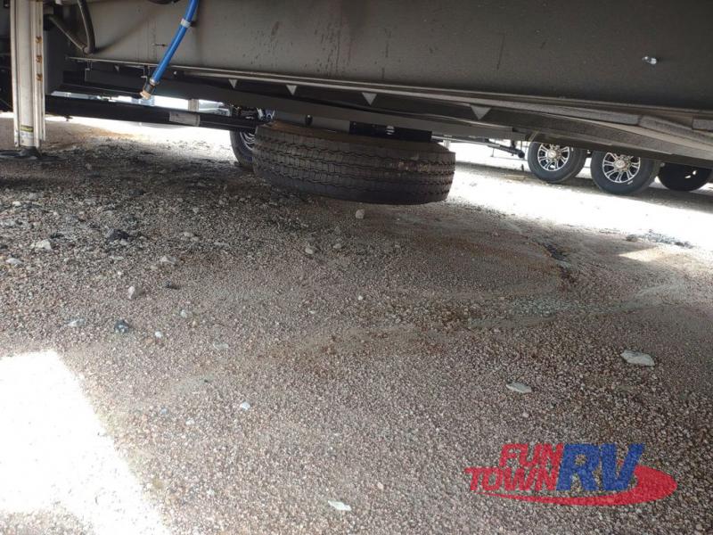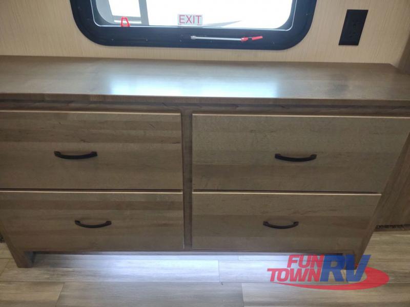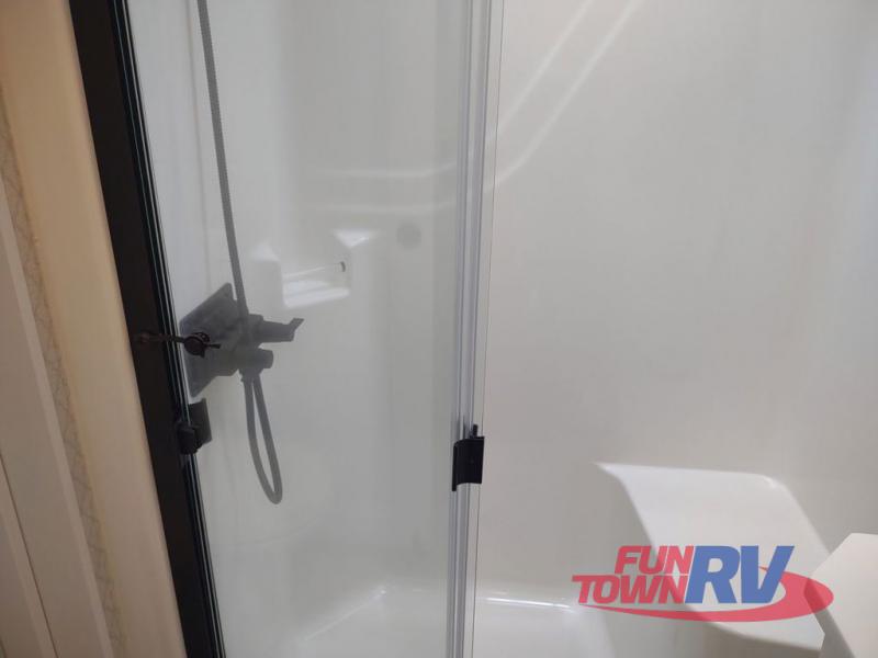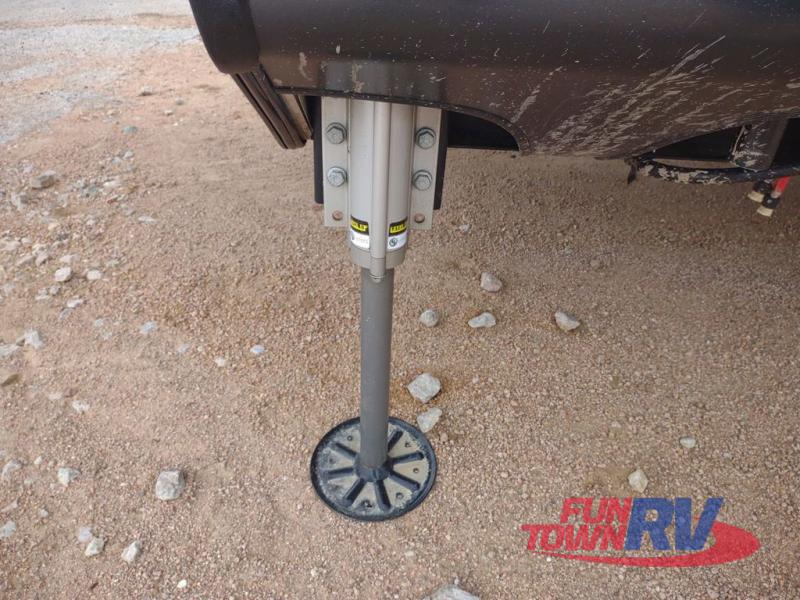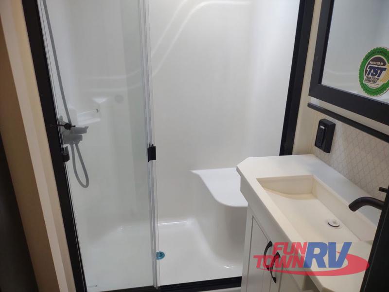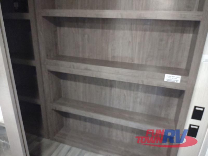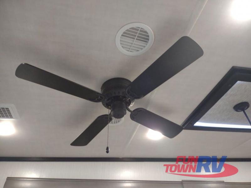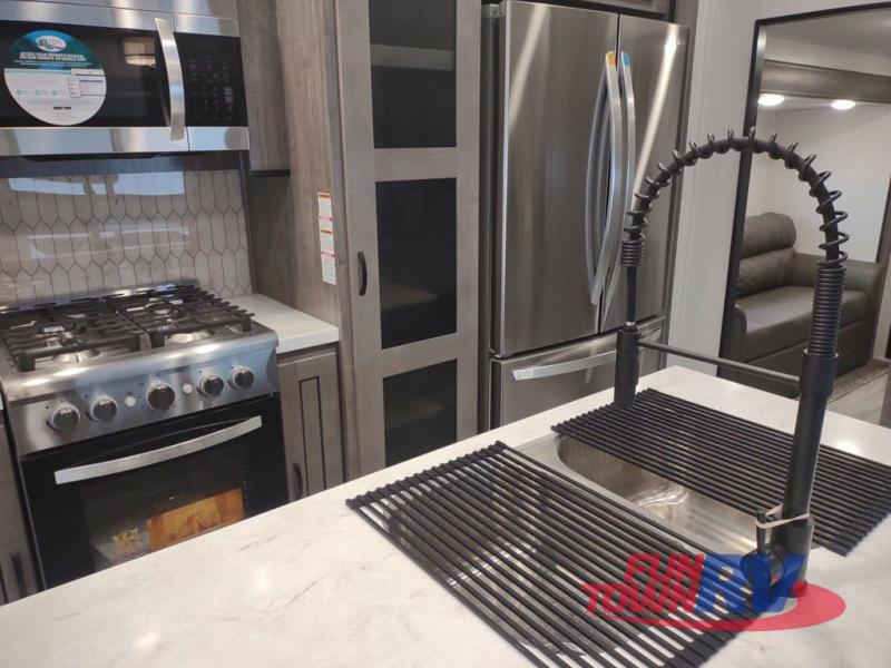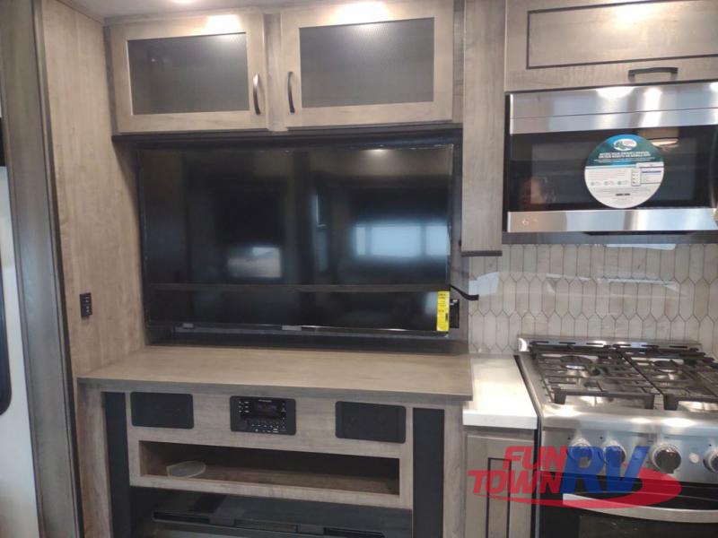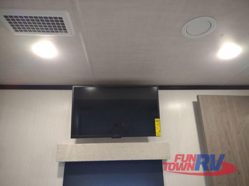 With two bedrooms in this fifth wheel, the whole family can camp together! The front private bedroom has a king bed slide to lay your head at night, a dresser with a TV, and a front wardrobe with storage shelves to keep your clothes looking nice. The second bedroom has a 91" x 64- 3/4" loft above a tri-fold sofa slide that is across from an area for a TV and wardrobe, and you could even switch out the sofa for an optional 73" desk to get some work done while you are away. Everyone can freshen up in the full bathroom with a shower with a seat and their bellies full with a kitchen island and 20 cu. ft. stainless steel refrigerator with ice maker. And for easy clean up add the optional dishwasher to the kitchen island. You can even cook your meals while breathing in some fresh air with the exterior camp kitchen. After a fun day outdoors, head to the rear living area and relax on either the hide-a-bed sofa or the power theater seating across from the fireplace and 50" flat screen TV!