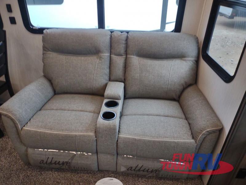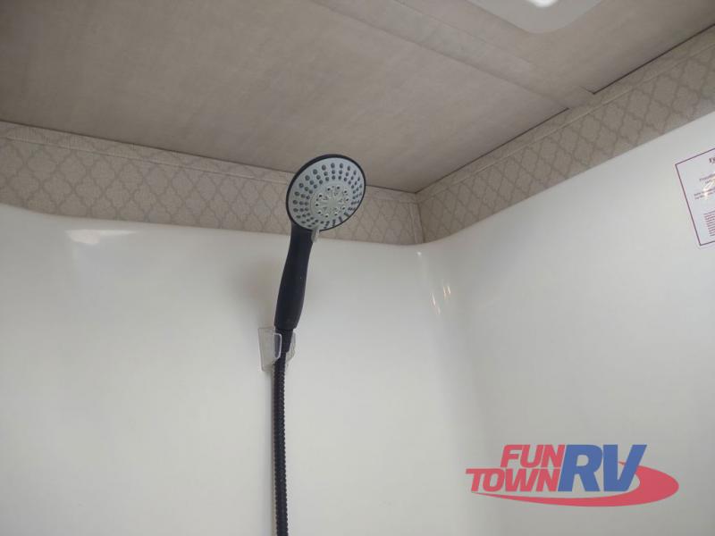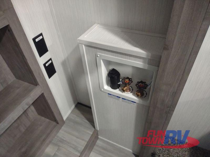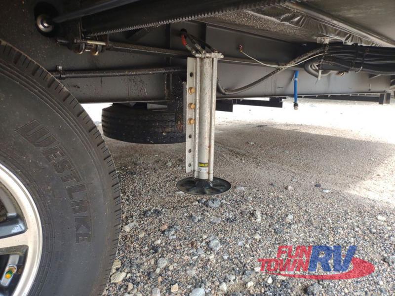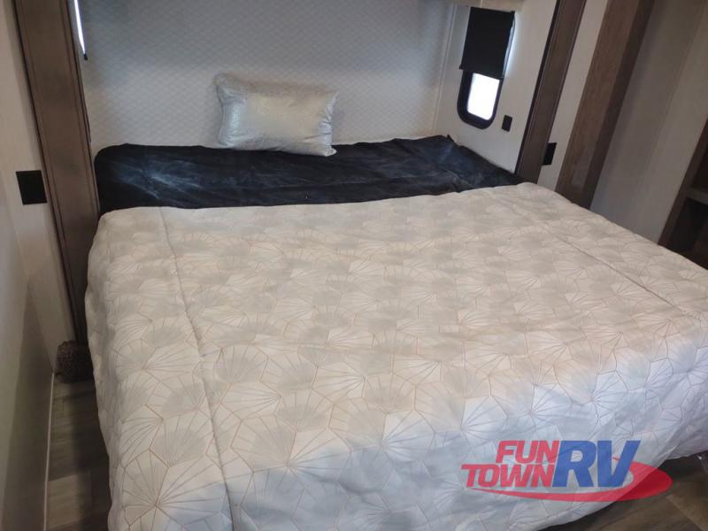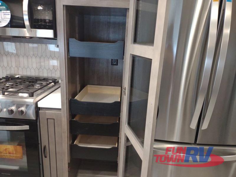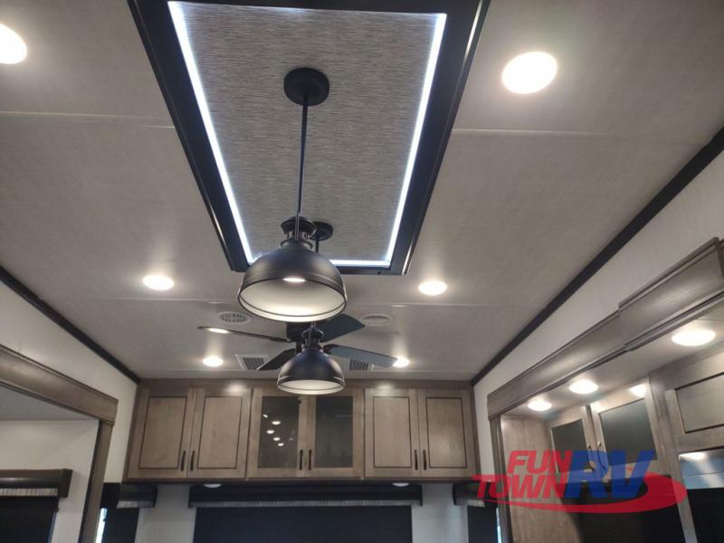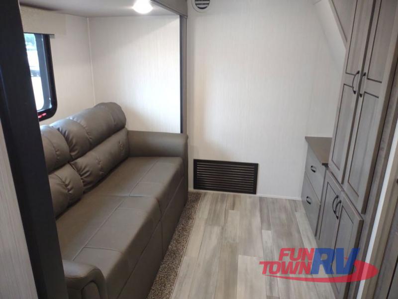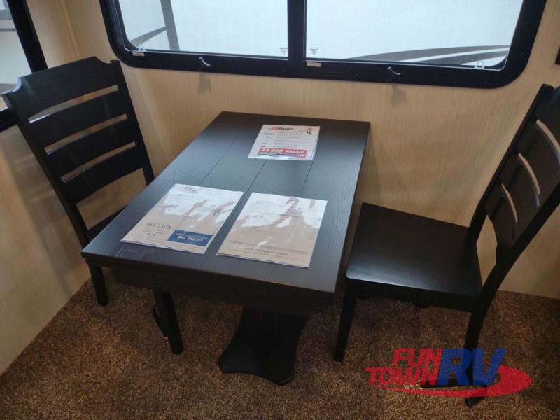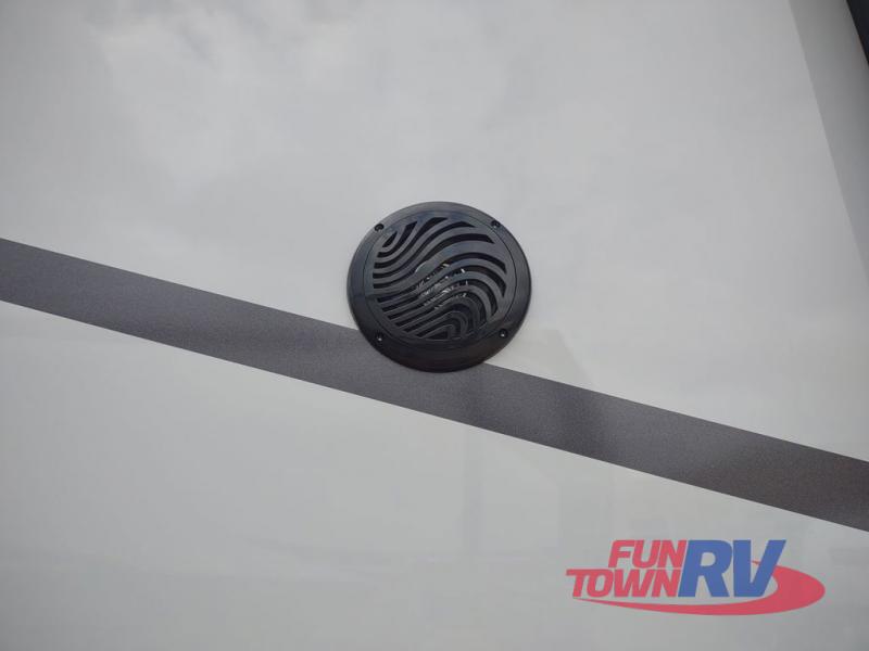 With two bedrooms in this fifth wheel, the whole family can camp together! The front private bedroom has a king bed slide to lay your head at night, a dresser with a TV, and a front wardrobe with storage shelves to keep your clothes looking nice. The second bedroom has a 91" x 64- 3/4" loft above a tri-fold sofa slide that is across from an area for a TV and wardrobe, and you could even switch out the sofa for an optional 73" desk to get some work done while you are away. Everyone can freshen up in the full bathroom with a shower with a seat and their bellies full with a kitchen island and 20 cu. ft. stainless steel refrigerator with ice maker. And for easy clean up add the optional dishwasher to the kitchen island. You can even cook your meals while breathing in some fresh air with the exterior camp kitchen. After a fun day outdoors, head to the rear living area and relax on either the hide-a-bed sofa or the power theater seating across from the fireplace and 50" flat screen TV!