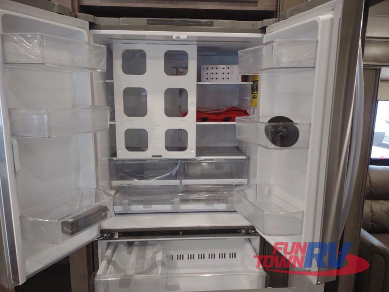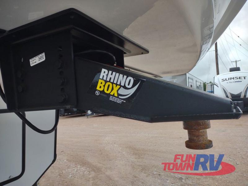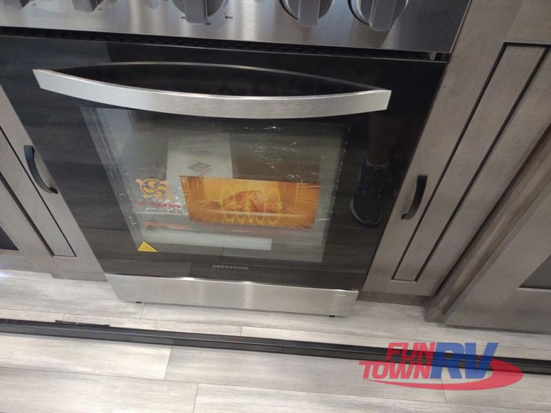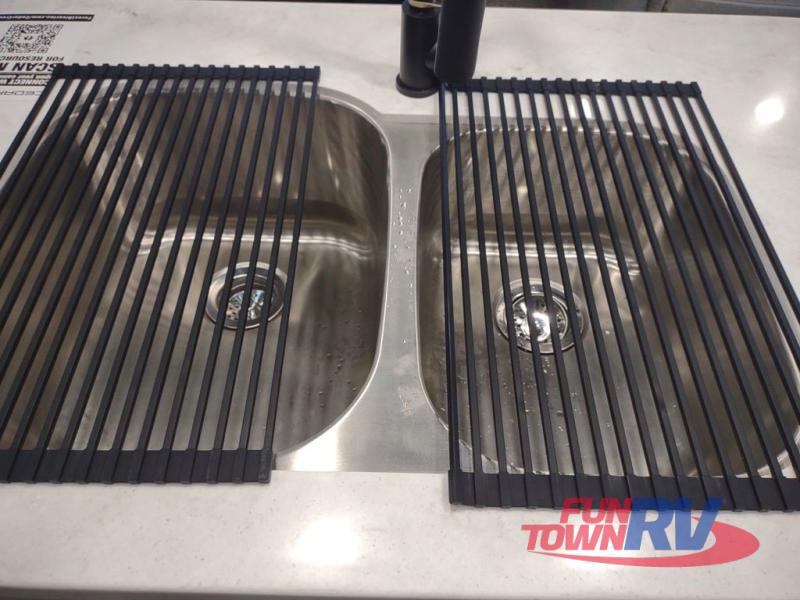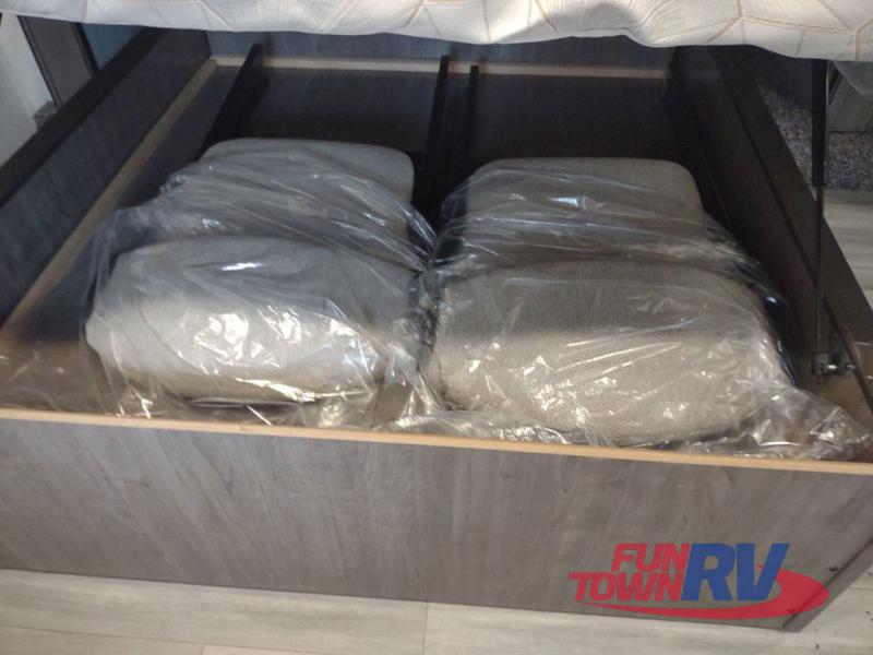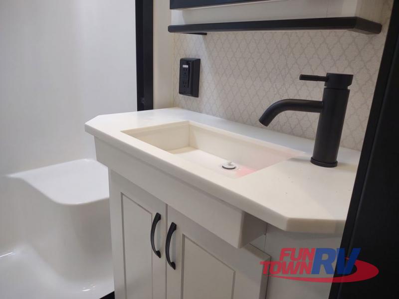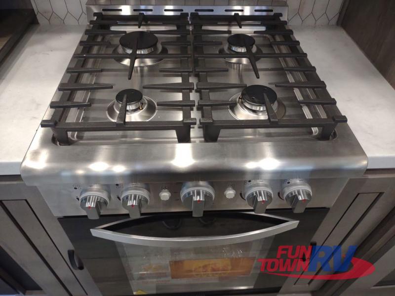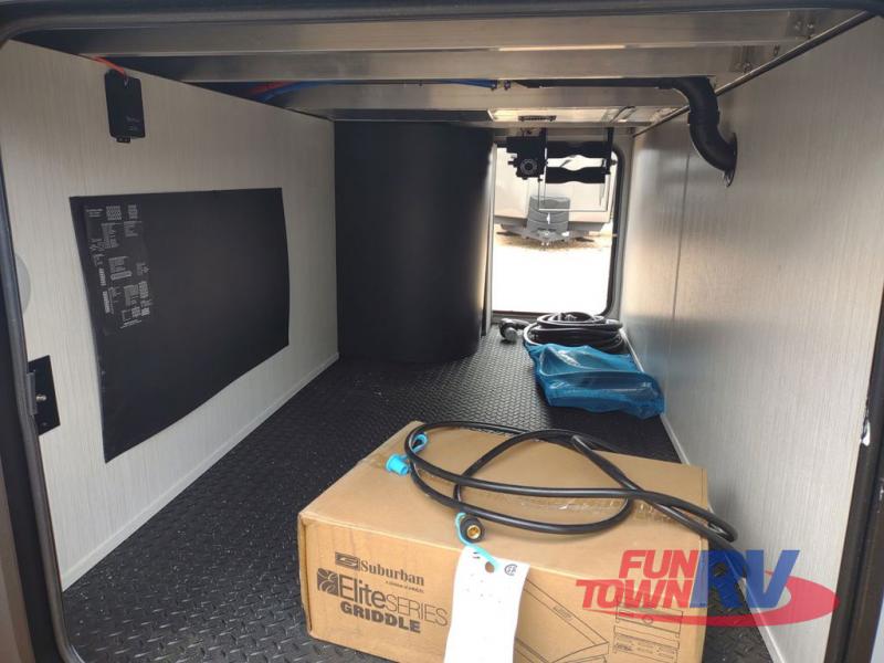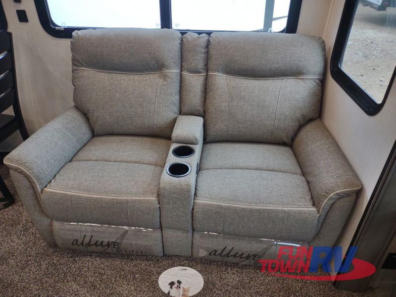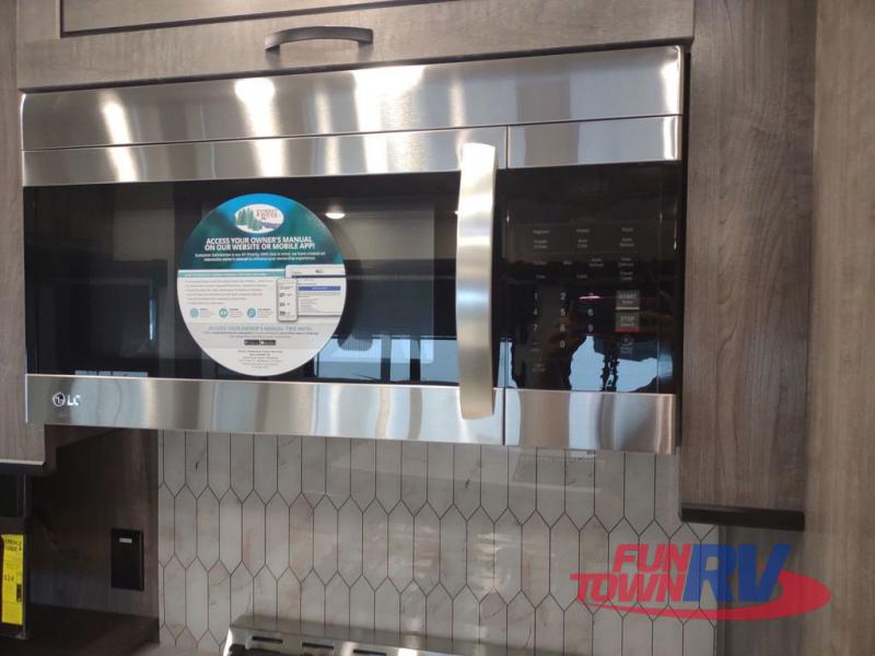 With two bedrooms in this fifth wheel, the whole family can camp together! The front private bedroom has a king bed slide to lay your head at night, a dresser with a TV, and a front wardrobe with storage shelves to keep your clothes looking nice. The second bedroom has a 91" x 64- 3/4" loft above a tri-fold sofa slide that is across from an area for a TV and wardrobe, and you could even switch out the sofa for an optional 73" desk to get some work done while you are away. Everyone can freshen up in the full bathroom with a shower with a seat and their bellies full with a kitchen island and 20 cu. ft. stainless steel refrigerator with ice maker. And for easy clean up add the optional dishwasher to the kitchen island. You can even cook your meals while breathing in some fresh air with the exterior camp kitchen. After a fun day outdoors, head to the rear living area and relax on either the hide-a-bed sofa or the power theater seating across from the fireplace and 50" flat screen TV!