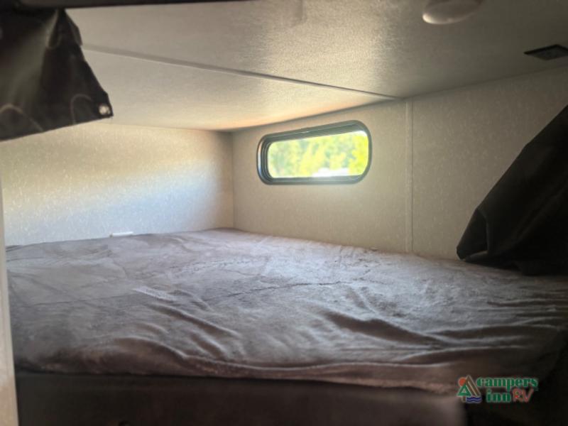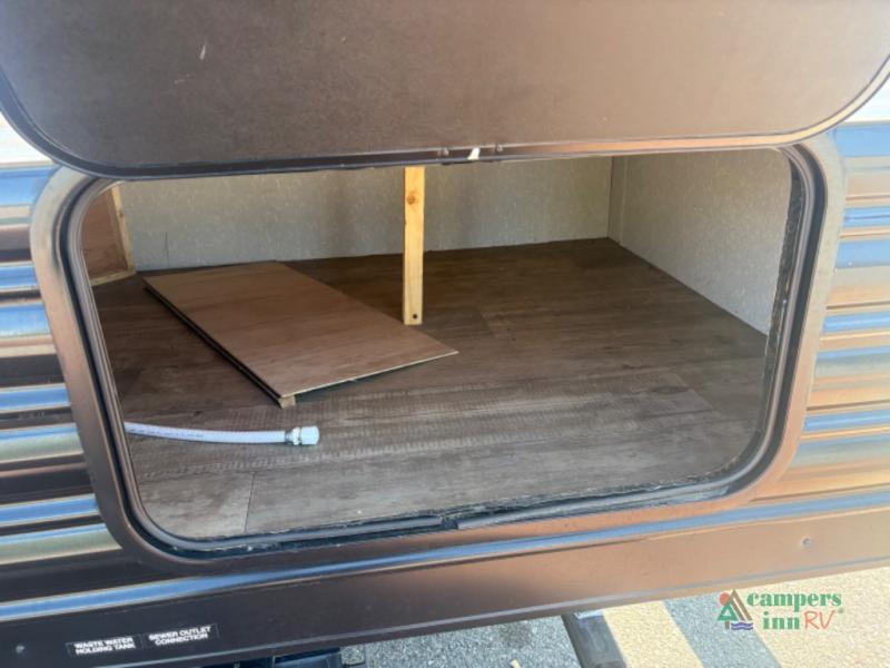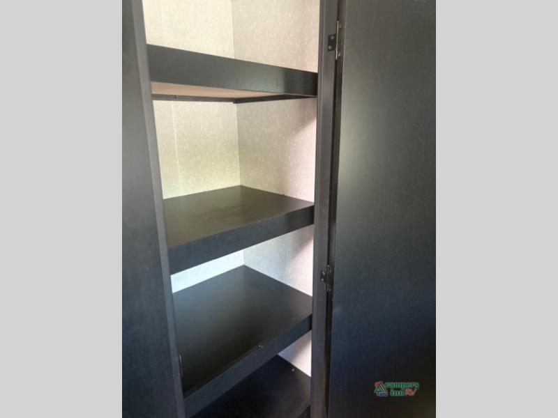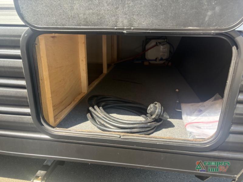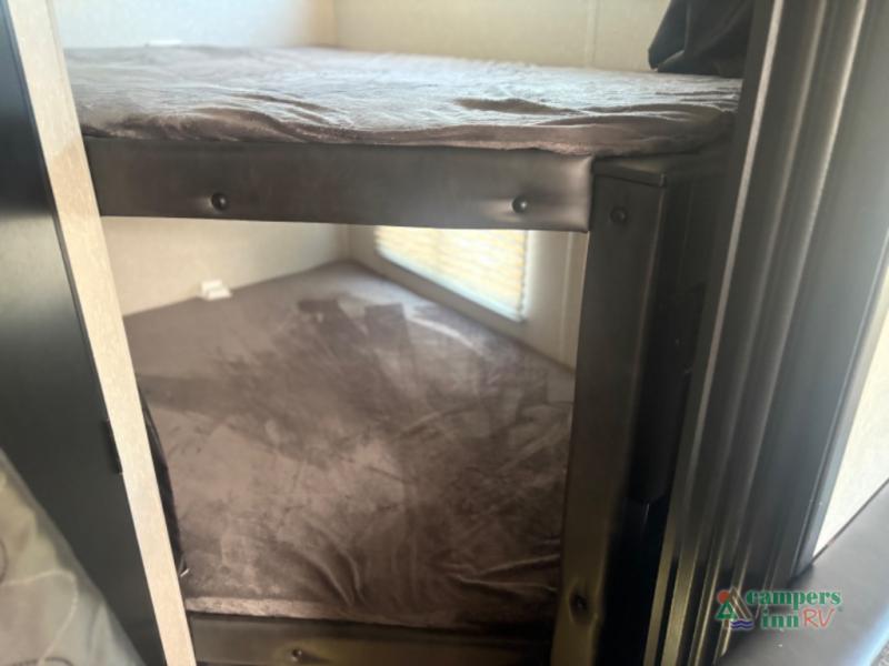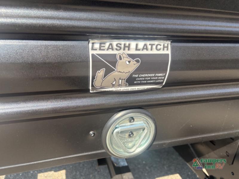 Come on inside this Cherokee Grey Wolf travel trailer and experience the convenience of a smooth flow of traffic in and out with two entry doors. The rear door leads into a full bath which is great for accessibility when outside and when you need to use the bathroom. Once inside, you will notice the large U-shaped dinette and the sofa which sit on the slide and create a spacious footprint for moving about, as well as great places to play games and socialize with your friends and family. A walk-in pantry provides plenty of storage allowing you to stock up on your favorite snacks and dry goods for your family adventure. At night, there is sleeping space for everyone between the double-size bunks and the queen-size bed, plus the furniture.