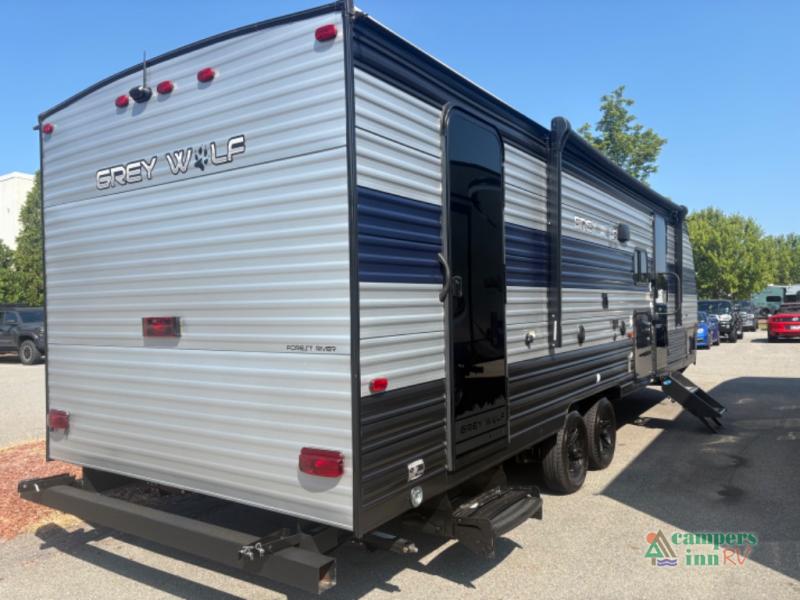 Whether it's a journey that will take you to new locations or a tried-and-true getaway to that favorite and memorable destination, the Forest River Cherokee Grey Wolf travel trailers and toy haulers are going to make the trip worth it every single time! You can travel in confidence with the premium wheel package, seamless roofing membrane with heat reflectivity, Power Gear frame technology with space-saver rail design, and Cherokee back-up camera system. The Cherokee Grey Wolf's interior is highly attractive with its stainless steel kitchen suite package, premium bedding ensemble and comforter, and 8" ceiling-mounted subwoofer with accent lighting. You will also find a black waste tank flush-out kit, an outside shower with hot and cold water, an armored underbelly tank enclosure, a power tongue jack, and an RV grill quick connect.