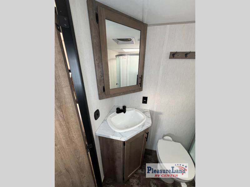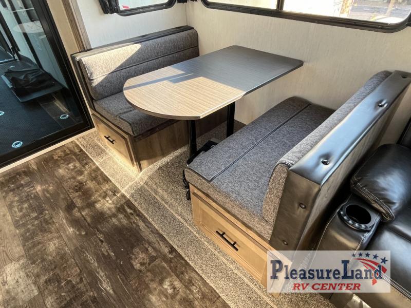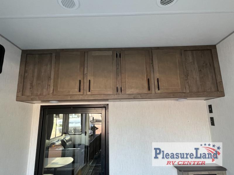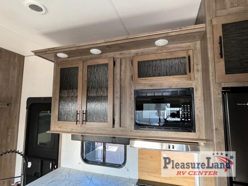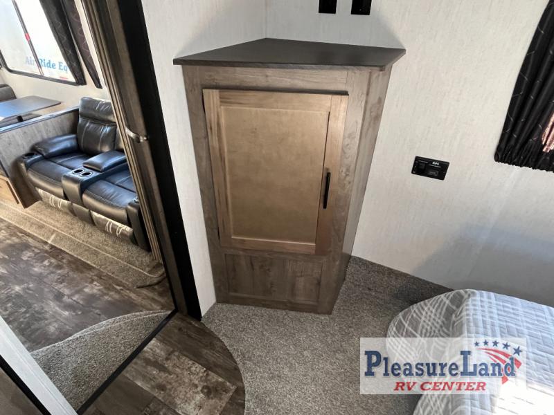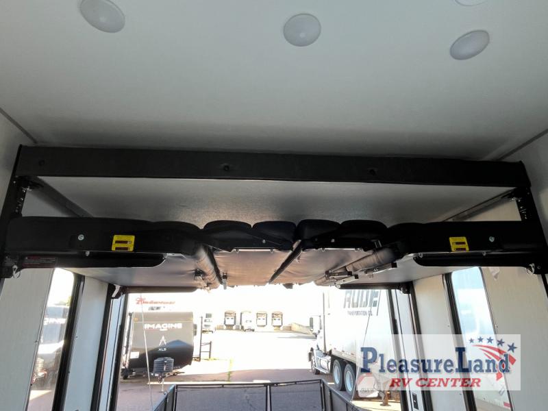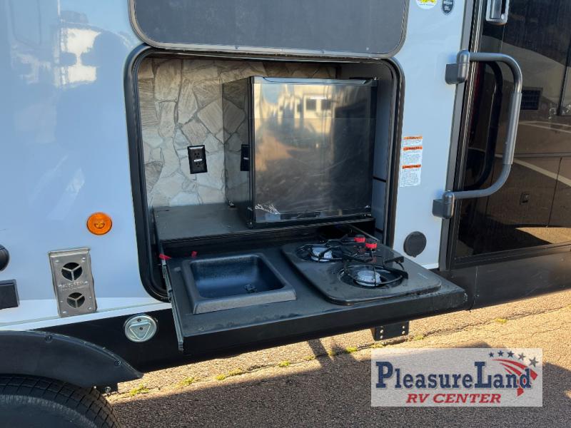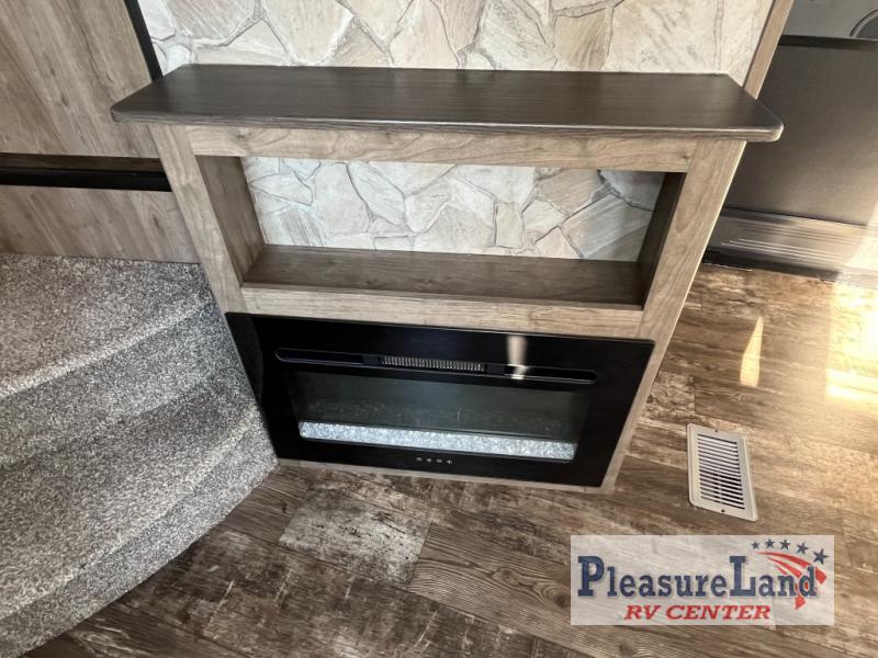 With dual entry doors, you will experience a smooth flow of traffic in and out of this toy hauler! One of the entrances leads into the 12' garage area with a folding dinette table below a Happijac bed lift system, and an area prepped to add an optional washer and dryer. The chef will have everything they need to prepare their best home cooked meals indoors or they can head to the outside kitchen to breathe in some fresh air while they cook. Gather together at the booth dinette for game night or relax on the sofa across from the entertainment center with a fireplace. When you're ready to wind down your nights, clean up in the dual entry bathroom with the radius shower then head directly into the front private bedroom where you can rest your head on the 67" x 74" Wolf Pack king bed!