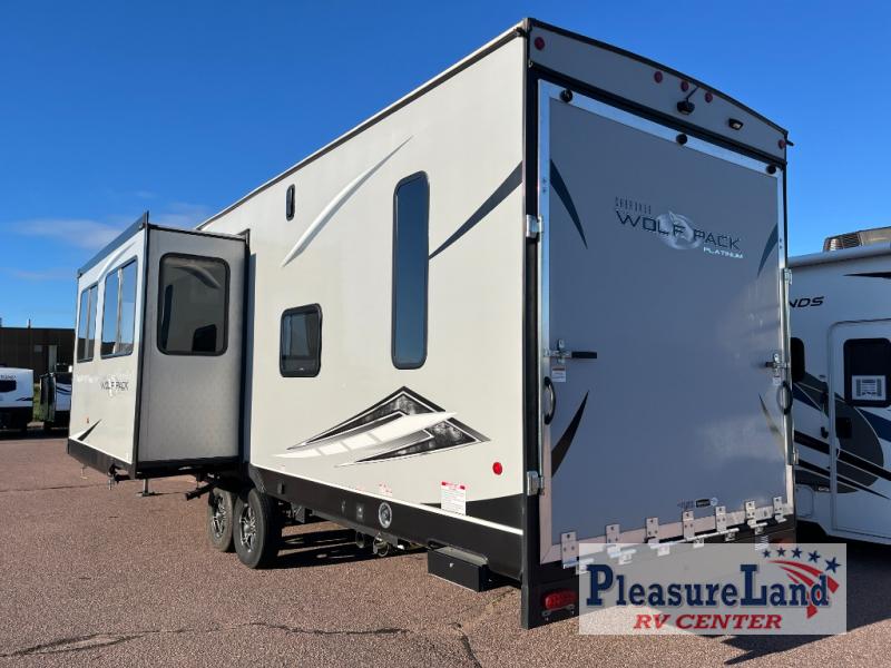 Run with the pack in any one of these Forest River Cherokee Wolf Pack toy haulers! They are affordable and versatile with a 102" widebody design to pack in all of the necessary features for a great adventure with your family and toys. The grey high gloss gel exterior will turn heads on the highway and the LED interior/exterior lights will make life easier. An outside shower with hot and cold water helps to keep the mud outside where it belongs. With an external 30 gallon fuel station, you won't have to worry about your toys being low on fuel. The Platinum package adds extra conveniences like a ramp door patio deck railing system, a Happijac bed lift system, and an industrial rubber garage floor on enclosed garage models. Come find the perfect model for you today!