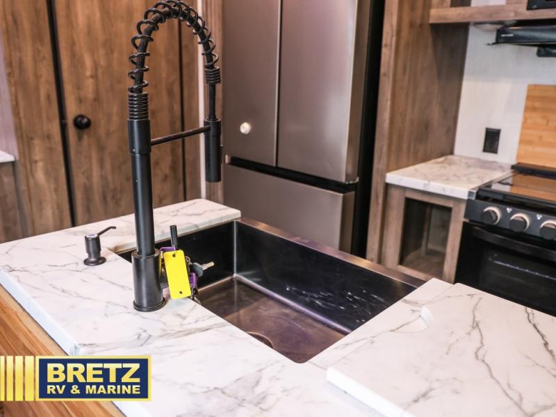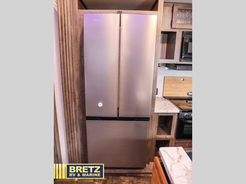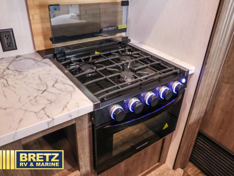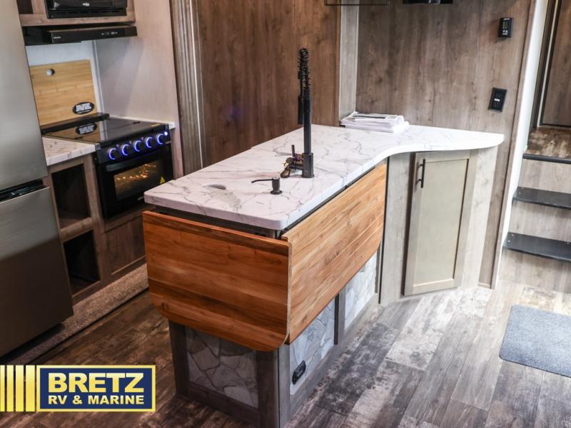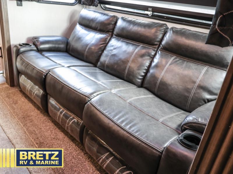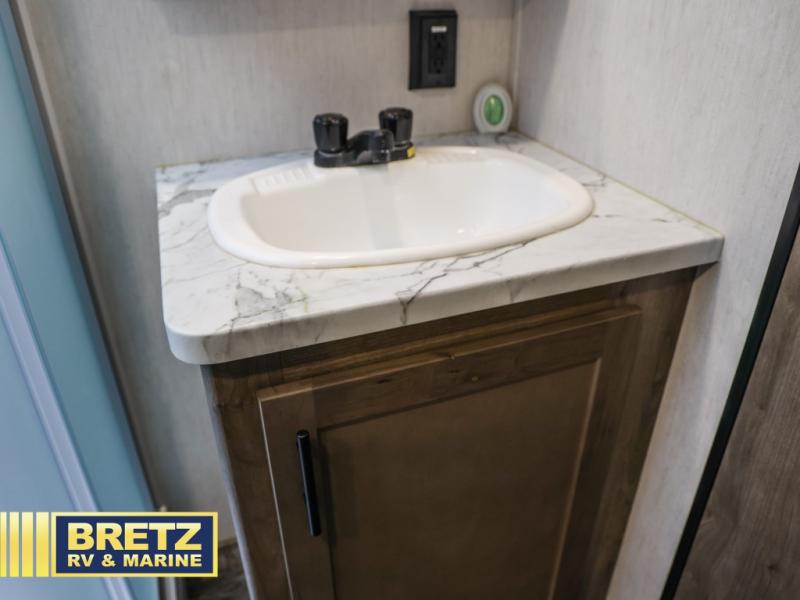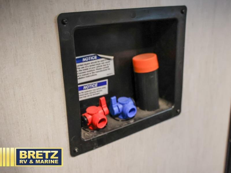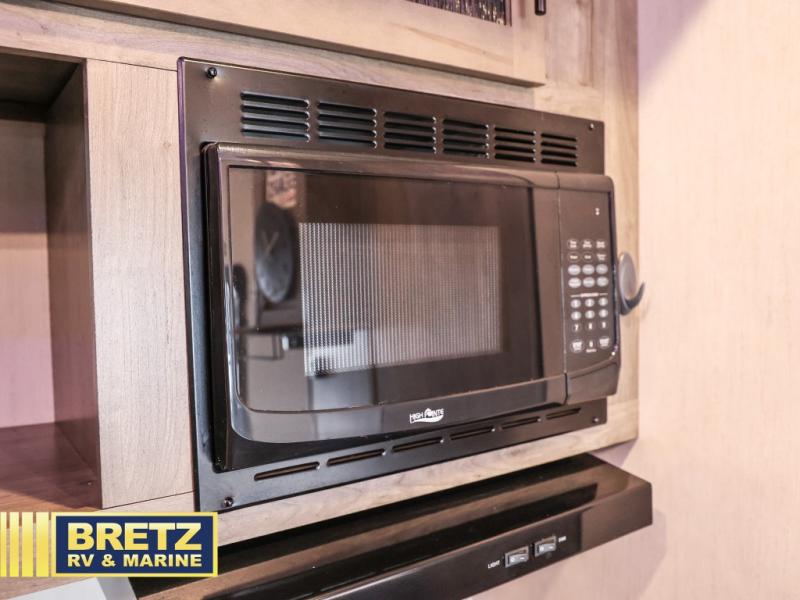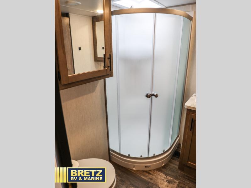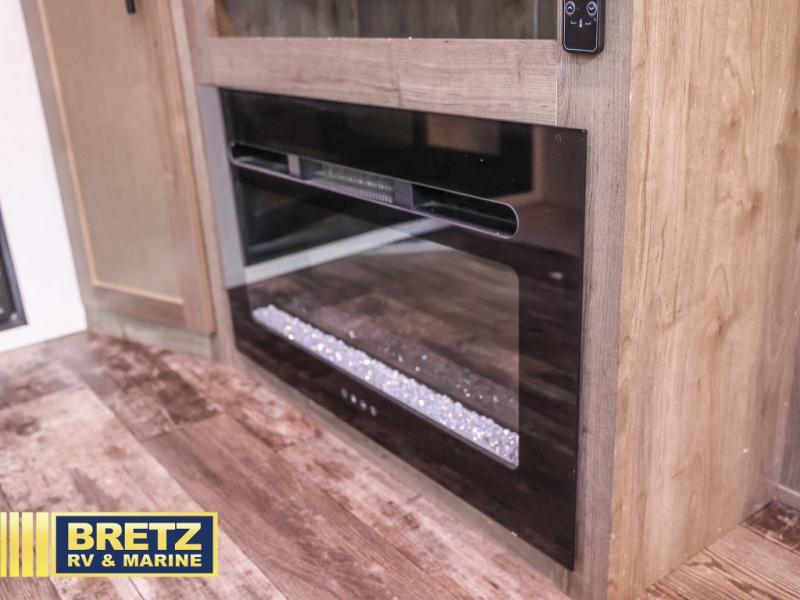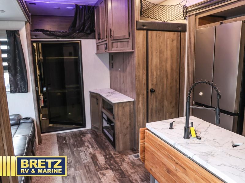 If you need a toy hauler big enough for your whole gang and your toys then look no further! It features a wrap-around loft above the 13' garage area which has a folding dinette table below a Happijac bed lift system, an area prepped to an optional washer and dryer, and a half bathroom, plus there is one of the dual entry doors to the unit and a 96" x 96" ramp door "party patio". The U-shaped dinette is great for meals, games, and even sleeping but it can be switched out for the optional party recliner sofa instead. You also have a great view from here of the entertainment center with a fireplace. After enjoying a good night's rest on the 67" x 74" Wolf Pack king bed in the front private bedroom, you can head directly into the dual entry bathroom to freshen up in the radius shower!