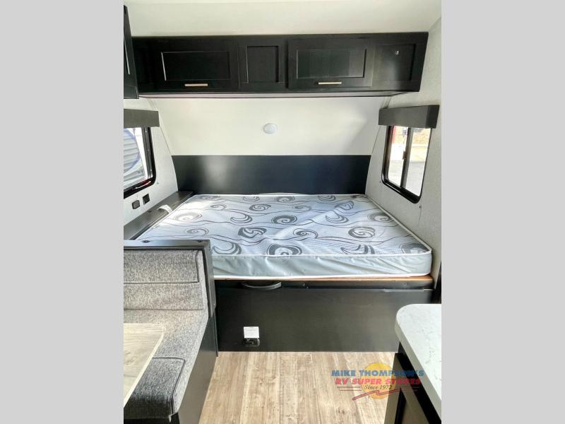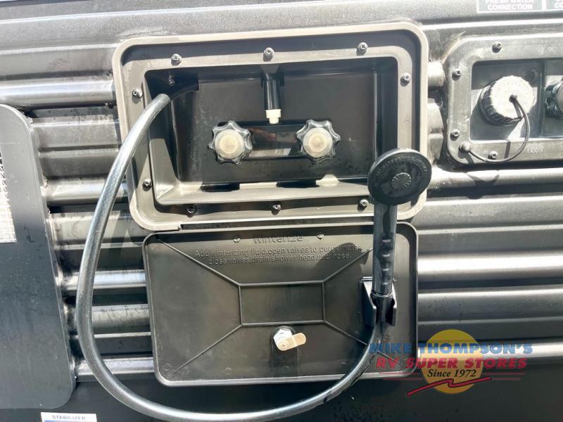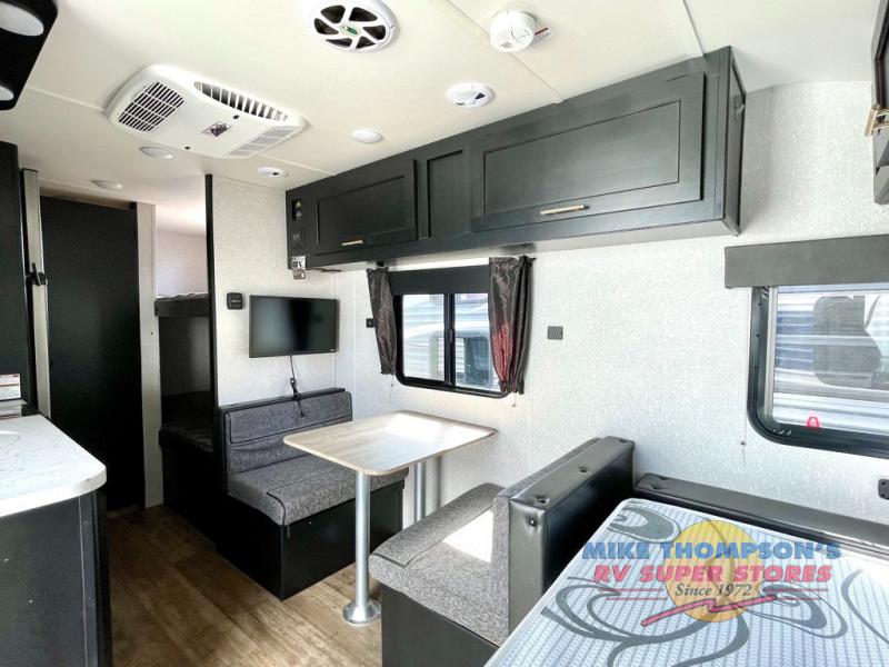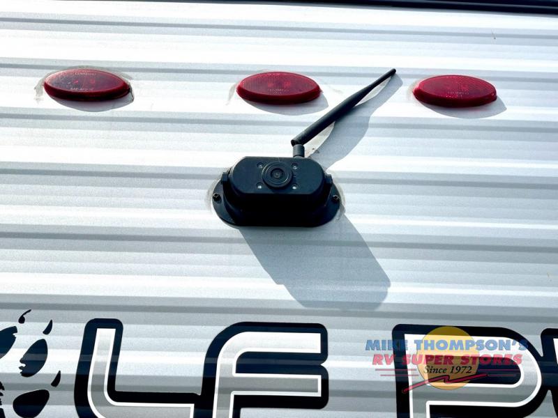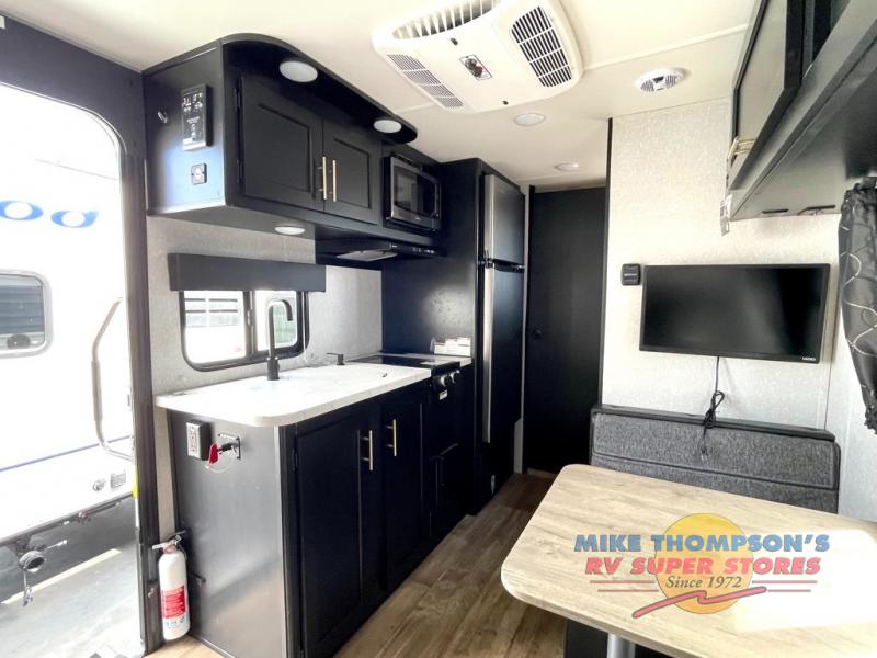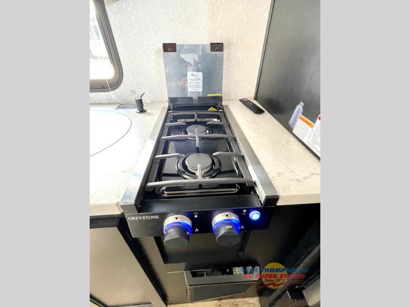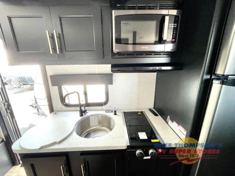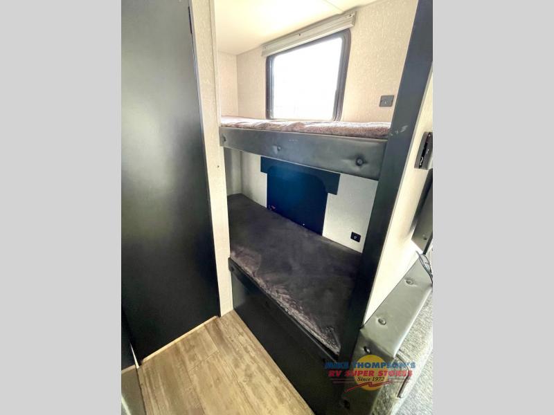 The whole family can sleep comfortably in this travel trailer! It has a set of bunk beds for the kids to sleep on with a TV mount location for extra entertainment, and you can sleep comfortably on the front queen bed with overhead cabinets and a shelf. There is even an exterior pack and play door that accesses the storage space under the bottom bunk. The chef will enjoy preparing their best home cooked meals either indoors with the high output cooktop or at the outside mini kitchen while staying protected by the 12' power awning, plus you have an outside TV mount location for added entertainment while you cook!