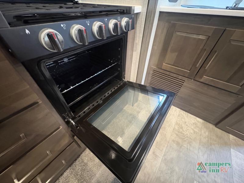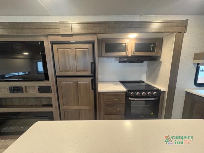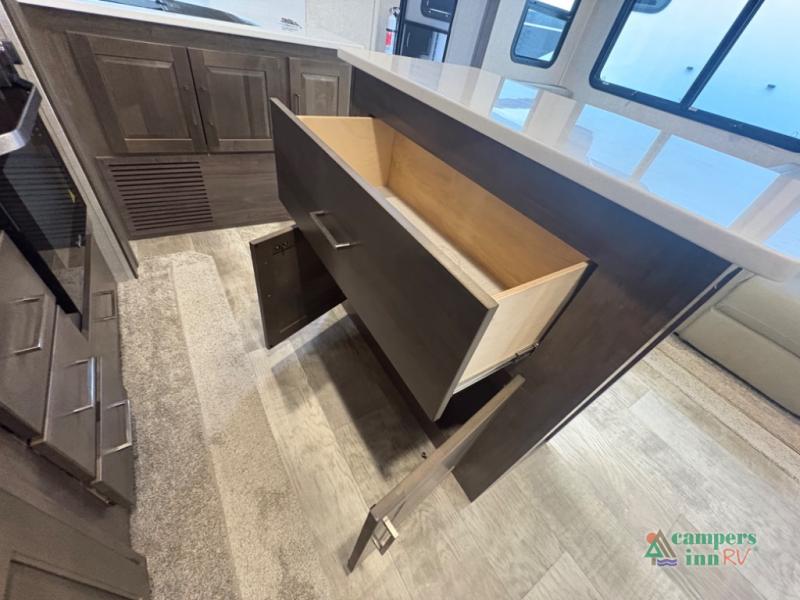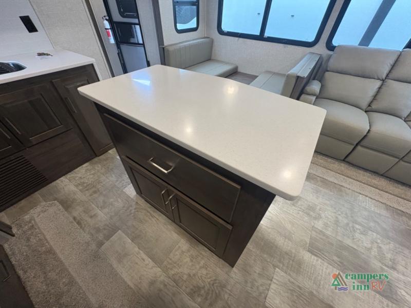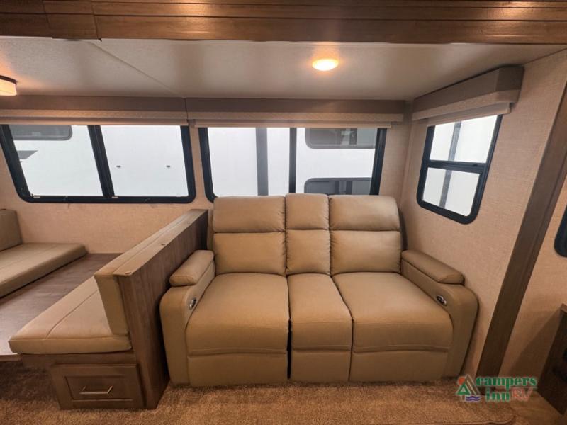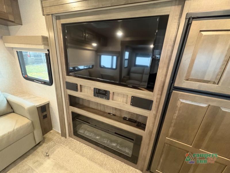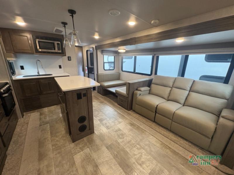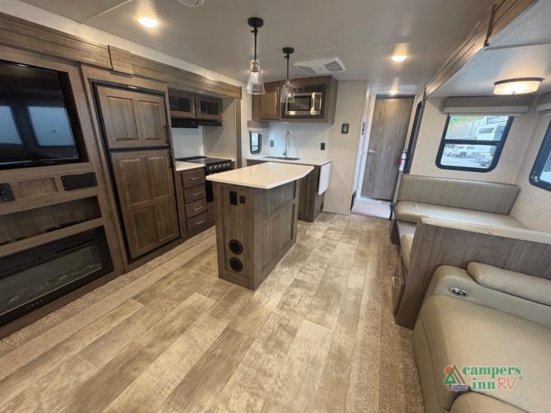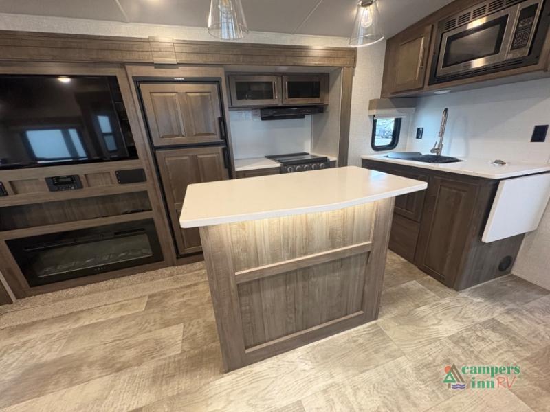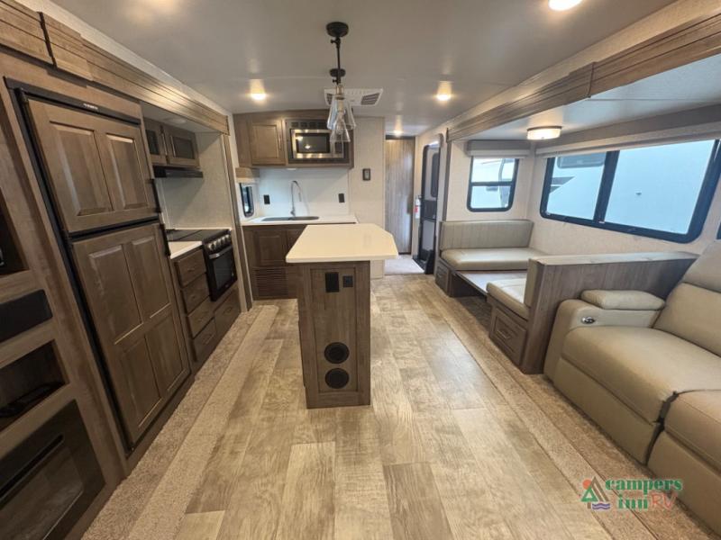 If you enjoy entertaining friends while camping, this trailer offers seating for nine in the combined living and kitchen area on the hide-a-bed sofa, the theater seats and the booth dinette. Everyone can visit, watch the LED TV and enjoy the fireplace all while the cook is preparing snacks in the kitchen with full amenities. The snacks and drinks can be served from the center island, and everyone can enjoy all the views out of the windows along the rear and door side wall. The full bathroom has two entries for convenience, and the front bedroom offers a queen bed slide for more floor space or choose a king option, plus plenty of storage. And the two 11' awnings offer an outdoor living area after you add your camping chairs.