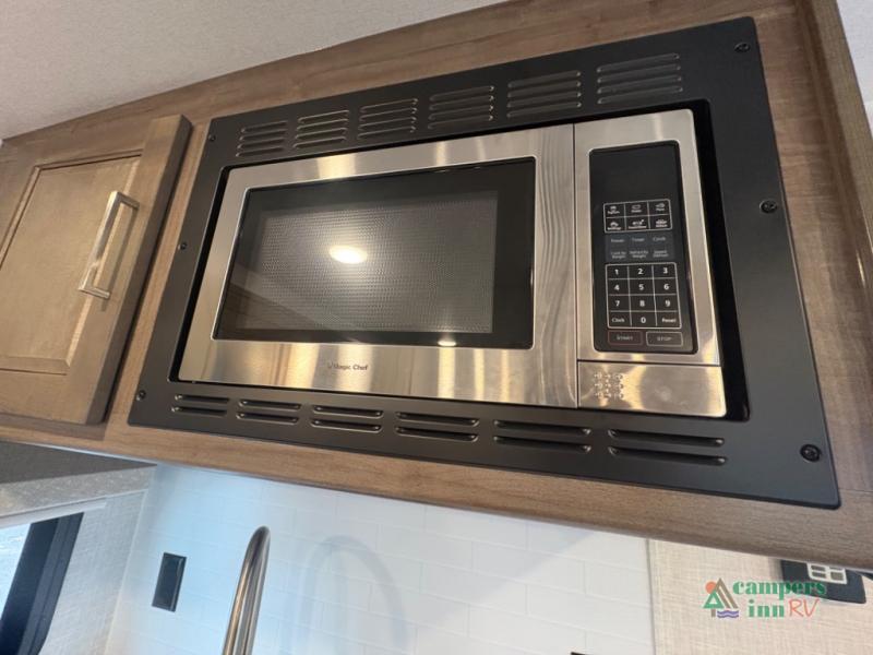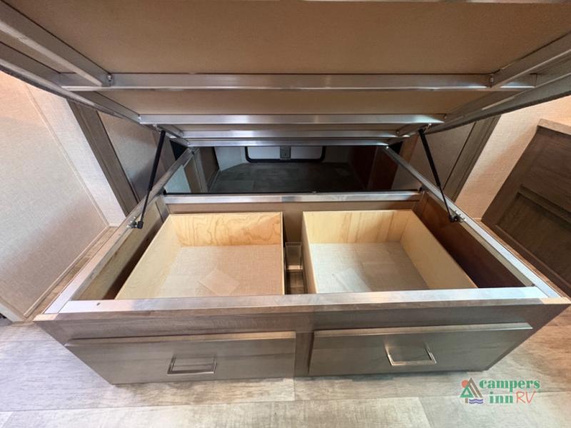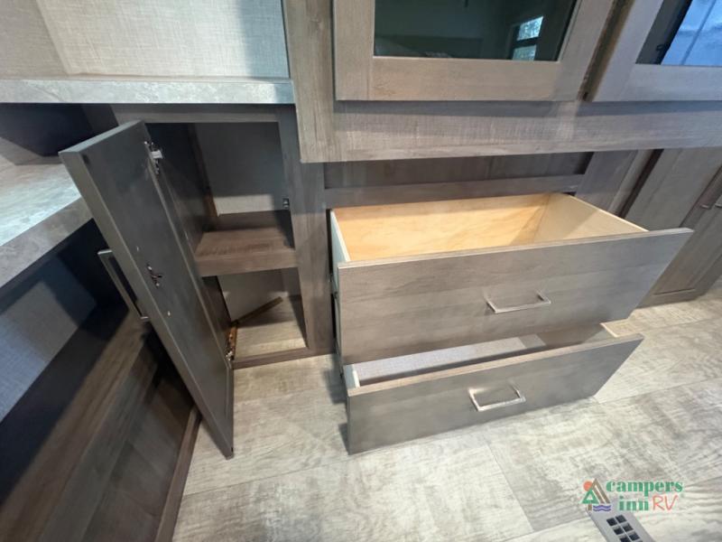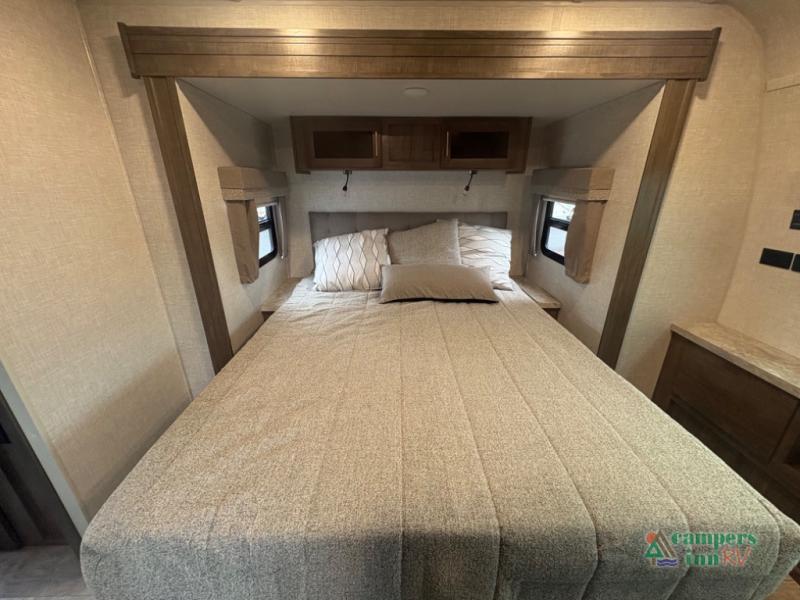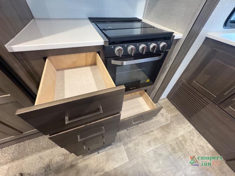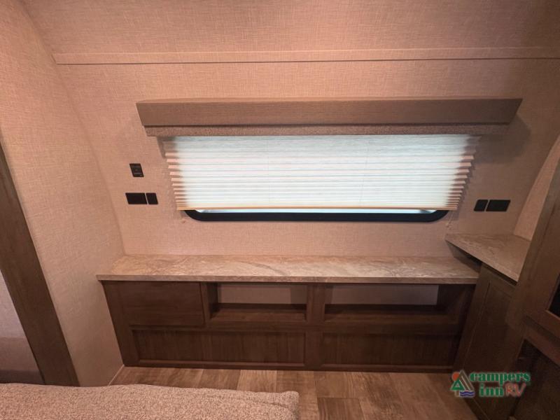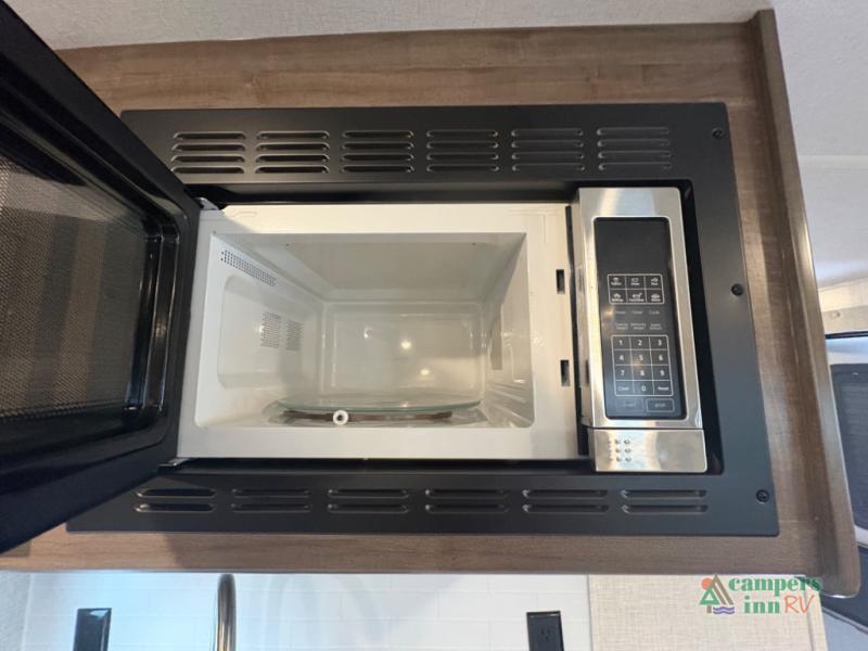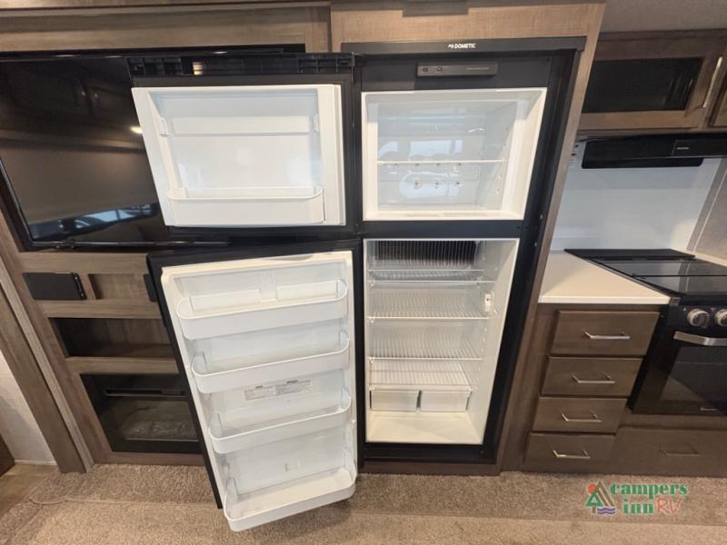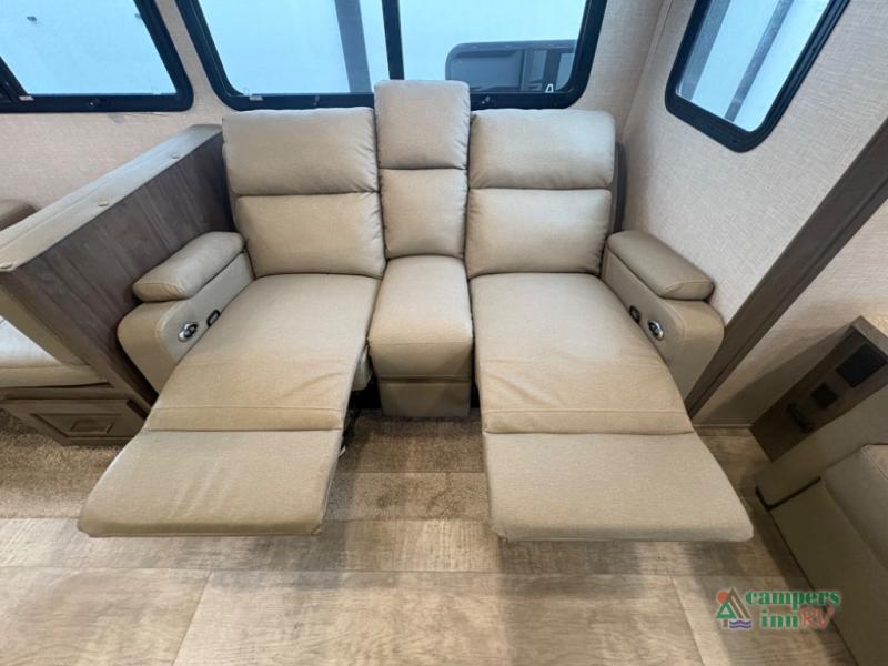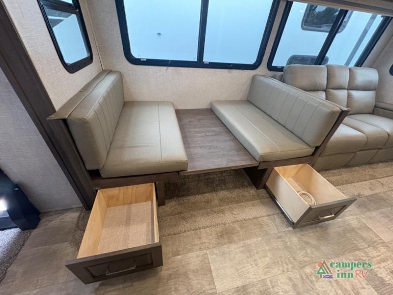 If you enjoy entertaining friends while camping, this trailer offers seating for nine in the combined living and kitchen area on the hide-a-bed sofa, the theater seats and the booth dinette. Everyone can visit, watch the LED TV and enjoy the fireplace all while the cook is preparing snacks in the kitchen with full amenities. The snacks and drinks can be served from the center island, and everyone can enjoy all the views out of the windows along the rear and door side wall. The full bathroom has two entries for convenience, and the front bedroom offers a queen bed slide for more floor space or choose a king option, plus plenty of storage. And the two 11' awnings offer an outdoor living area after you add your camping chairs.