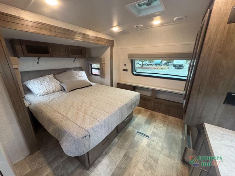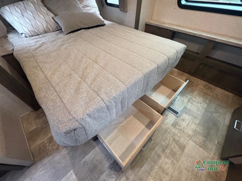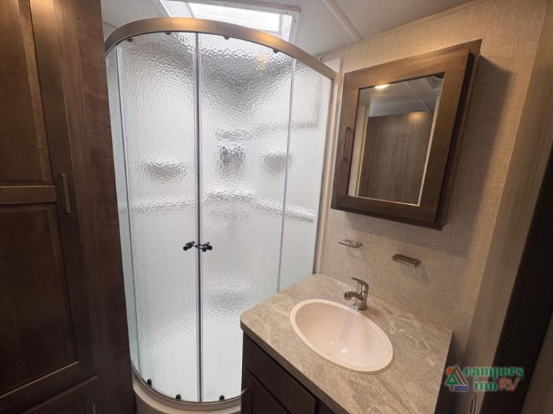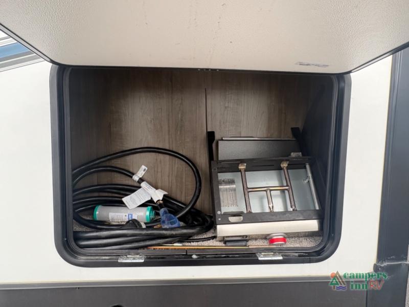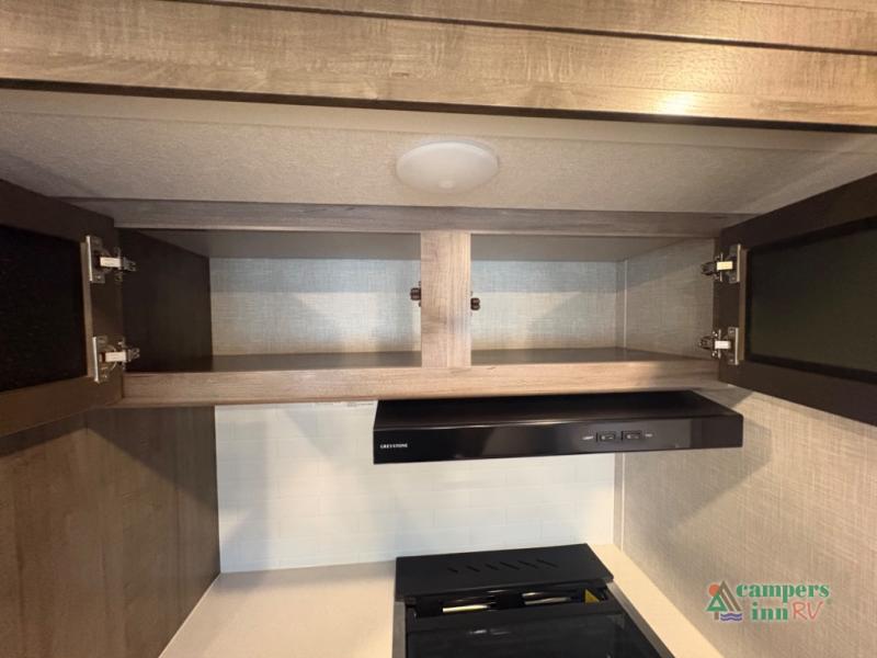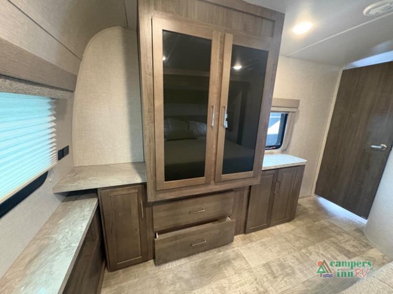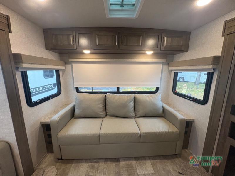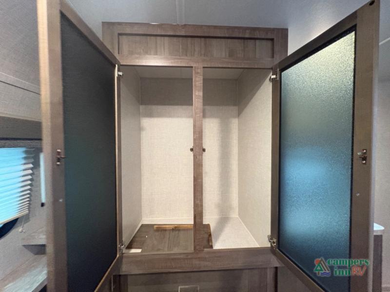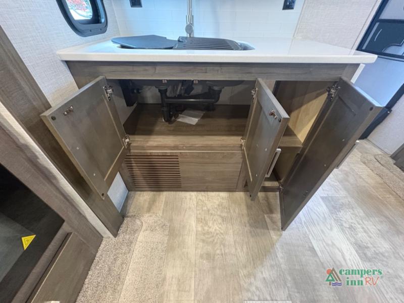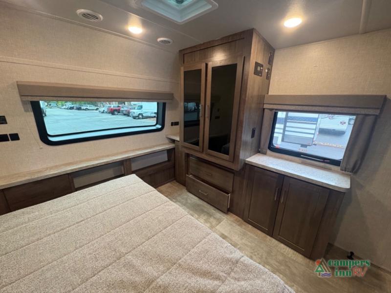 If you enjoy entertaining friends while camping, this trailer offers seating for nine in the combined living and kitchen area on the hide-a-bed sofa, the theater seats and the booth dinette. Everyone can visit, watch the LED TV and enjoy the fireplace all while the cook is preparing snacks in the kitchen with full amenities. The snacks and drinks can be served from the center island, and everyone can enjoy all the views out of the windows along the rear and door side wall. The full bathroom has two entries for convenience, and the front bedroom offers a queen bed slide for more floor space or choose a king option, plus plenty of storage. And the two 11' awnings offer an outdoor living area after you add your camping chairs.