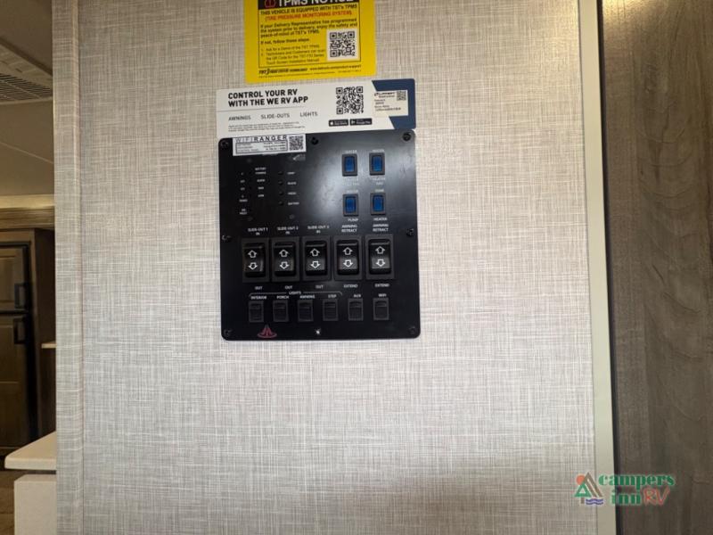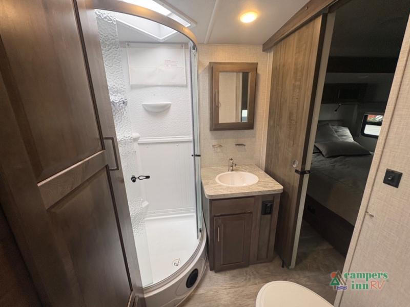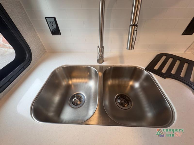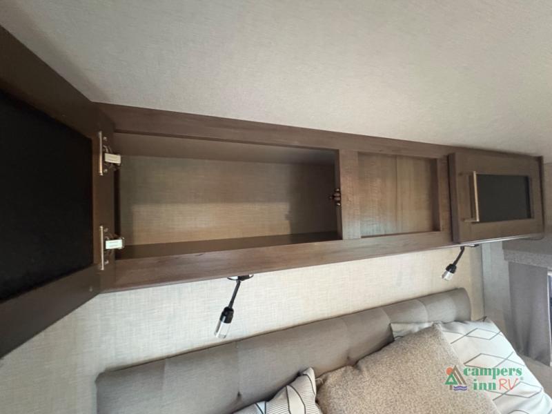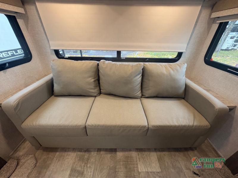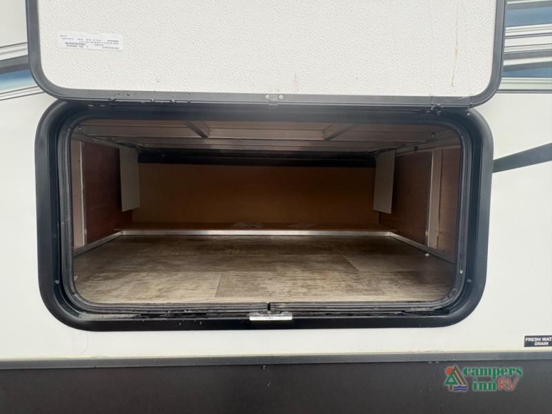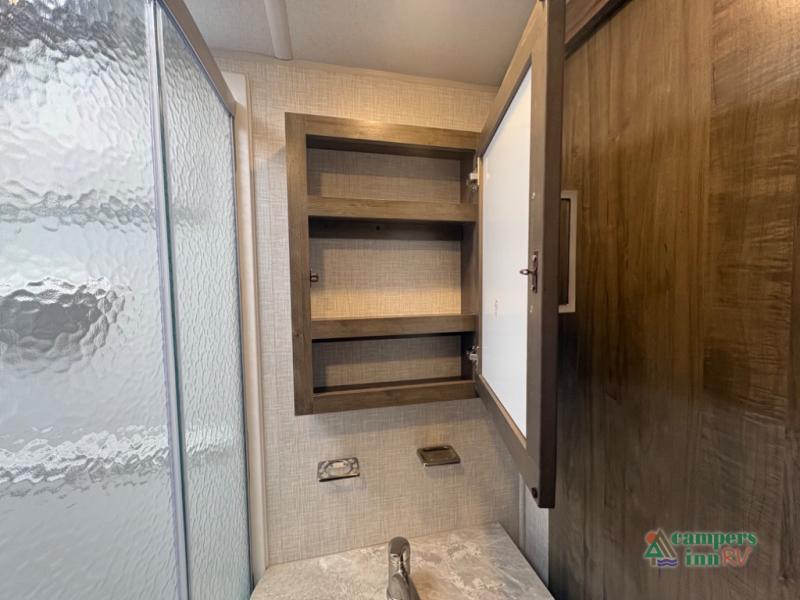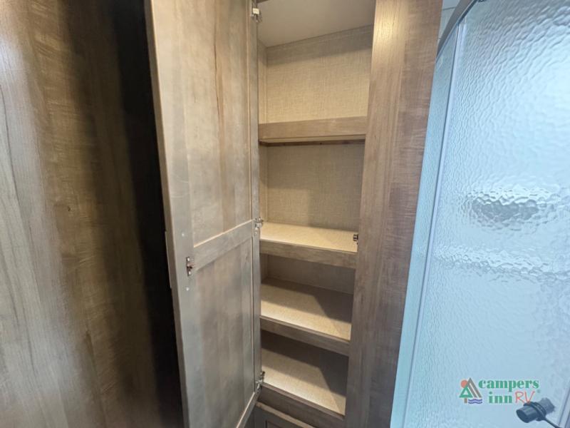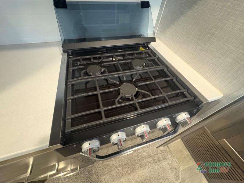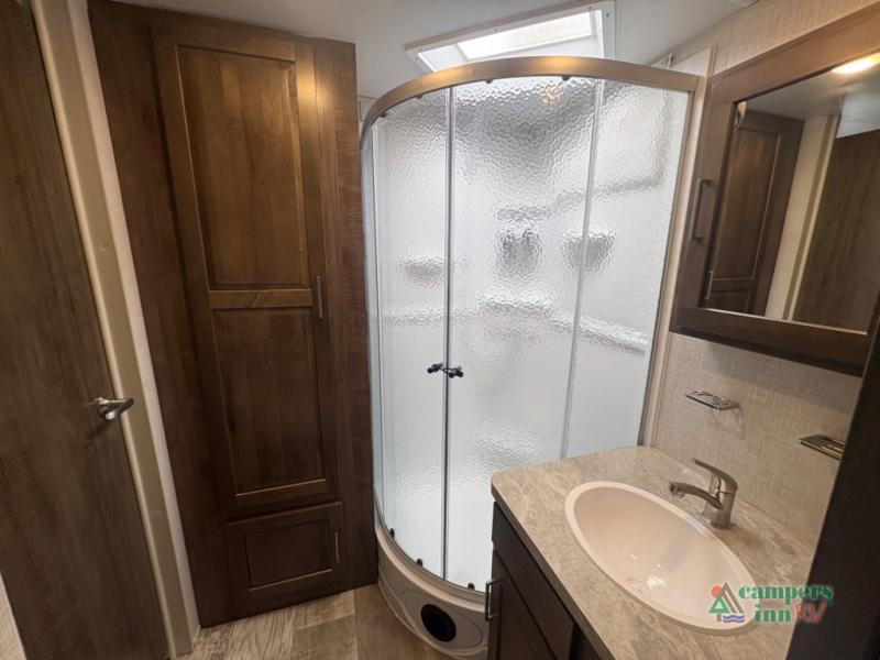 If you enjoy entertaining friends while camping, this trailer offers seating for nine in the combined living and kitchen area on the hide-a-bed sofa, the theater seats and the booth dinette. Everyone can visit, watch the LED TV and enjoy the fireplace all while the cook is preparing snacks in the kitchen with full amenities. The snacks and drinks can be served from the center island, and everyone can enjoy all the views out of the windows along the rear and door side wall. The full bathroom has two entries for convenience, and the front bedroom offers a queen bed slide for more floor space or choose a king option, plus plenty of storage. And the two 11' awnings offer an outdoor living area after you add your camping chairs.