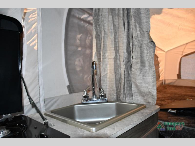 Because it’s the perfect step up from tent camping. You’ll still get the fresh-air feel of sleeping under canvas, but with the bonus of a furnace, hot water, comfy beds, and a kitchen. It’s lightweight and towable by many SUVs, making it a great choice for families or couples who want to keep camping flexible without sacrificing comfort.